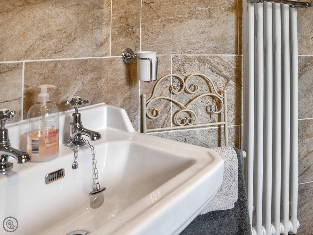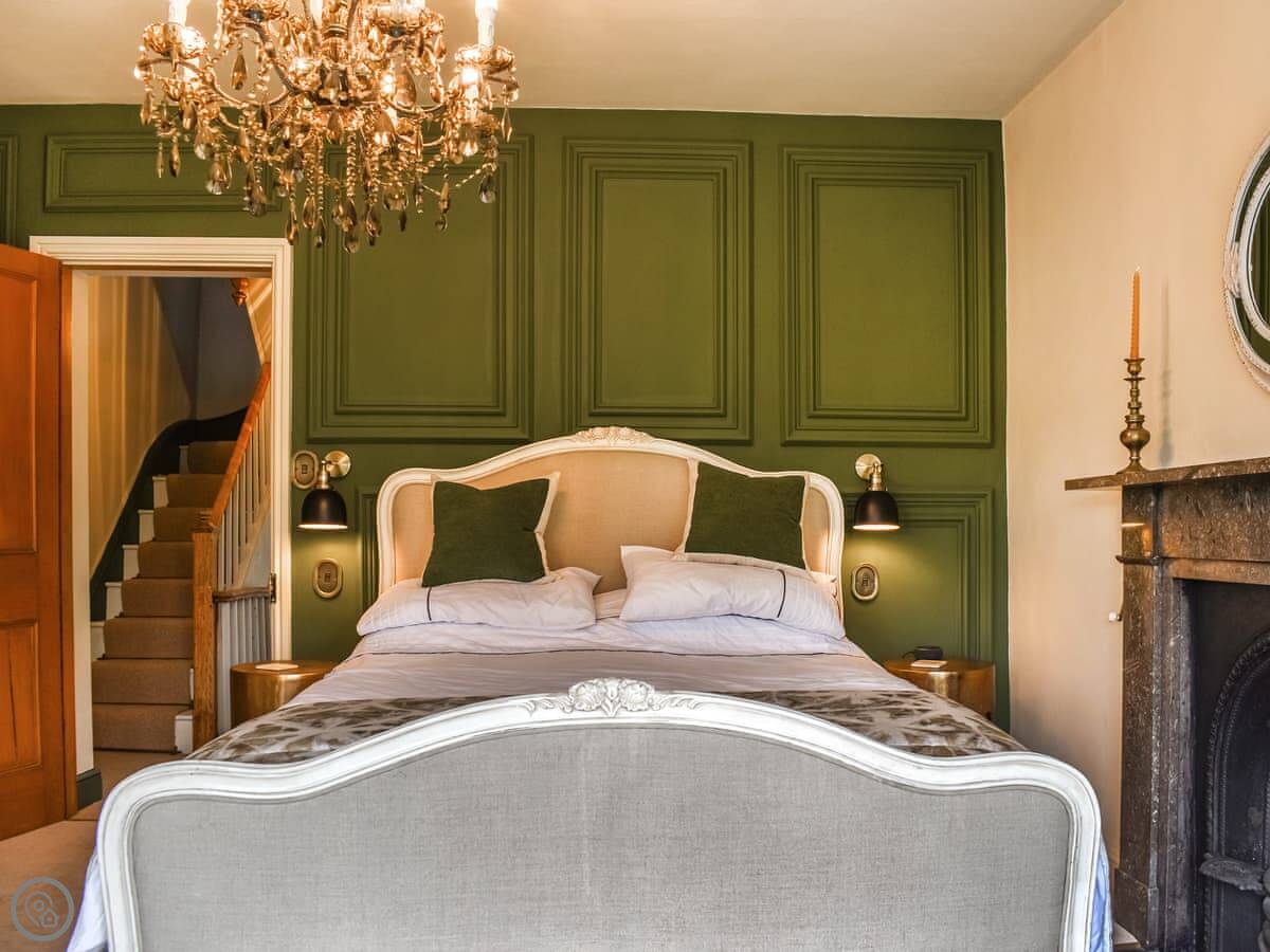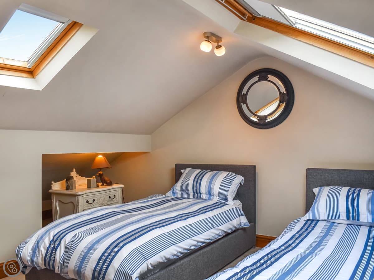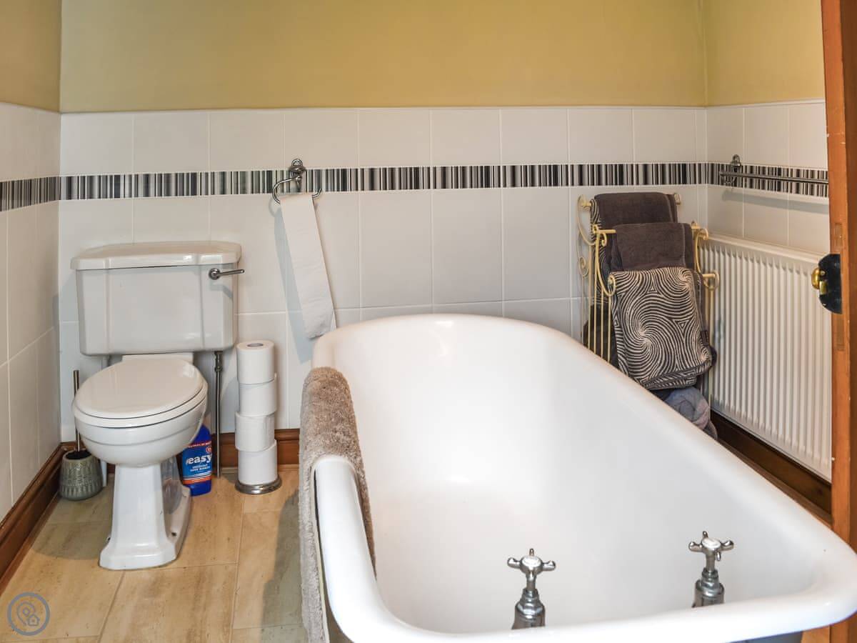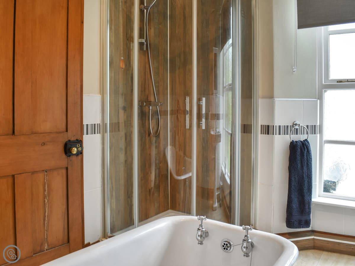 It sleeps six. There are three bedrooms: a large king-size room at the front on the first floor, a double room with a small ensuite shower on that same floor, and a twin room up on the second floor. That top room has sloping ceilings from the eaves, so mind your head if you're tall. There's one main bathroom on the first floor with a roll-top bath and a separate shower cubicle.