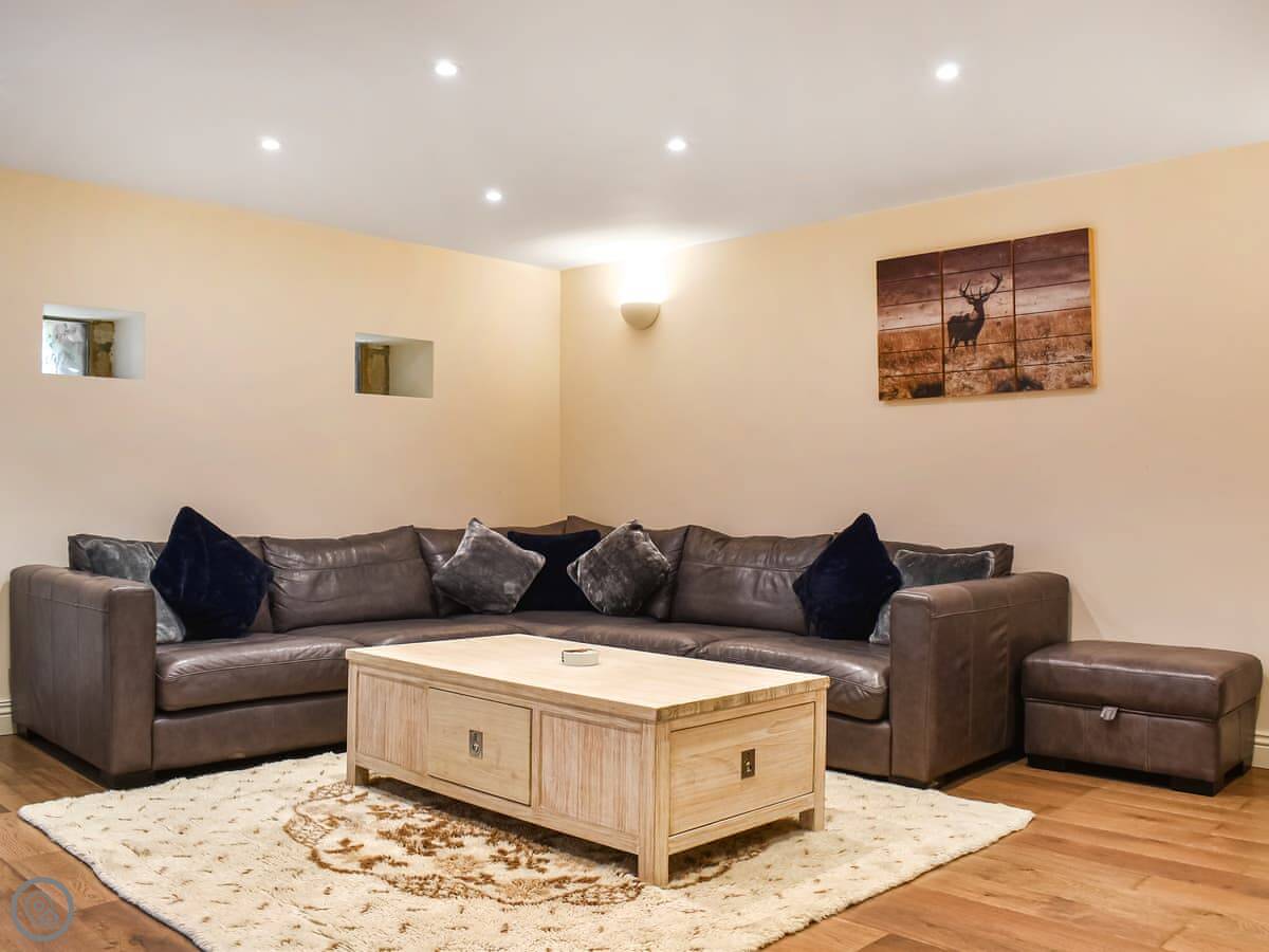 Inside, the kitchen has a big farmhouse table. The lounge has a large corner sofa facing the TV. The stairs are standard cottage stairs. They’re fine, but they turn a corner and are a bit steep in parts.