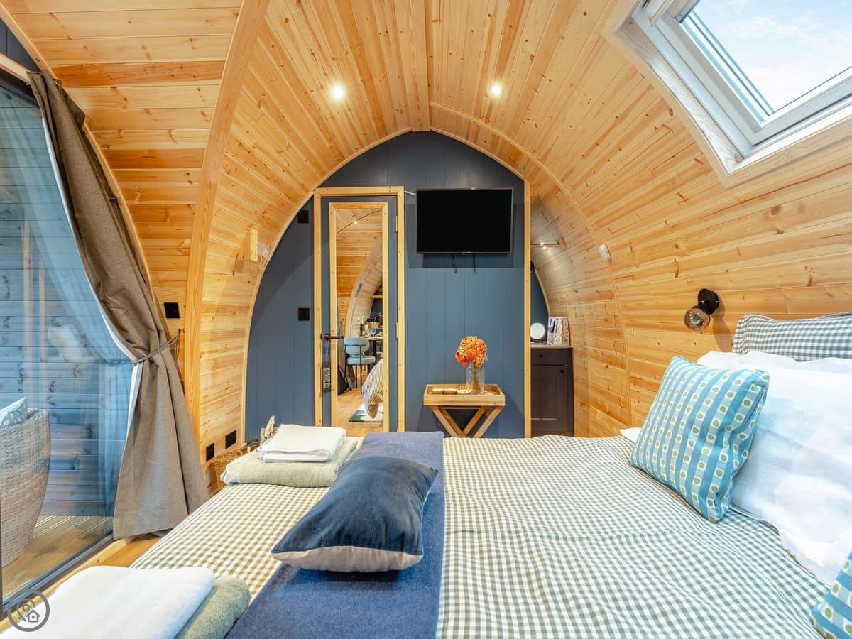 It's for two people. One room with a kingsize bed and an open plan living area. It's got a shower, a kitchen with a dishwasher, and underfloor heating. It's a 5 Star place, so it's well kitted out and new.