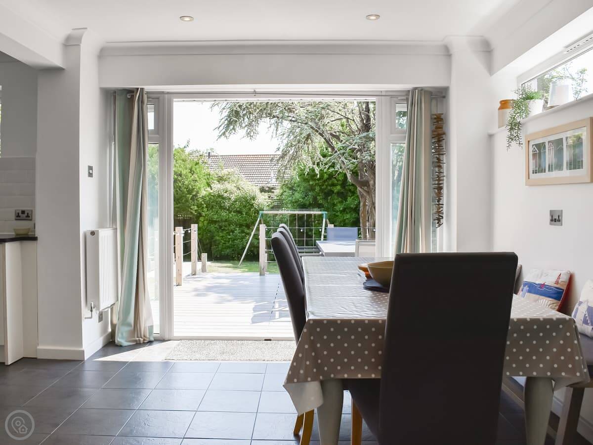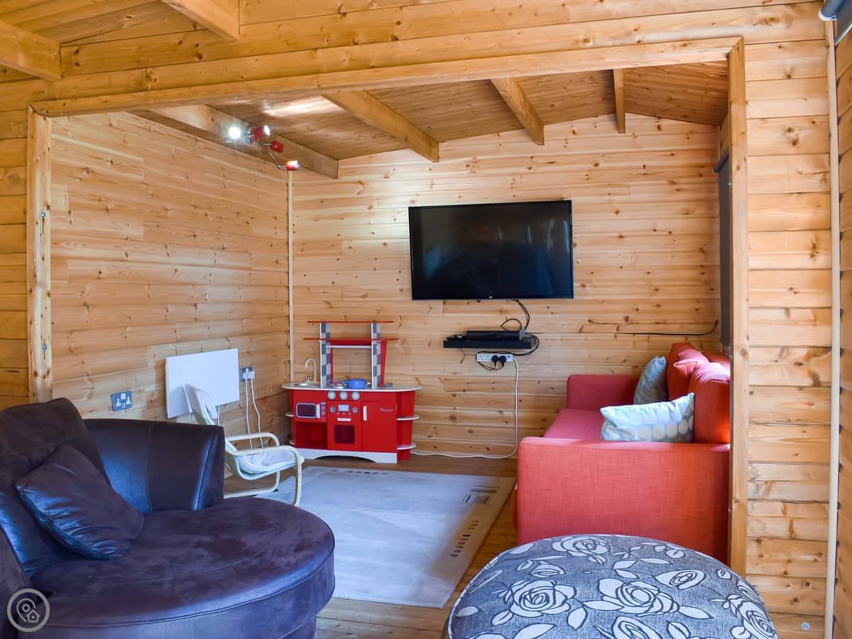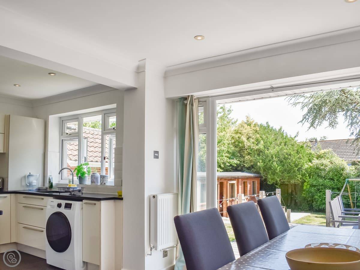 The living room and kitchen are separate. The kitchen doors open out to a big garden. It's fully enclosed, which is good if you have kids or dogs. We allow two pets. There's a summer house out there with a sofa and a TV. It's a decent extra space.