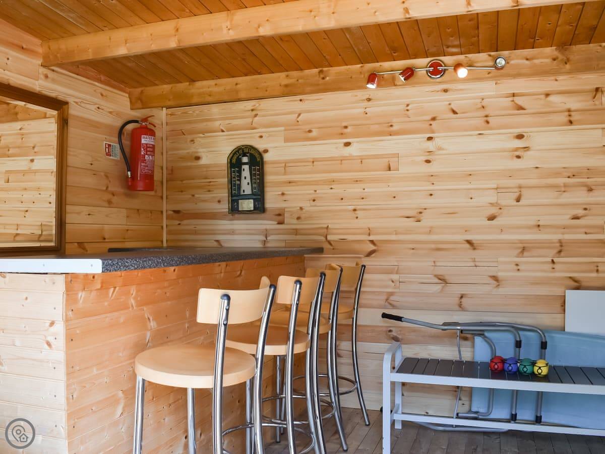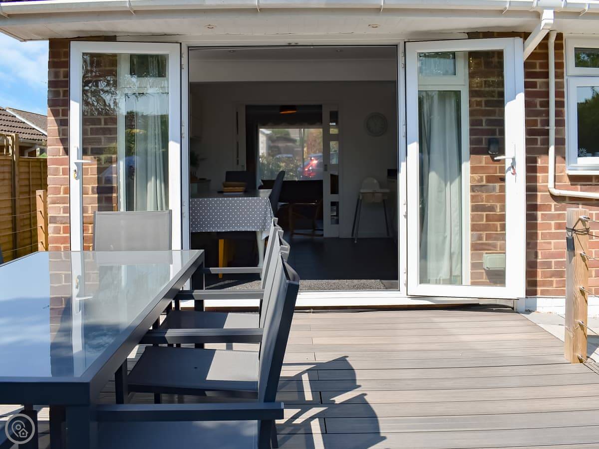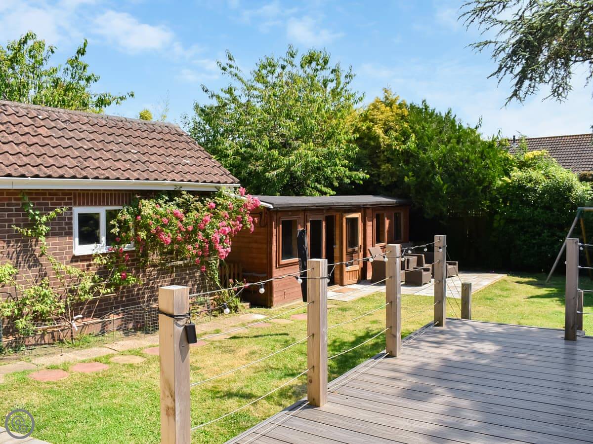 The living room and kitchen are separate. The kitchen doors open out to a big garden. It's fully enclosed, which is good if you have kids or dogs. We allow two pets. There's a summer house out there with a sofa and a TV. It's a decent extra space.