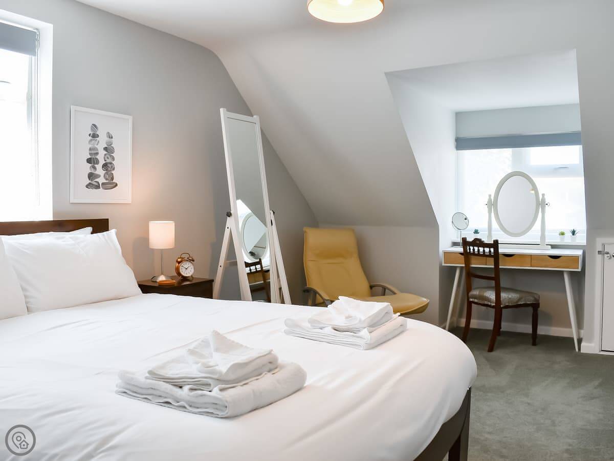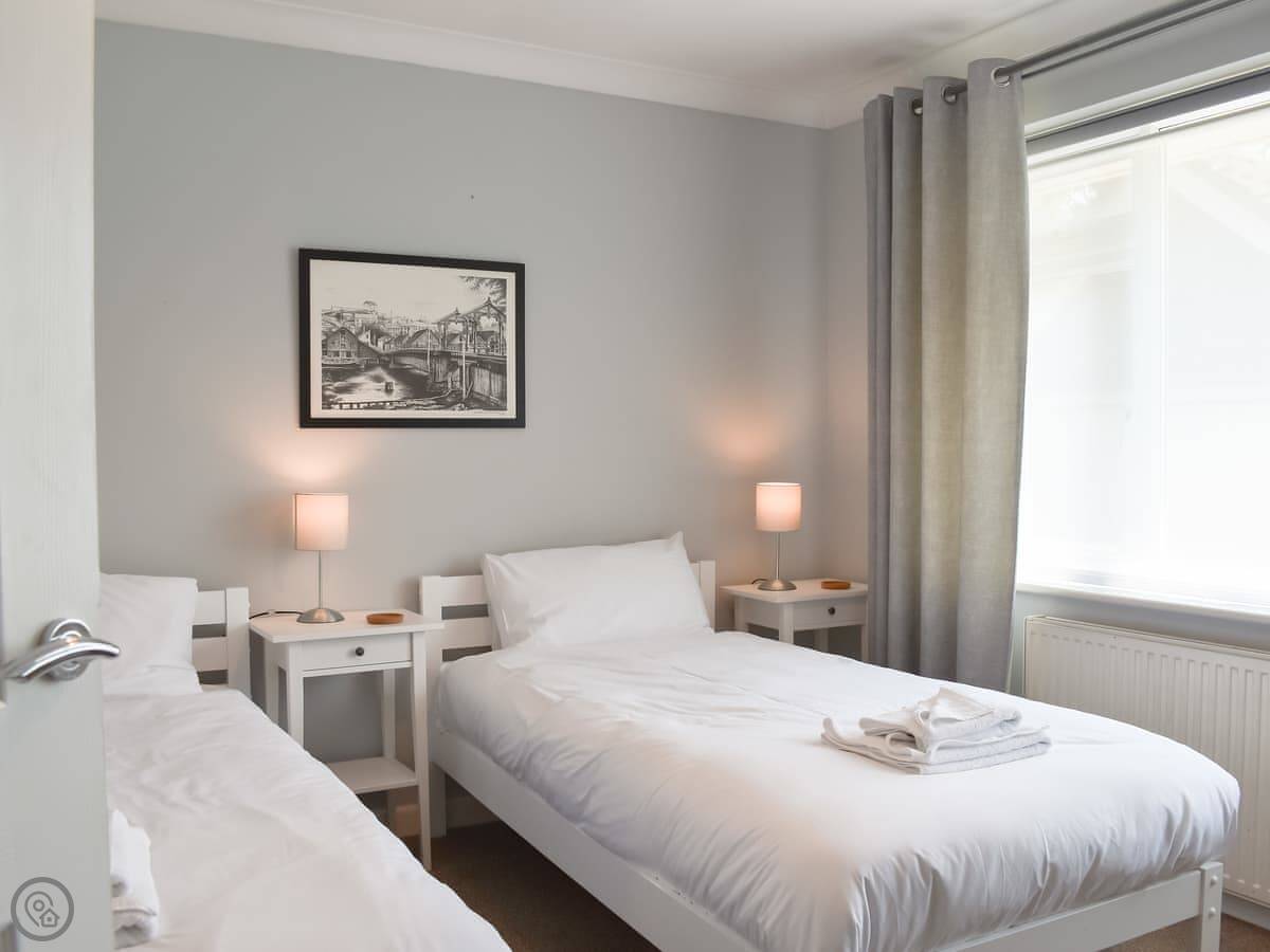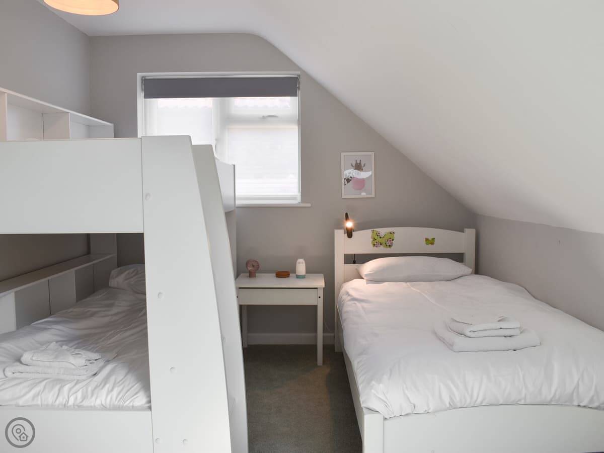 Bedrooms are split over the ground floor and first floor. Two doubles and a twin downstairs, with a bathroom. Upstairs there's a kingsize and a kids' room with bunks and a single. There's a shower room up there too. Everything has bedding and towels.