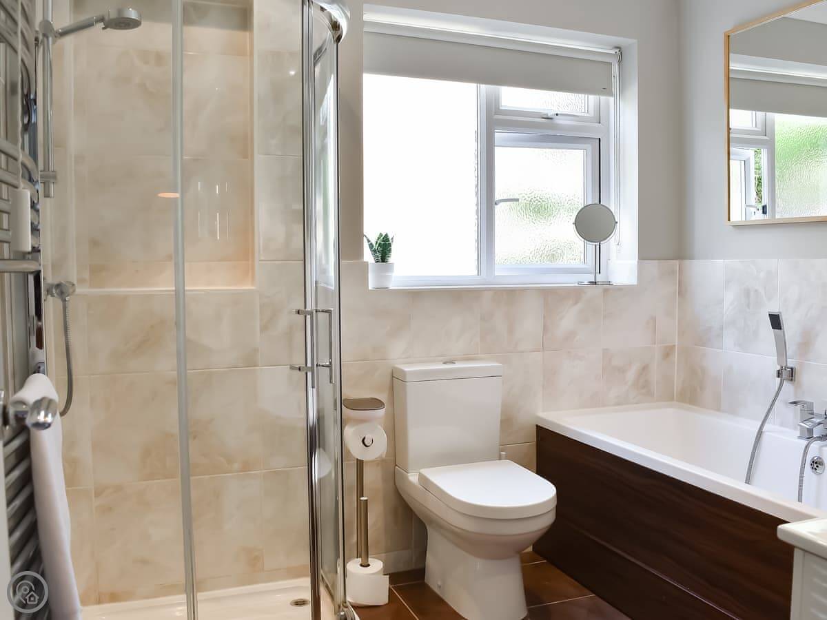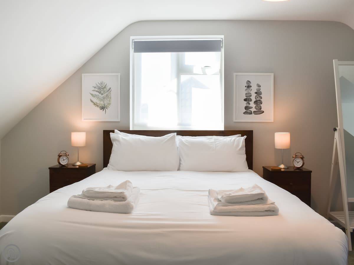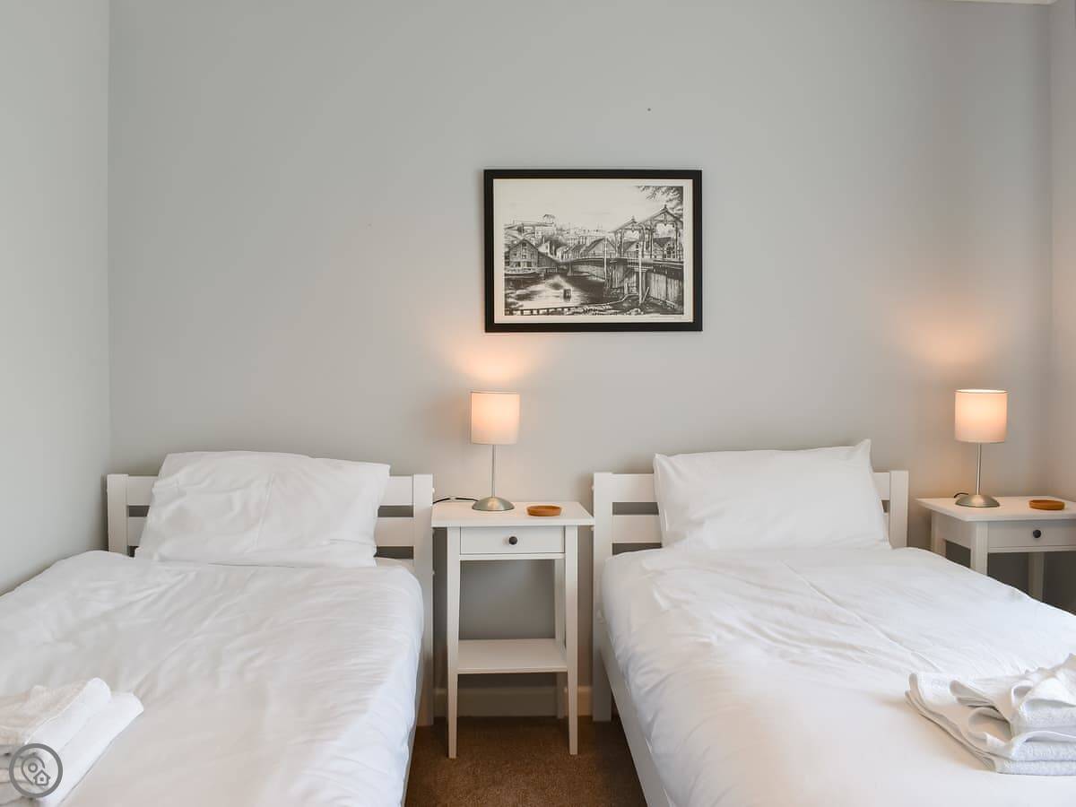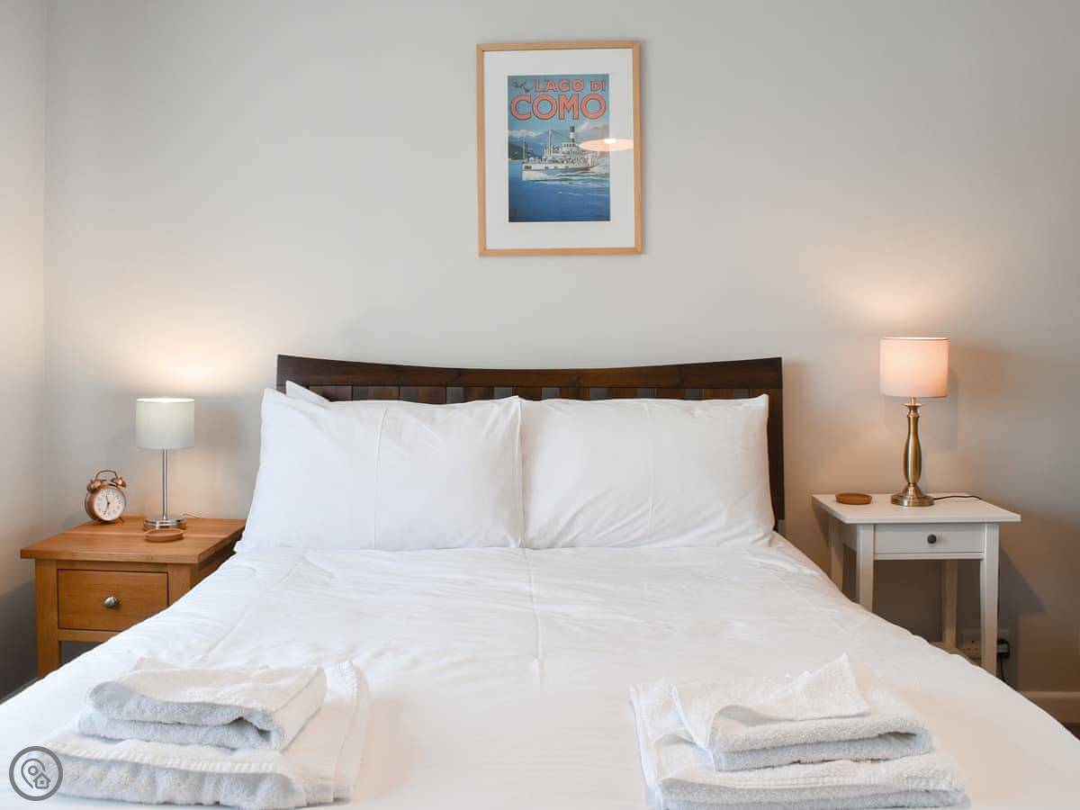 Bedrooms are split over the ground floor and first floor. Two doubles and a twin downstairs, with a bathroom. Upstairs there's a kingsize and a kids' room with bunks and a single. There's a shower room up there too. Everything has bedding and towels.