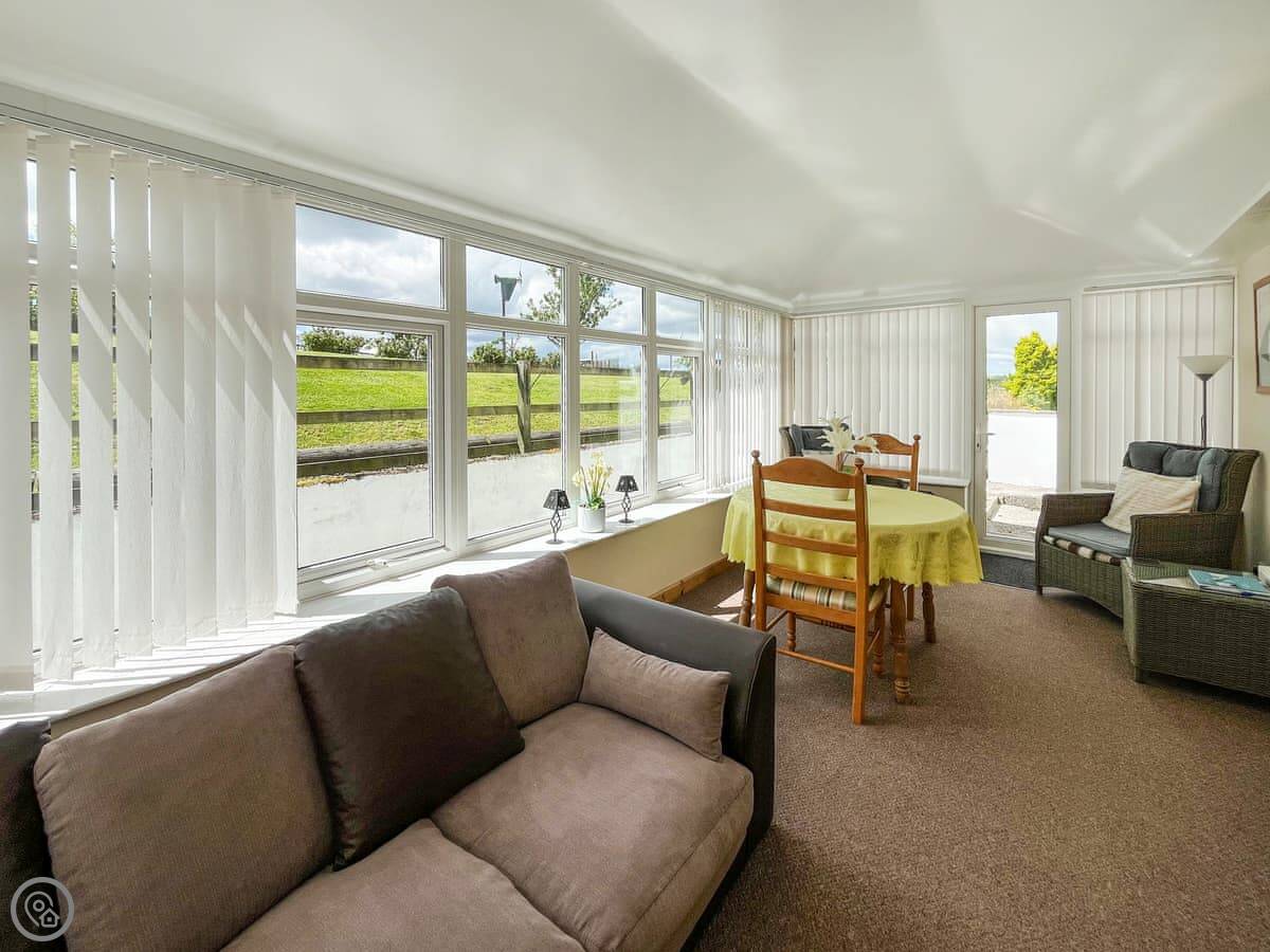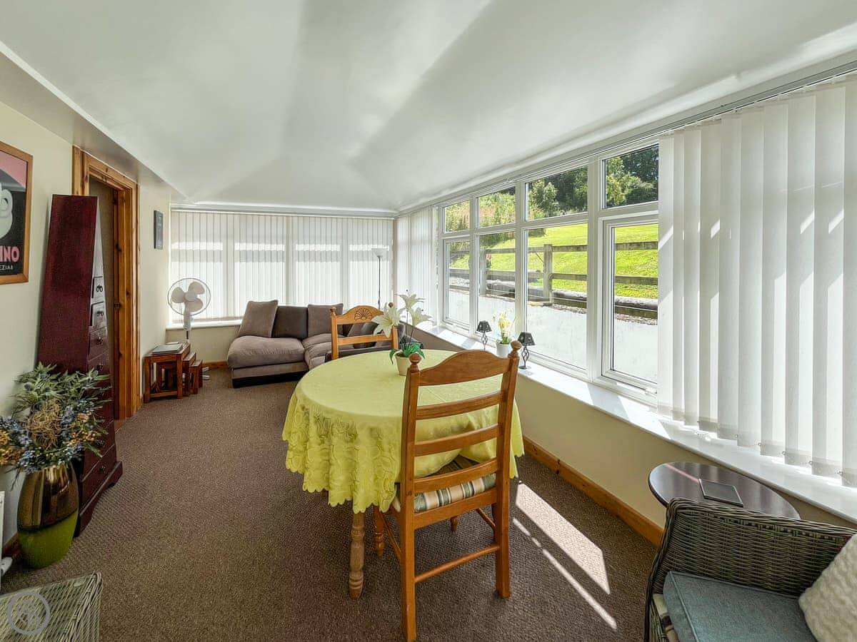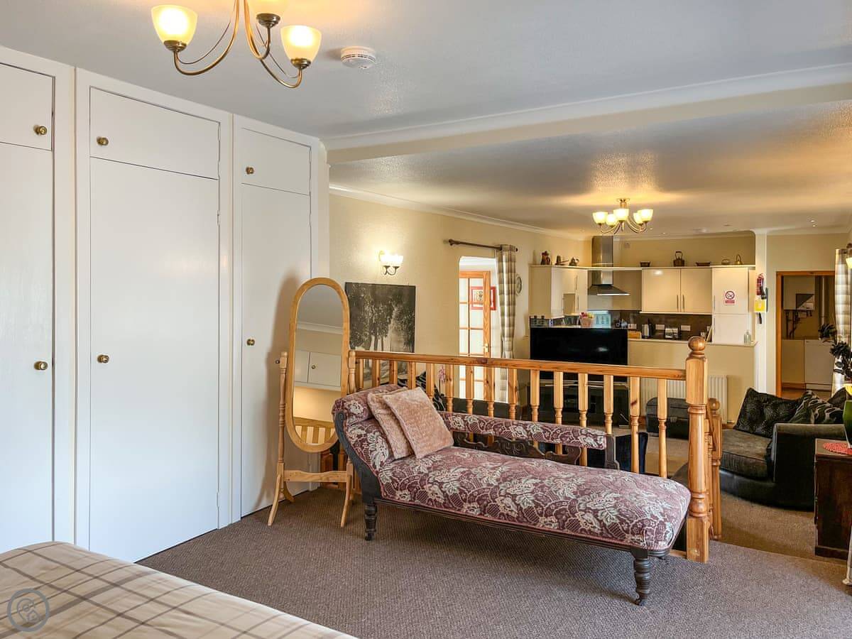 The layout is open plan with a living space and the bed at one end. It's all on one level, so no stairs. There's a conservatory off the main room which is nice and light for having meals. The bathroom has both a bath and a separate shower cubicle.