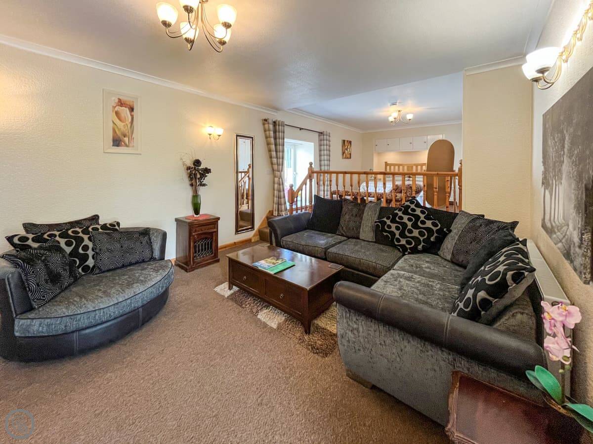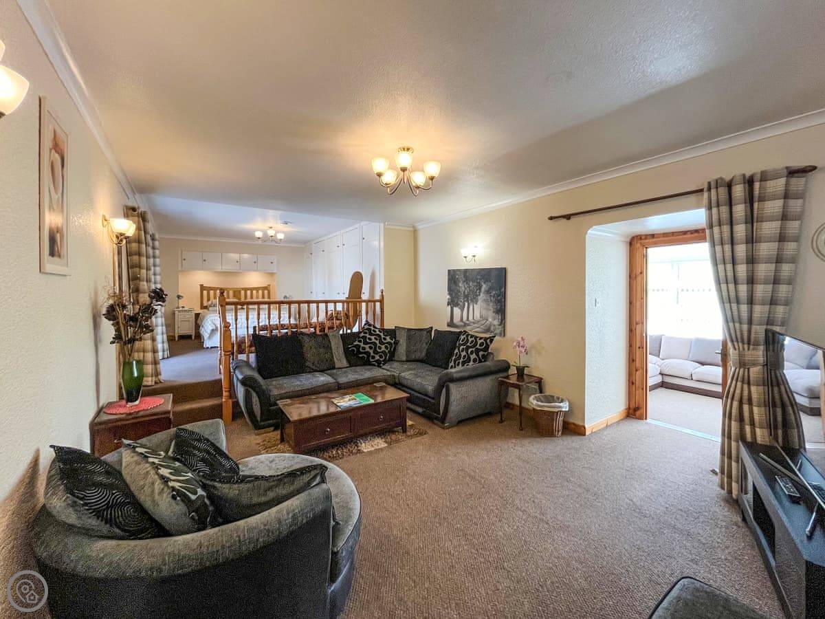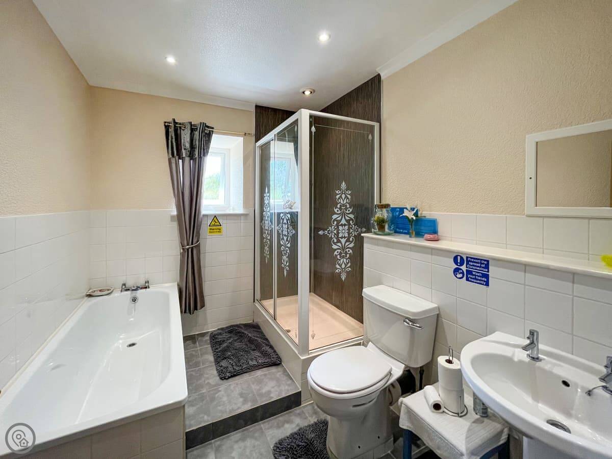 The layout is open plan with a living space and the bed at one end. It's all on one level, so no stairs. There's a conservatory off the main room which is nice and light for having meals. The bathroom has both a bath and a separate shower cubicle.