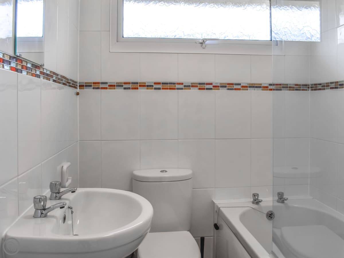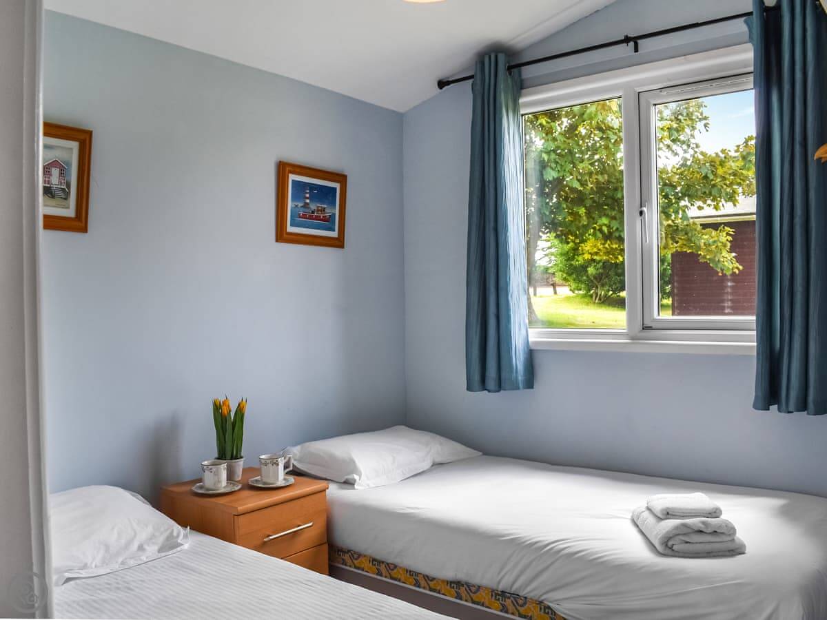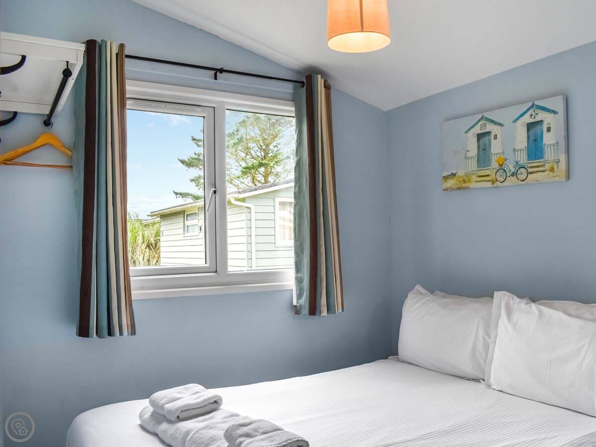 Trevose Head is on a holiday park near St Merryn in Cornwall. It sleeps four, in two bedrooms. One room has a bunk with a double bed on the bottom. The other is a double room. There's one bathroom with a bath and an overhead shower.