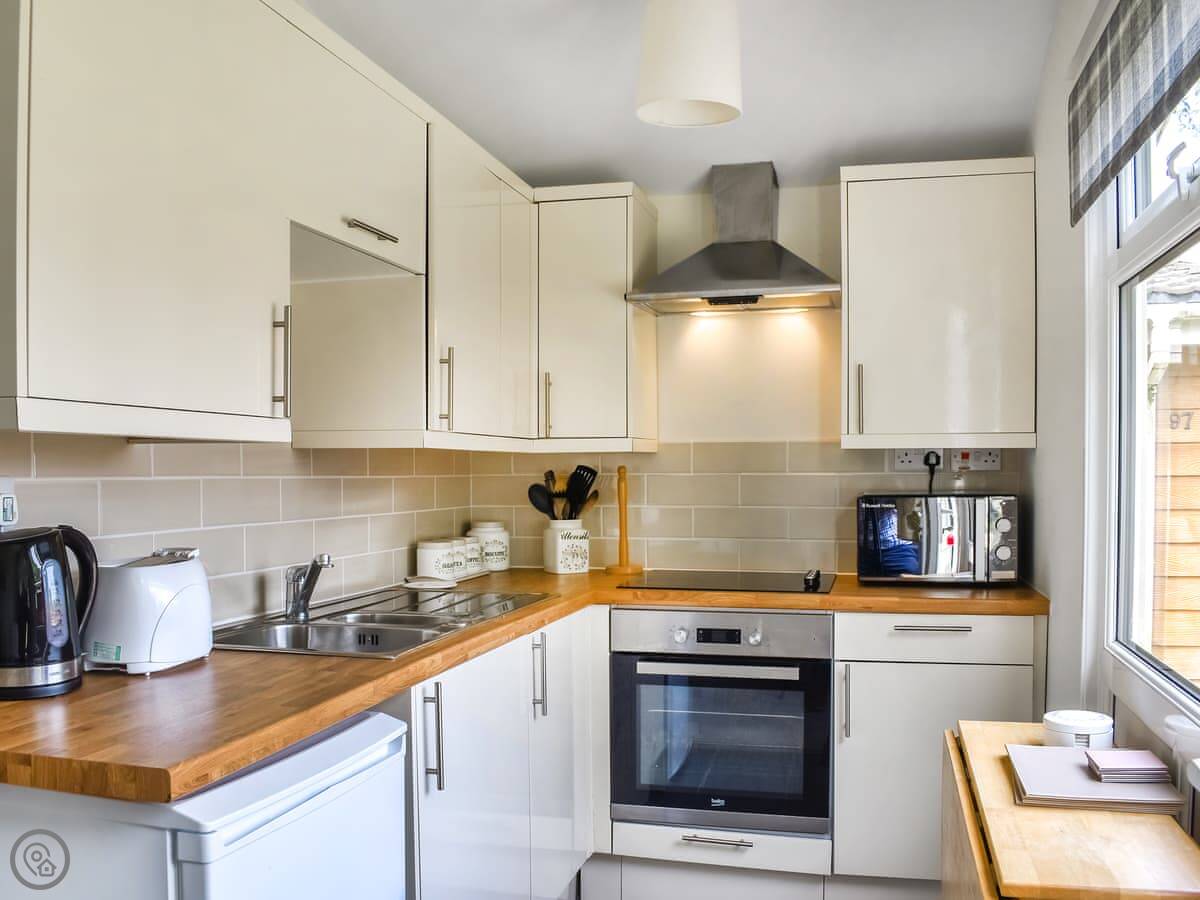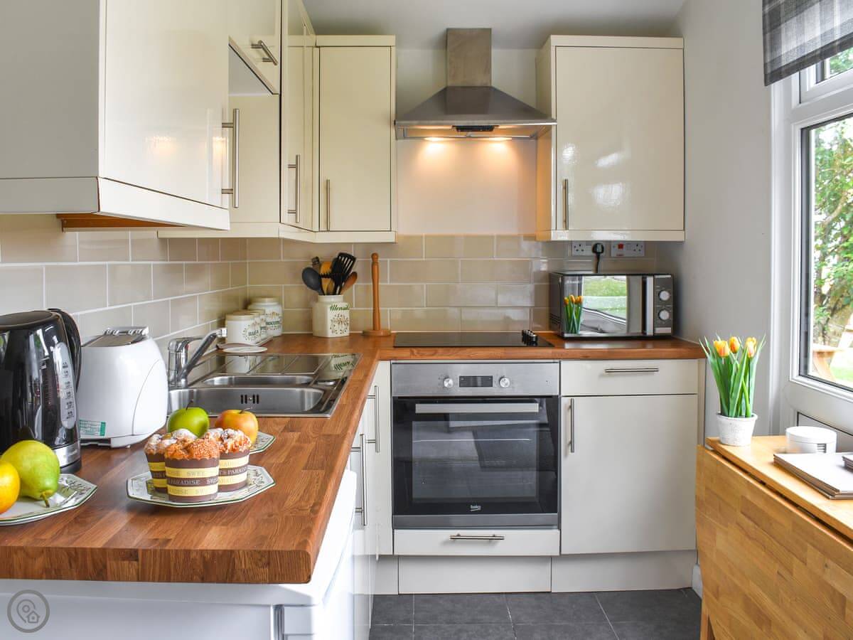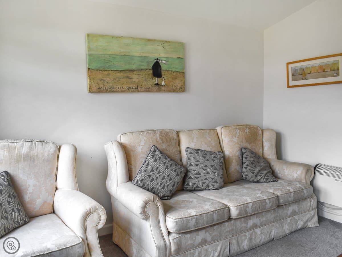 Trevose Head is on a holiday park near St Merryn in Cornwall. It sleeps four, in two bedrooms. One room has a bunk with a double bed on the bottom. The other is a double room. There's one bathroom with a bath and an overhead shower.