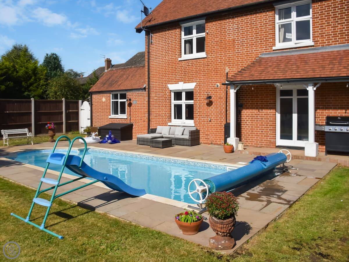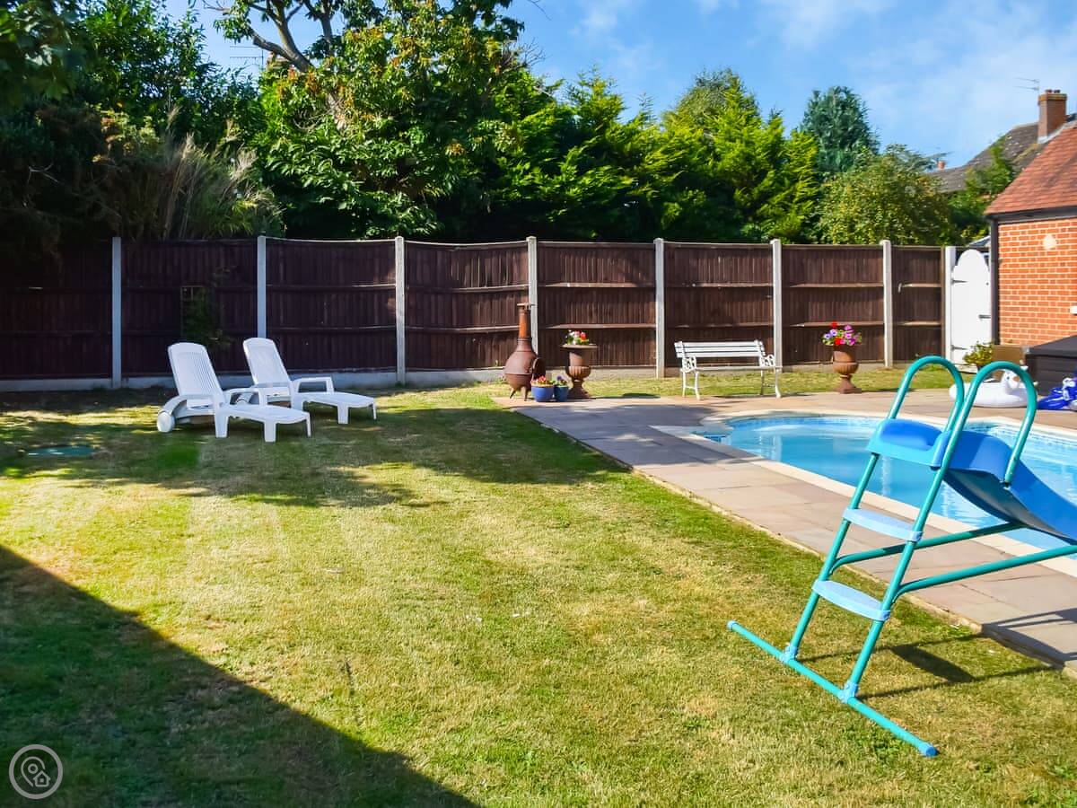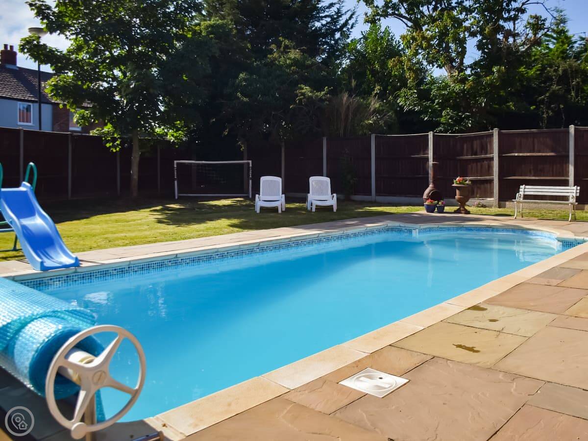 The main thing outside is the pool. It's heated, and it's open in the warmer months. There's a seating area next to it. There's also a games room in the garden, which is useful if the weather turns.