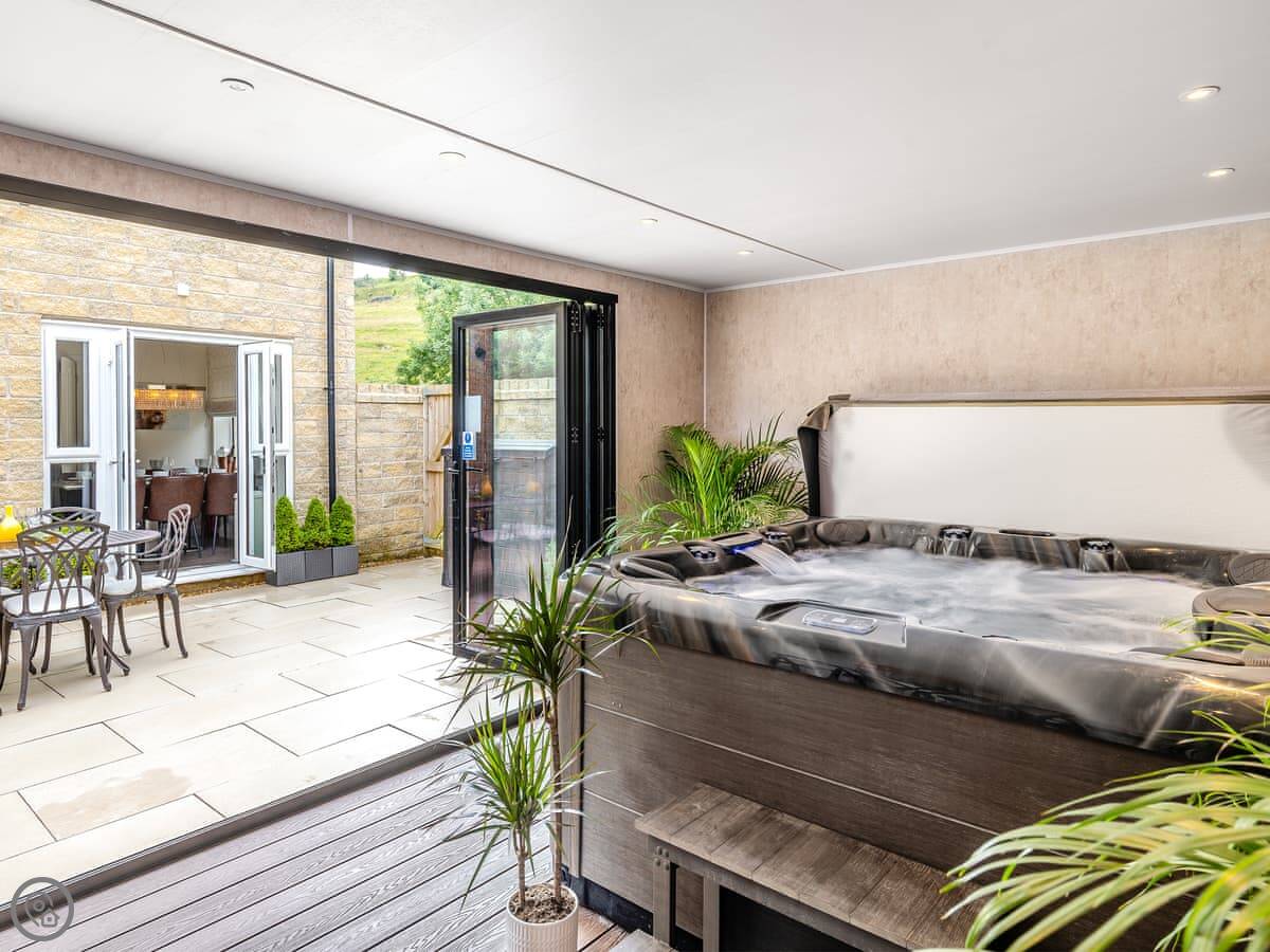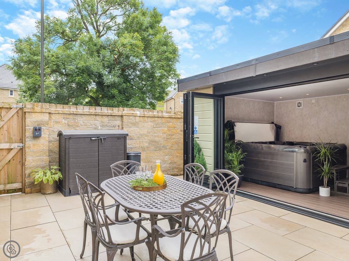 The garden is enclosed. There's a patio with furniture and a covered hot tub.