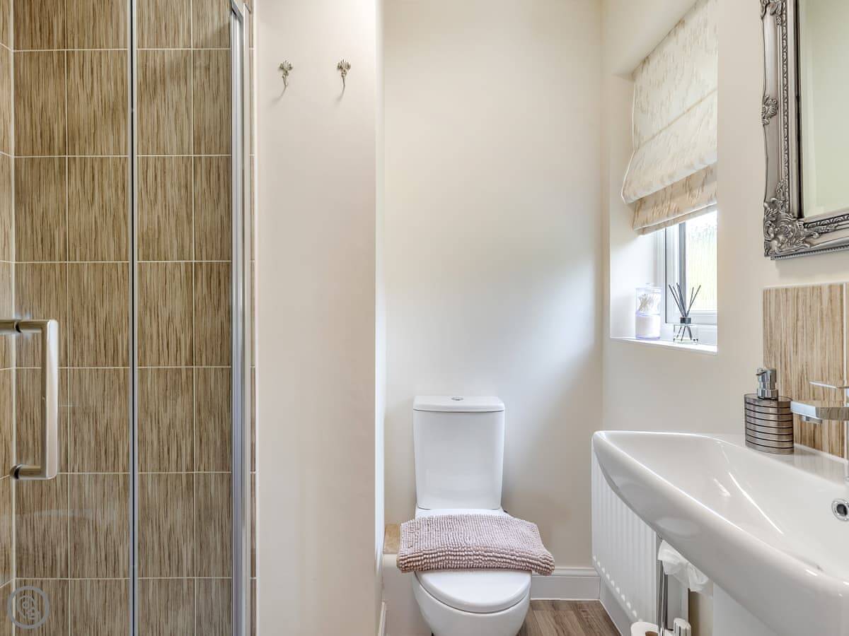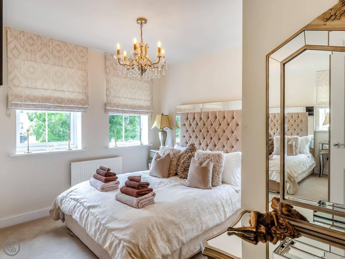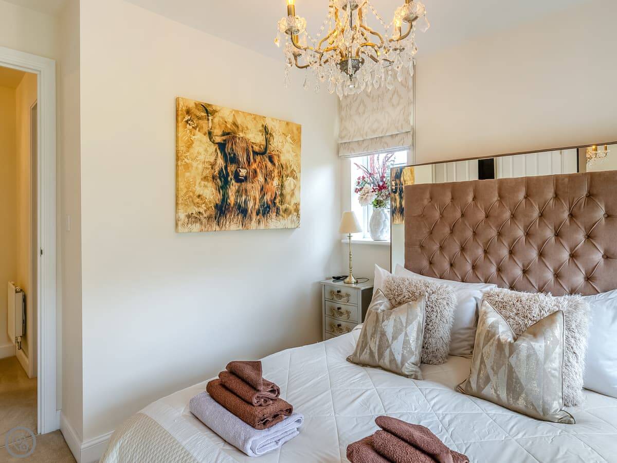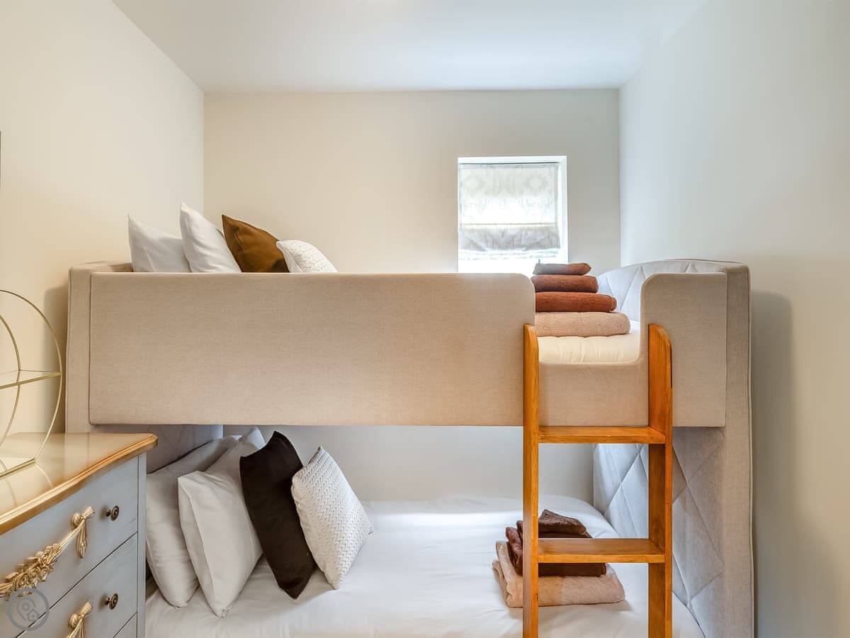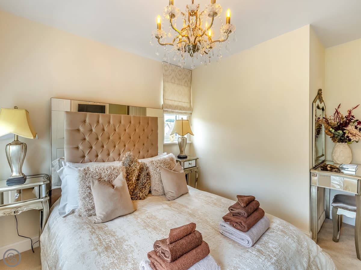 It sleeps six. Three bedrooms. Two have king-size beds, one has bunk beds. There are two bathrooms, one is an en-suite shower room off the main bedroom. The other has a bath with a shower over it.