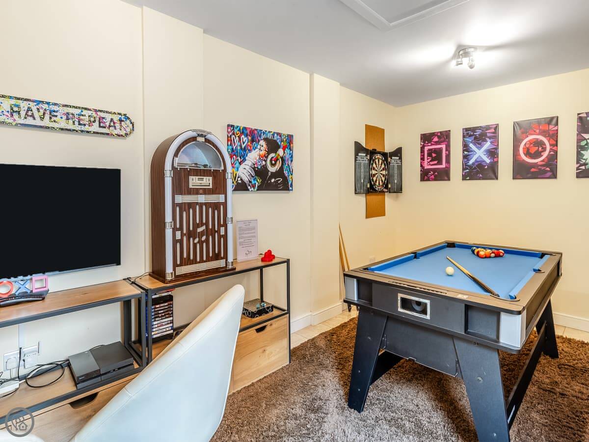You've got a kitchen with a dining area, and patio doors out to the garden. The living room is a good size with a TV. There's also a games room in the converted garage with a pool table and a dartboard.