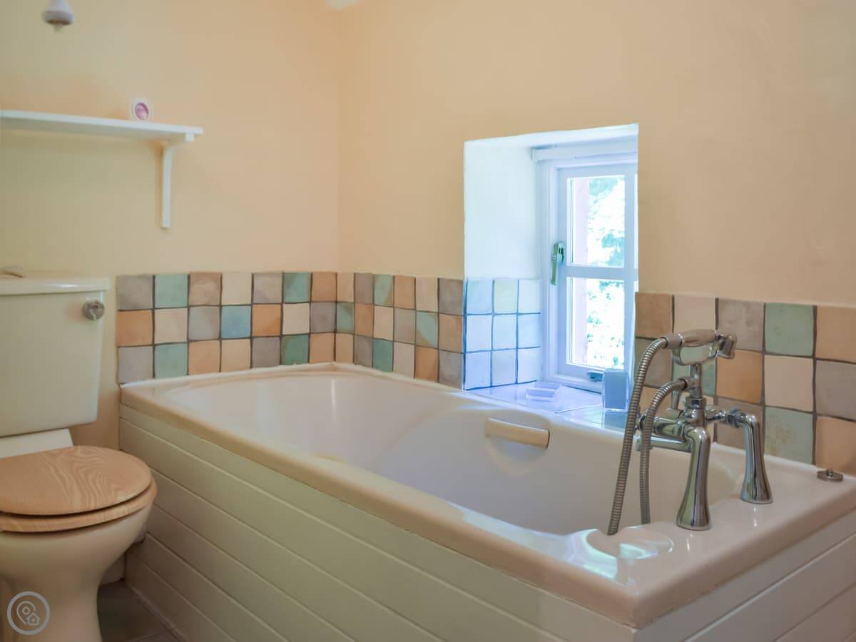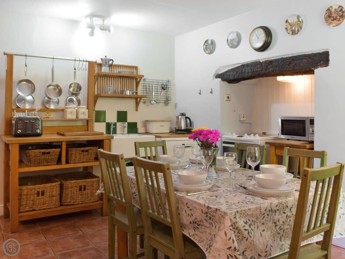 Inside, it's got an open fire and a kitchen diner that feels quite light. It's been done up to a decent standard. Two bathrooms, which helps with six people. The stairs are ordinary, not a spiral or anything.