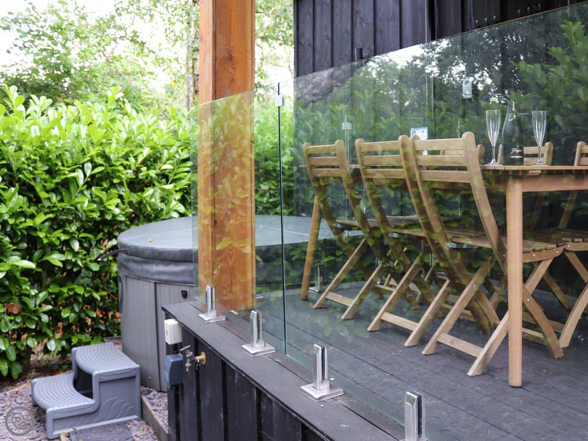 Outside, there's a patio area with a hot tub and garden furniture. Parking is on-site.