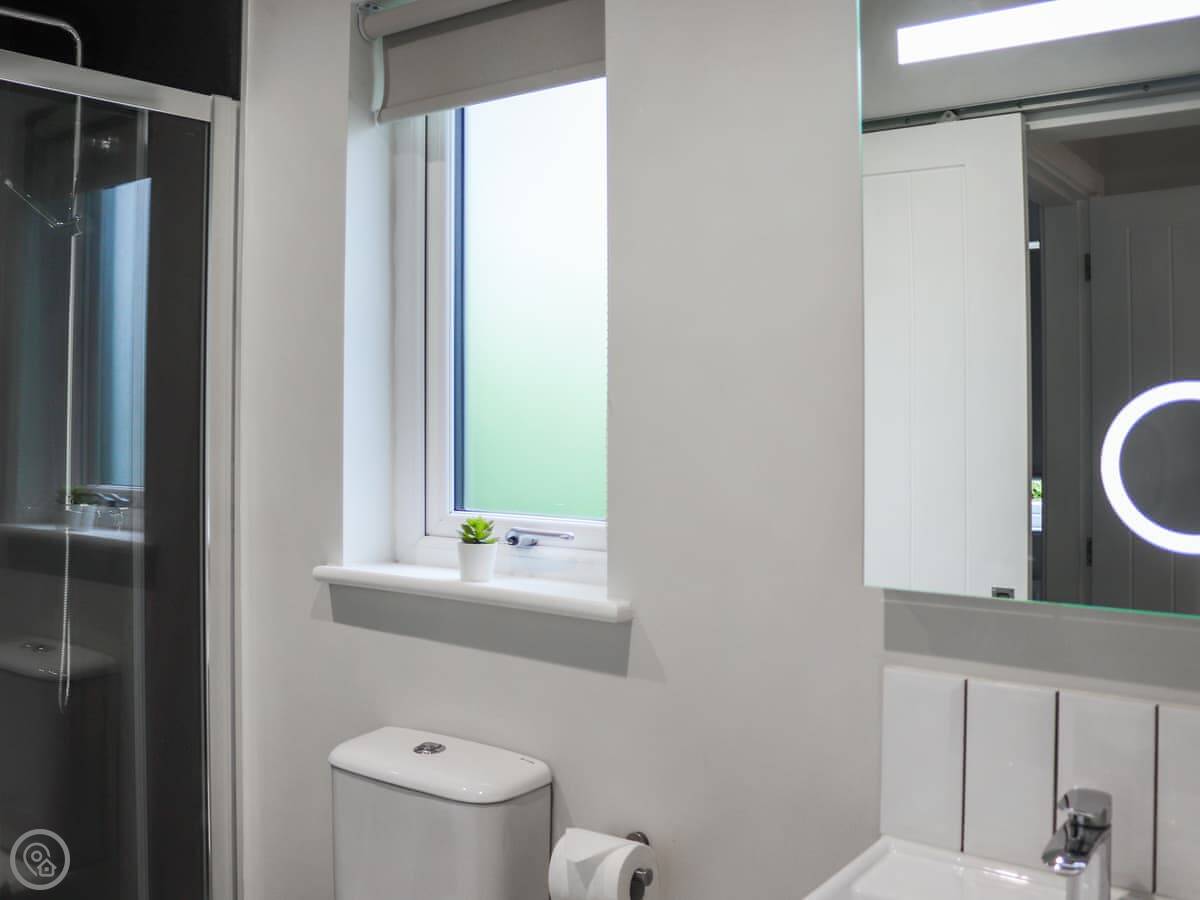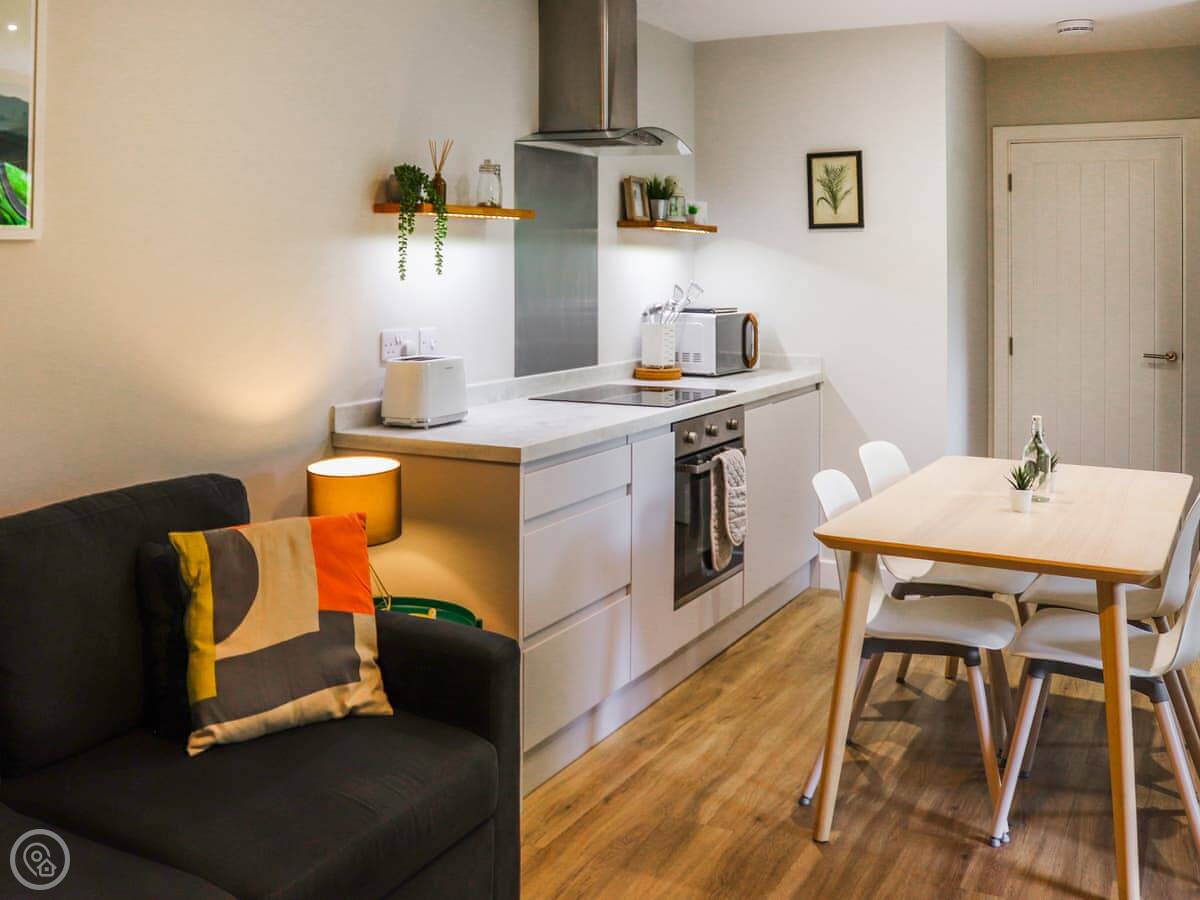 The layout is all open-plan downstairs. Kitchen, dining area, and living space in one room. There's a wood burner for cooler evenings. The shower room is modern.