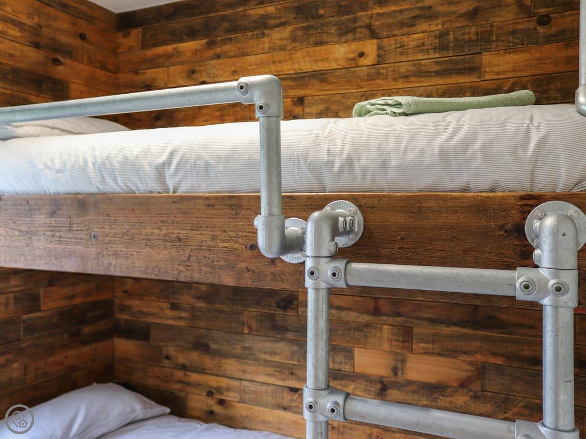 It sleeps five. Two bedrooms, one bathroom. One bedroom has a double bed, the other has a bunk bed. There's also a sofa bed in the living area. It's a 4 Star place, so it's comfortable and well-equipped.