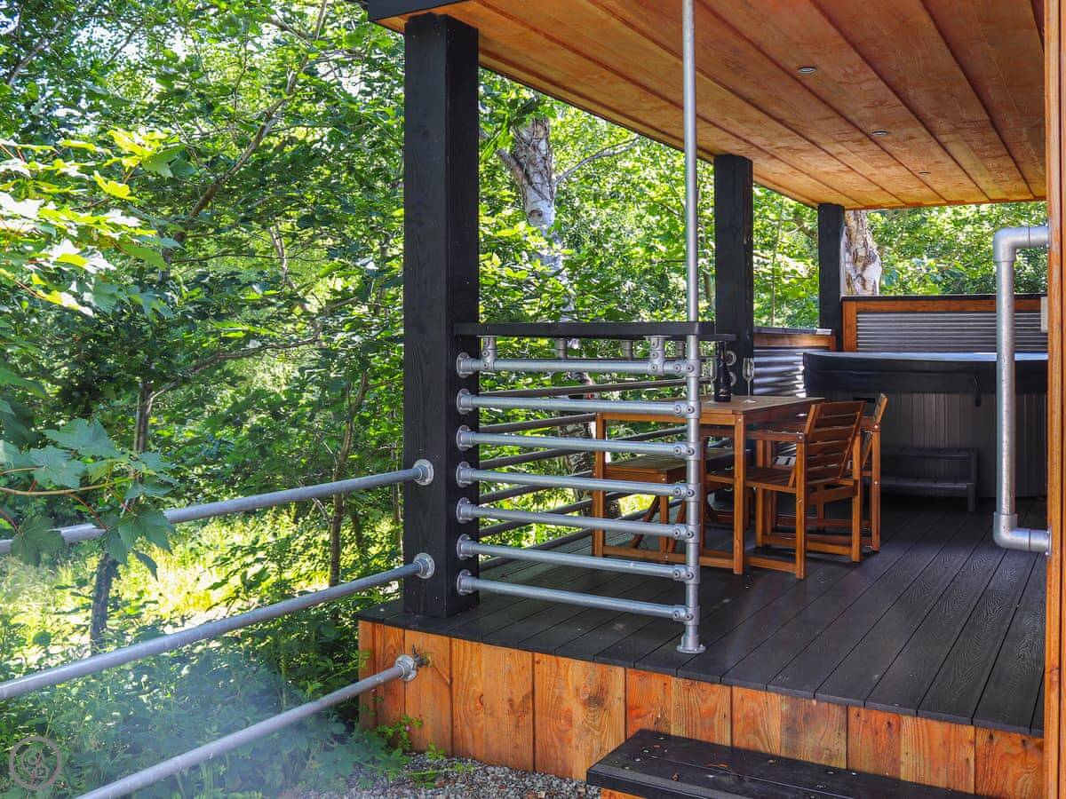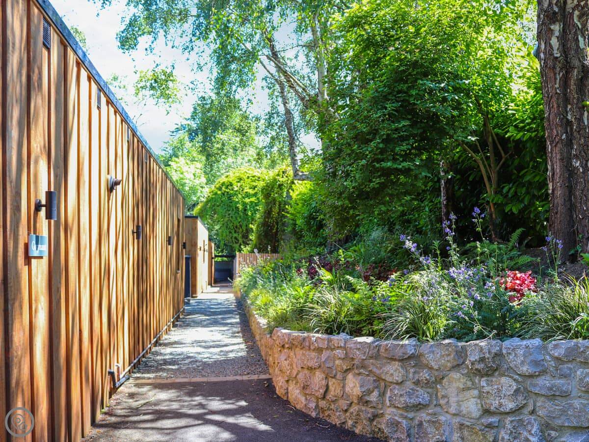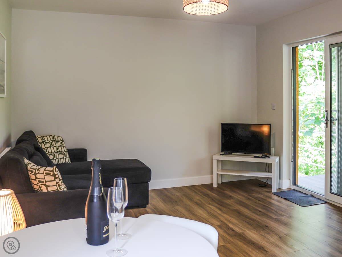 The main thing out the back is a decked area with a private hot tub. You look out onto a bit of greenery. It’s not a huge garden, but it’s yours.