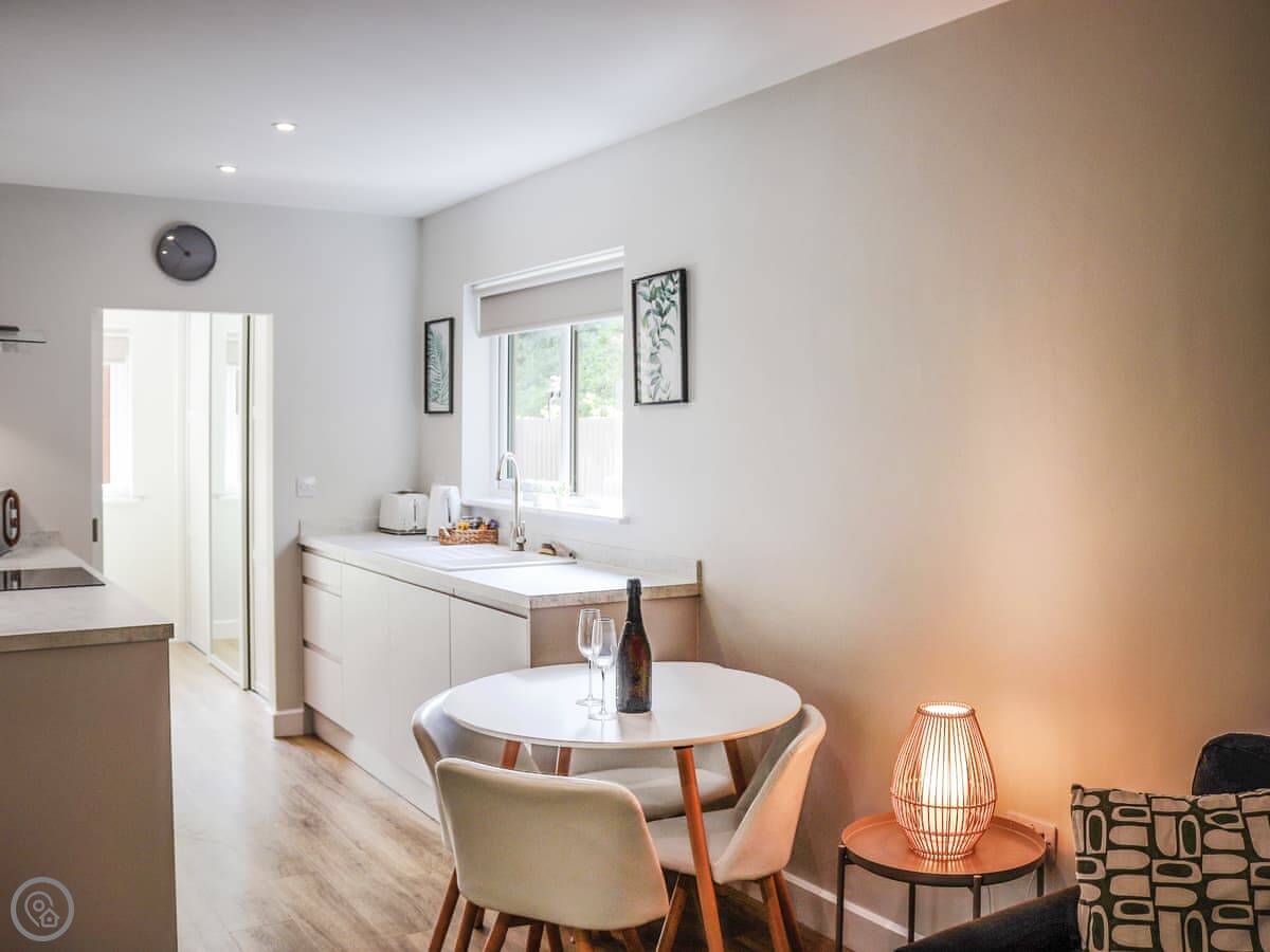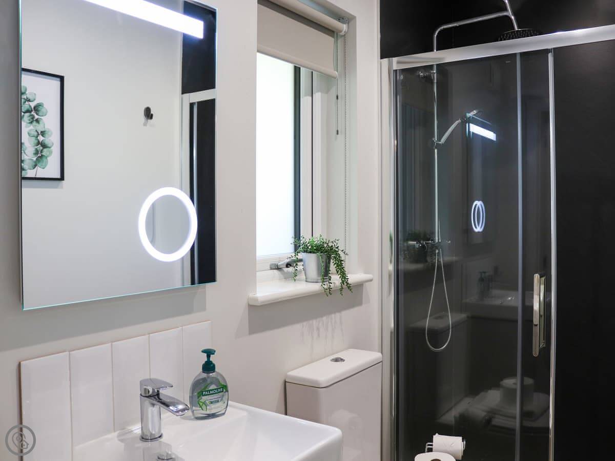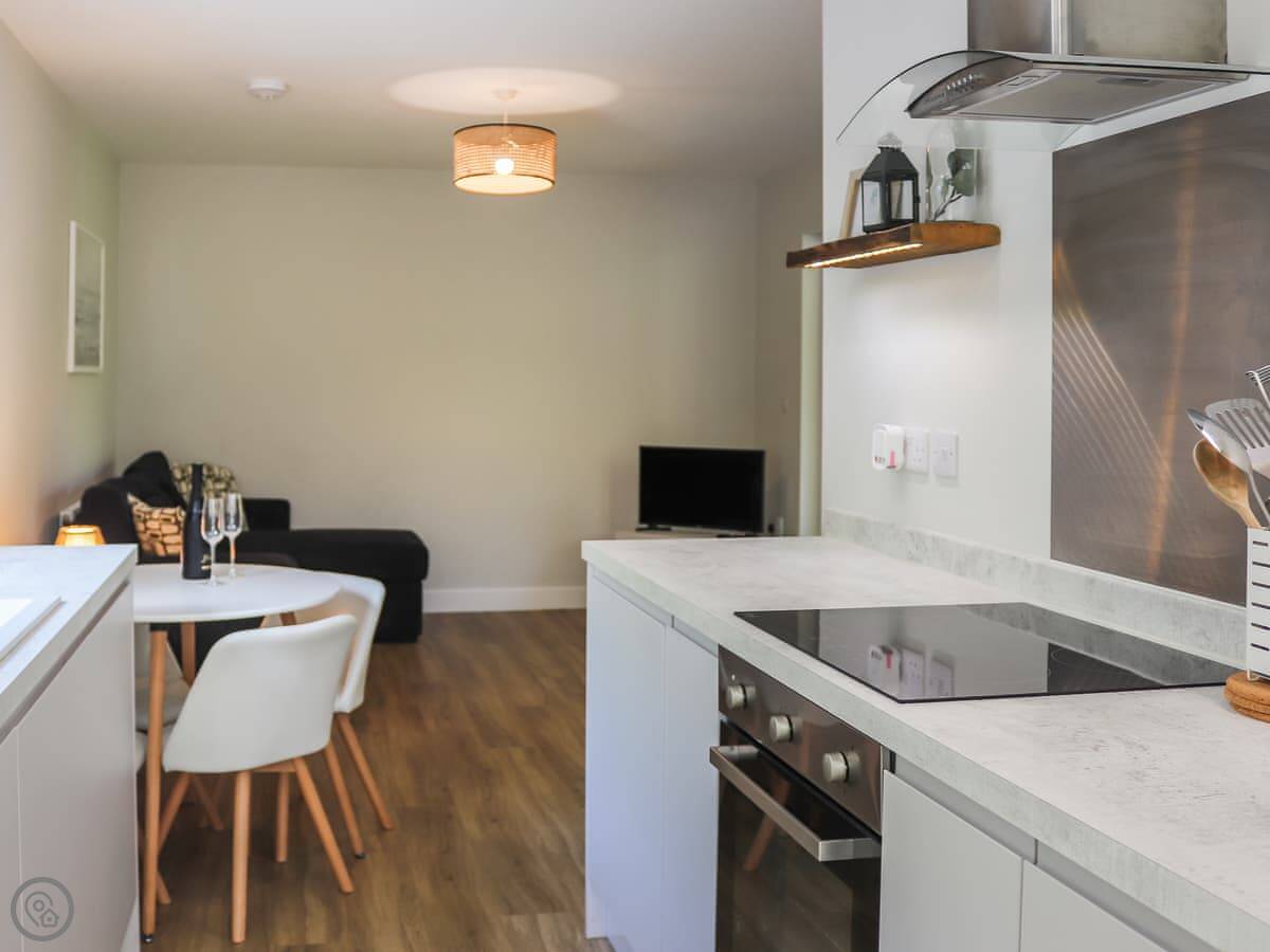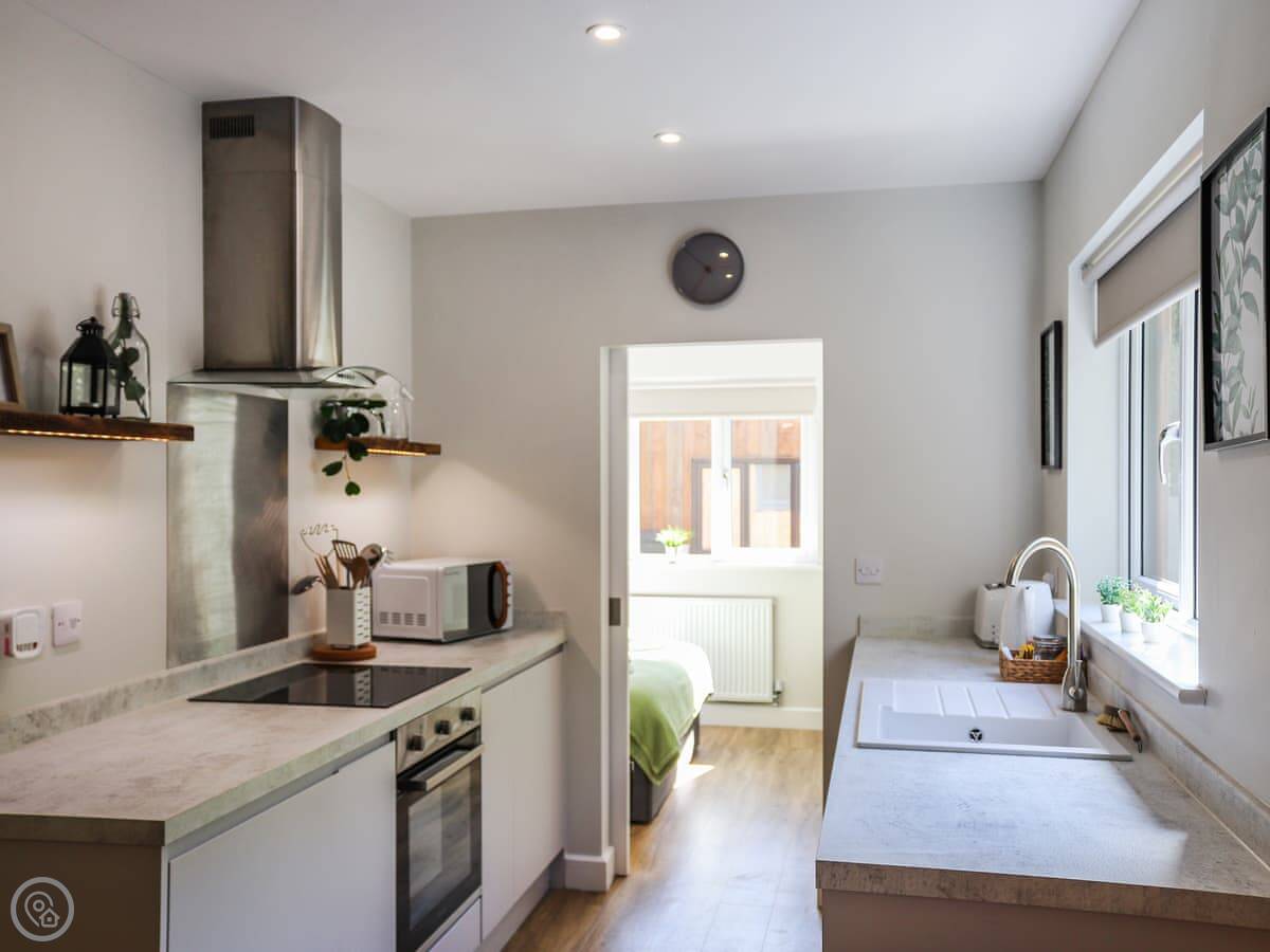 It’s got one main bedroom with a king-size bed, and there’s a sofa bed in the lounge area for an extra person, so it sleeps three. Everything’s on one level, open plan. The kitchen’s got what you need, including a dishwasher. There’s a shower, no bath.