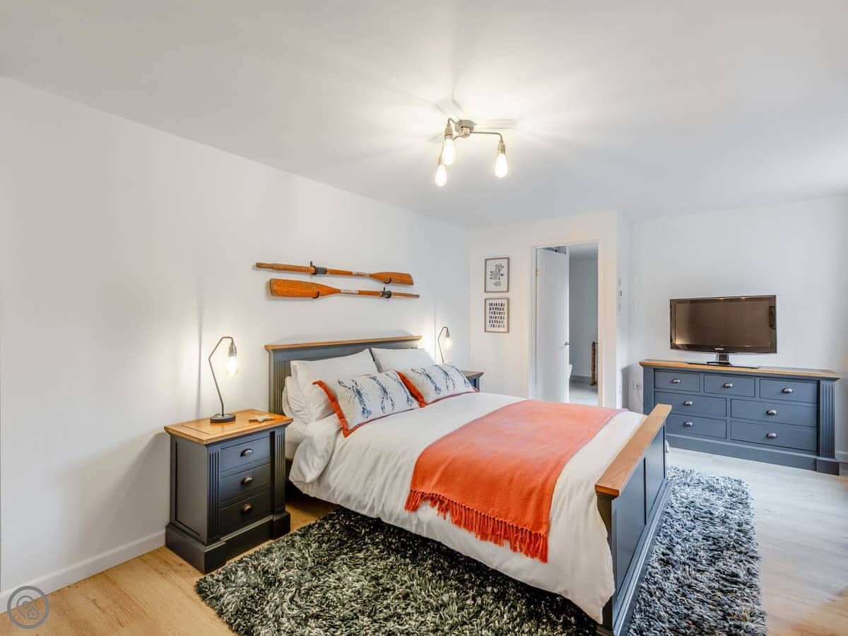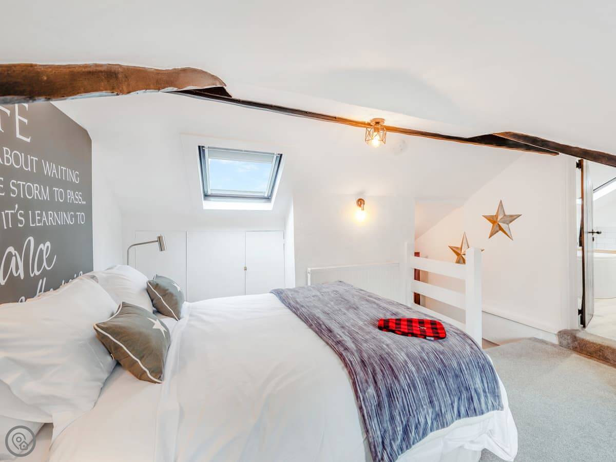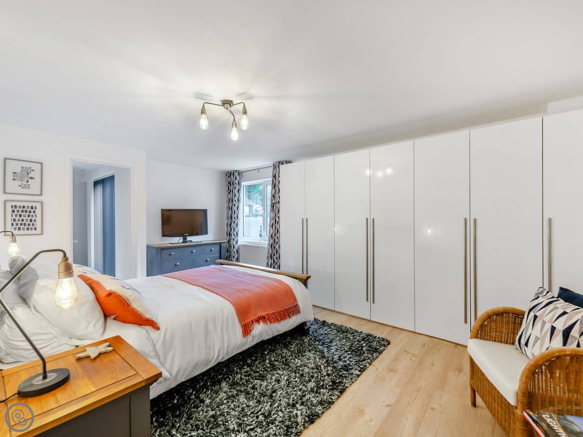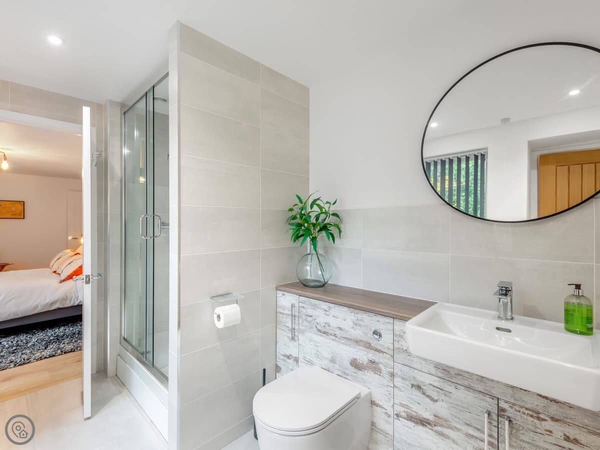 The barn sleeps five, in three bedrooms. There are two bathrooms, one en suite to the main bedroom, which is handy. It's got a 5 Star rating. It's a high quality finish, comfortable and well thought out. There's a wood burner in the main living space. It heats the room well.