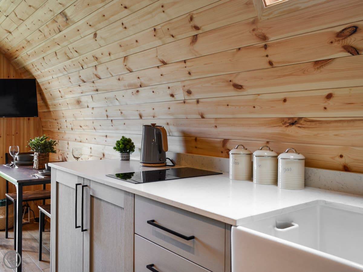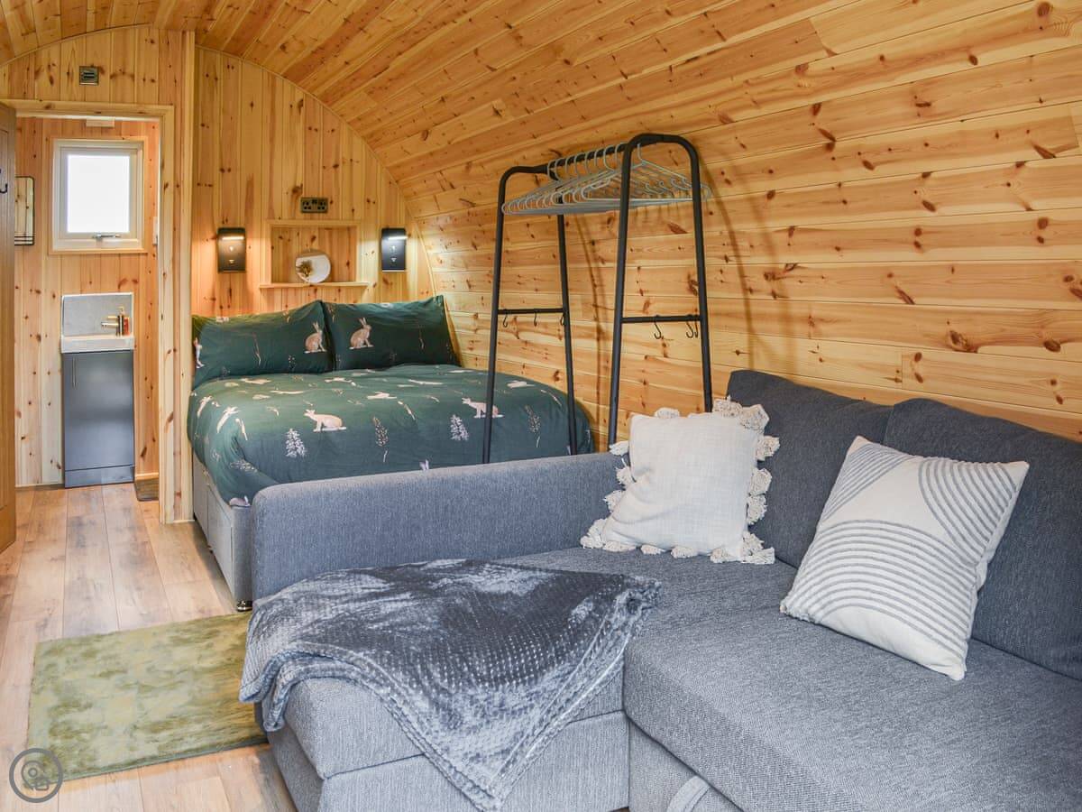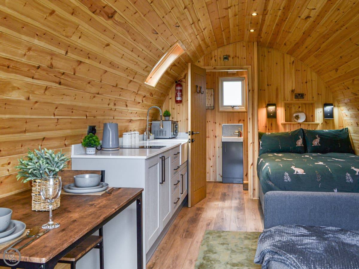 It sleeps two adults, plus space for two children on the sofa bed. There's one bedroom area and one shower room. It's got a 4 Star rating. It's clean and well put together, but it's a pod, so space is compact. The kitchen area is small but has what you need.