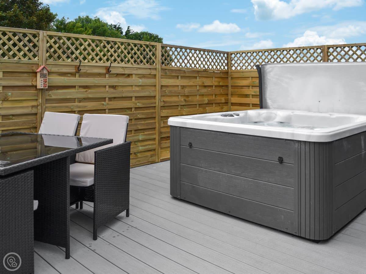 The main thing is the private hot tub on the deck. It looks out over the fields. The deck is enclosed, which is good if you've got dogs. You can bring two dogs. There's a mile-long dog walk on the farm itself.