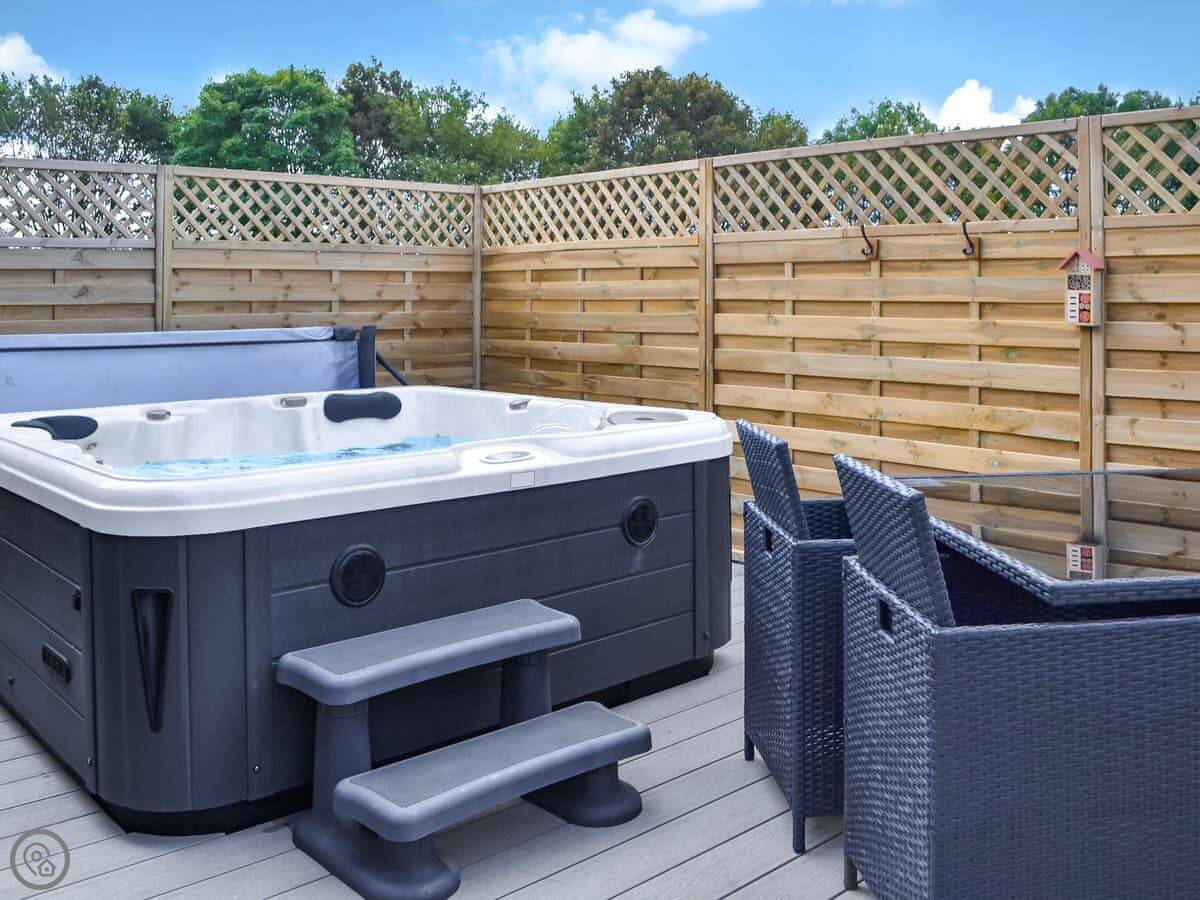Outside, there's a deck with seating, a barbecue, and a private hot tub. The view is over fields. The farm has a dedicated dog walk on site, about a mile long.