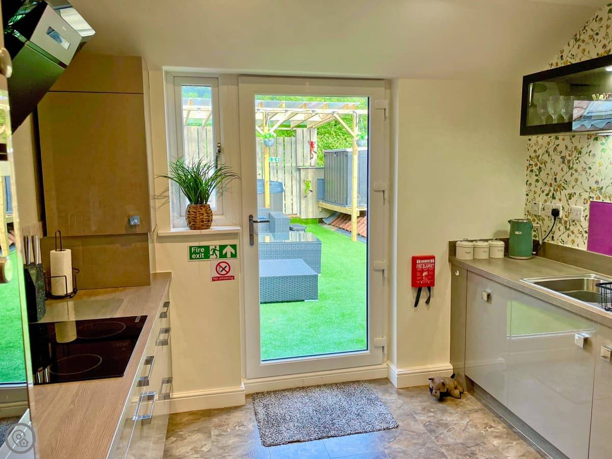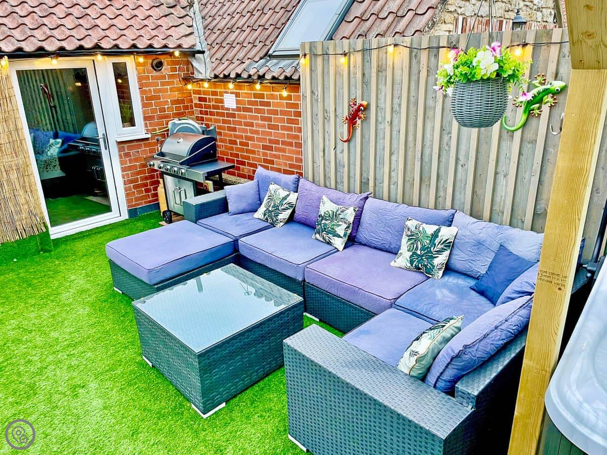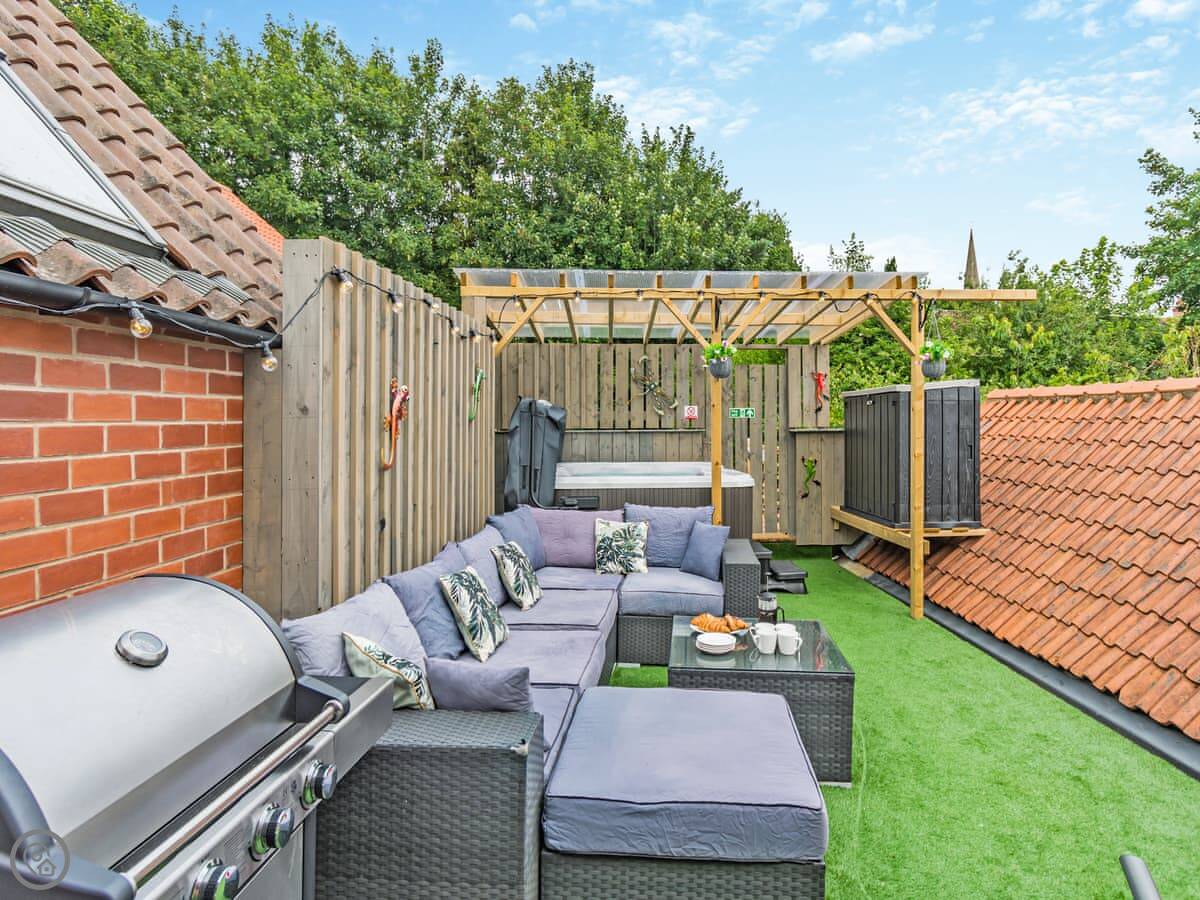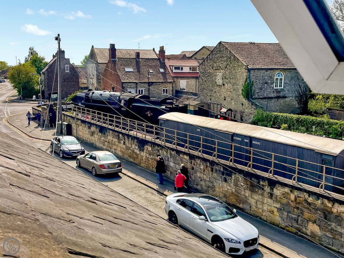 The main thing is the roof terrace. It's private, it's got a cover over the hot tub, and there's a sofa and a gas barbecue out there. You can see the steam railway station from the living room and one of the bedrooms. The train goes by a few times a day. It's a nice sight, but you'll hear the whistle.