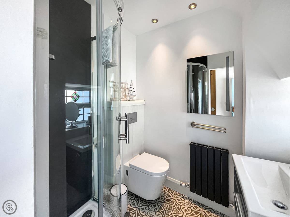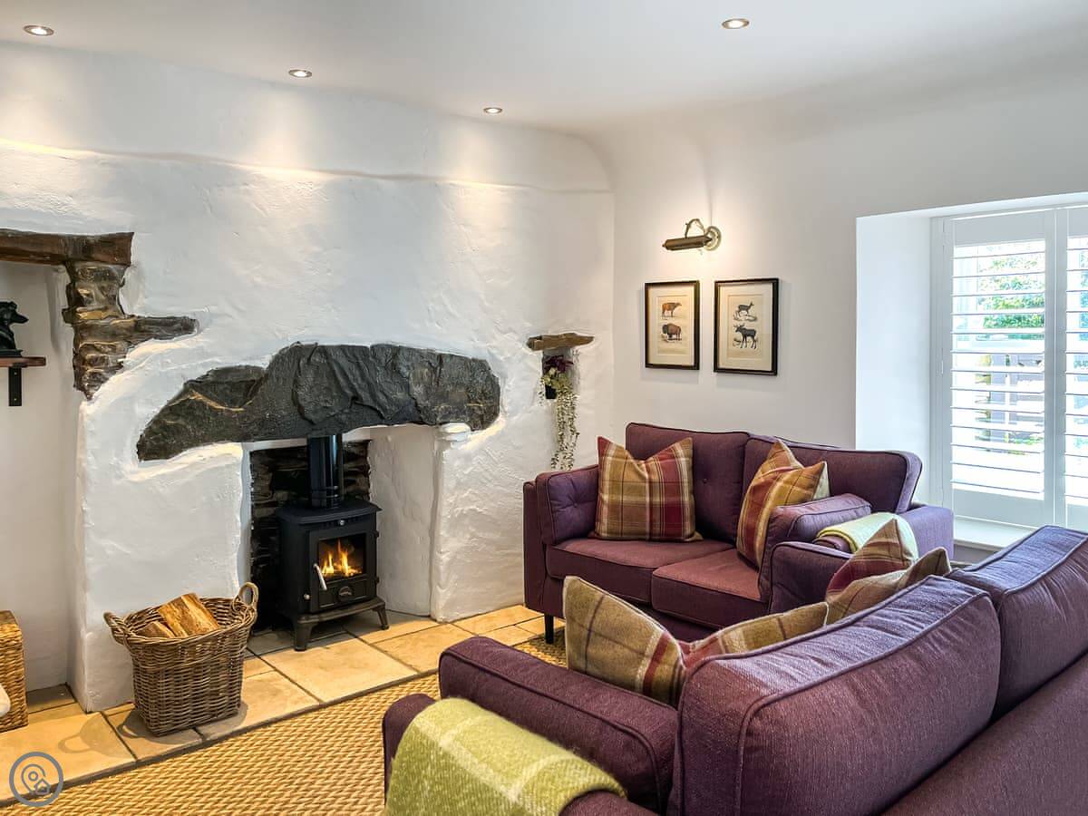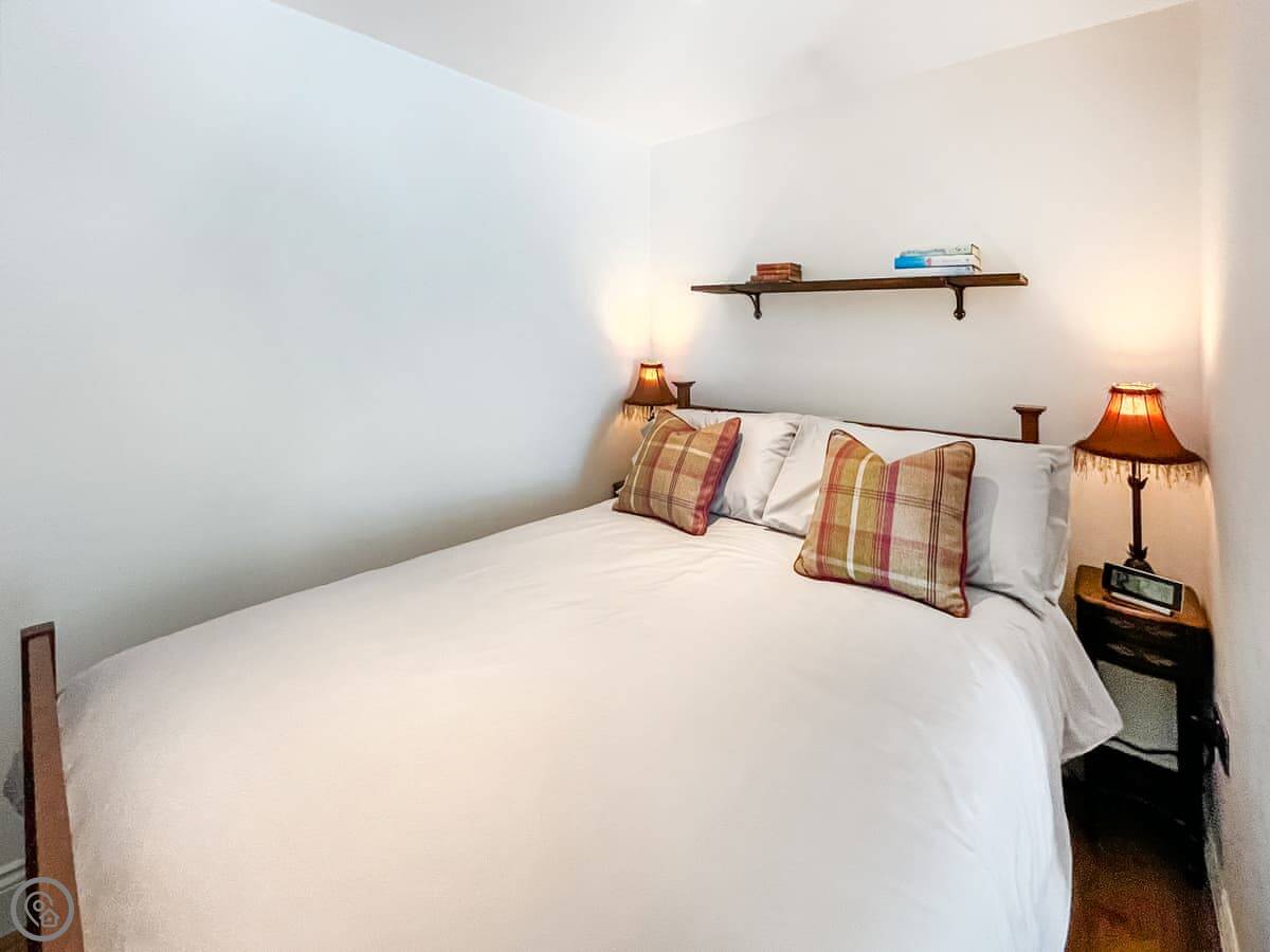 Downstairs is the living room with a wood burner and a small kitchen area at the back. The stairs are steep and narrow, just so you know. Upstairs is the double bedroom and a shower room. Everything you need is there: TV, wifi, washing machine. Bedding and towels are included.
