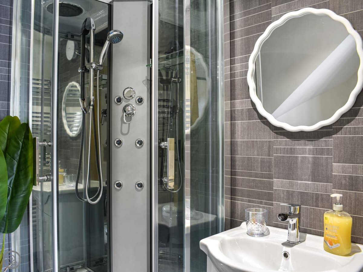 It sleeps four. Two bedrooms, both double beds, upstairs in a mezzanine style. One bathroom, which is a shower room on the ground floor. It has a 4 Star rating. It's modern and clean inside. The stairs up to the bedrooms are a standard flight.