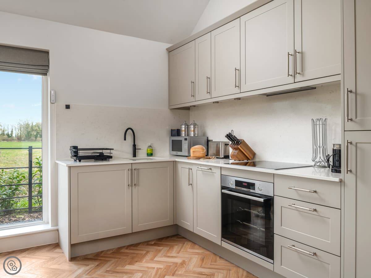 Inside it’s all open plan. One bedroom, one bathroom. It’s comfortable. The bed is a king size. There’s a wood burner. The kitchen’s got everything you’d need, a dishwasher and washing machine included.