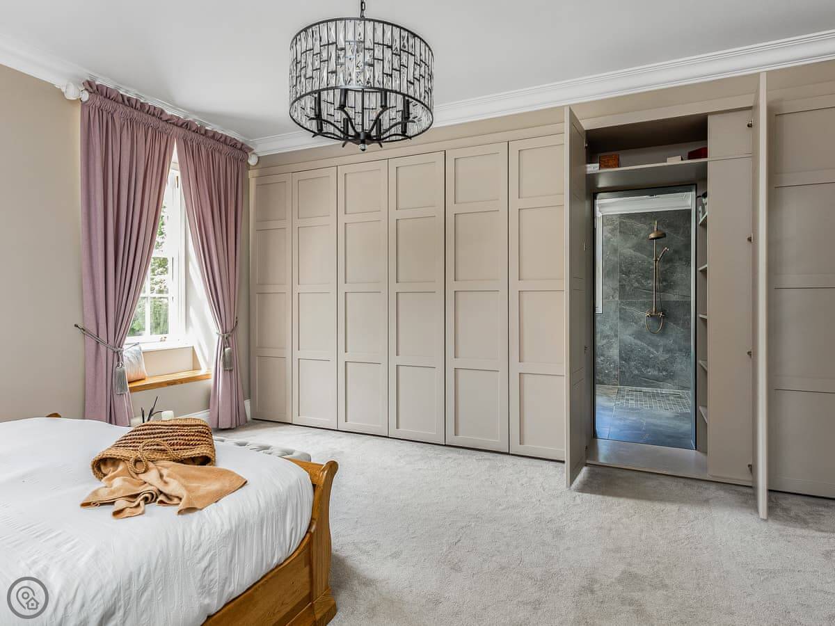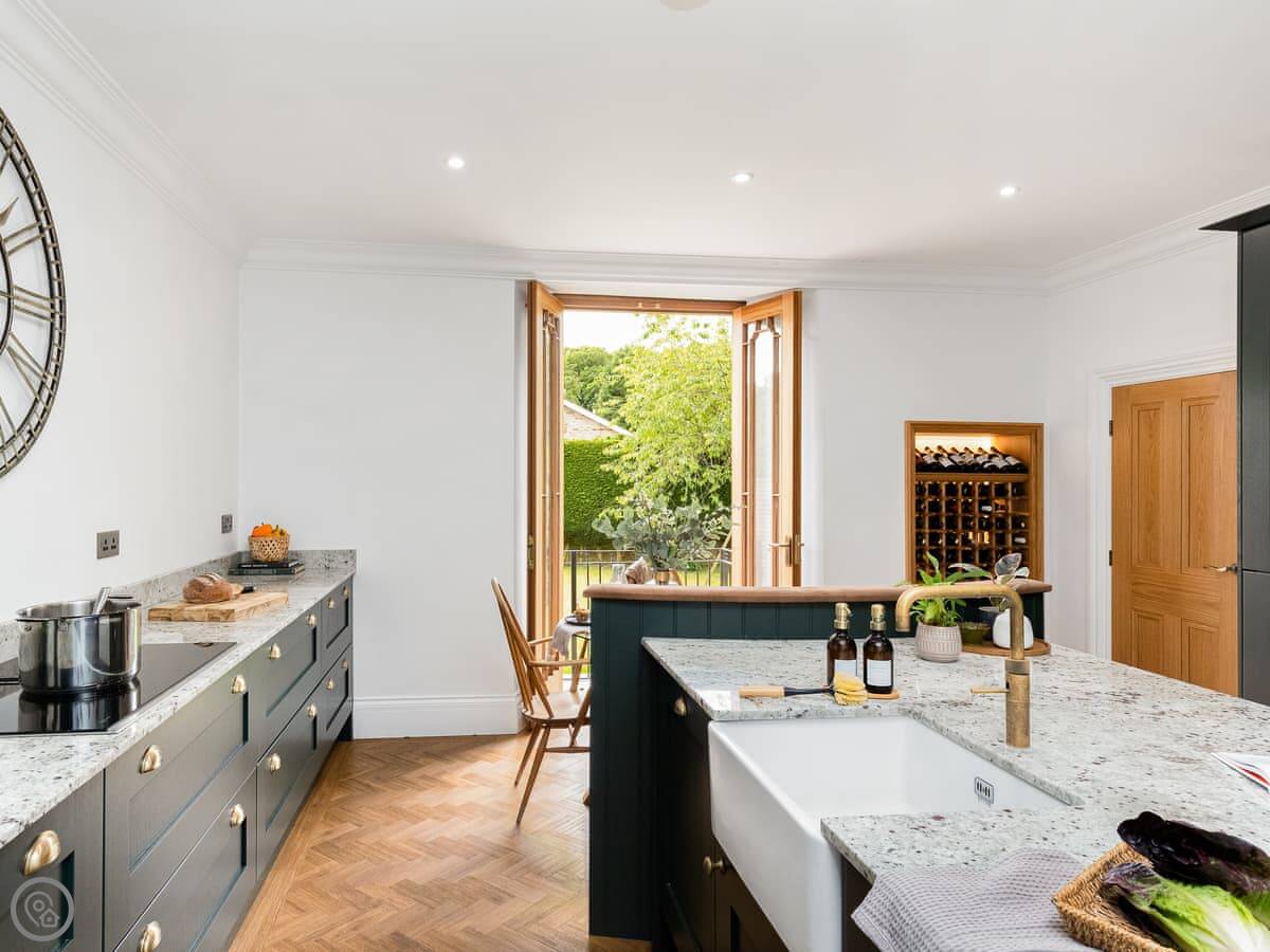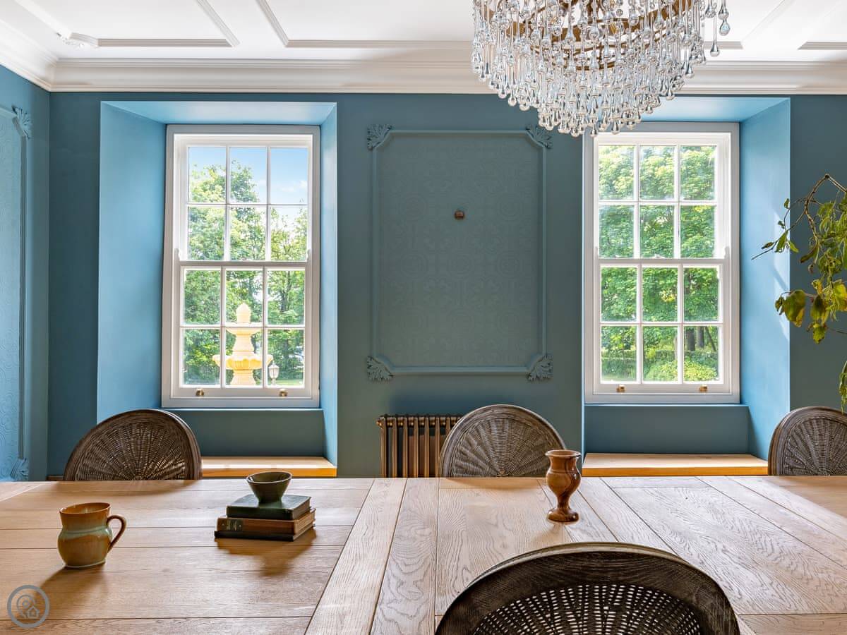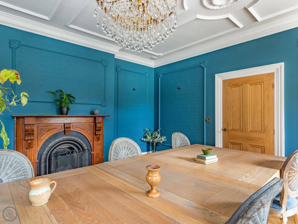 Downstairs is spacious. There are two living rooms, one with a wood burner and a TV. The dining room is separate and grand, with a big table under a chandelier. The kitchen is high spec and has a small table with views over the garden.