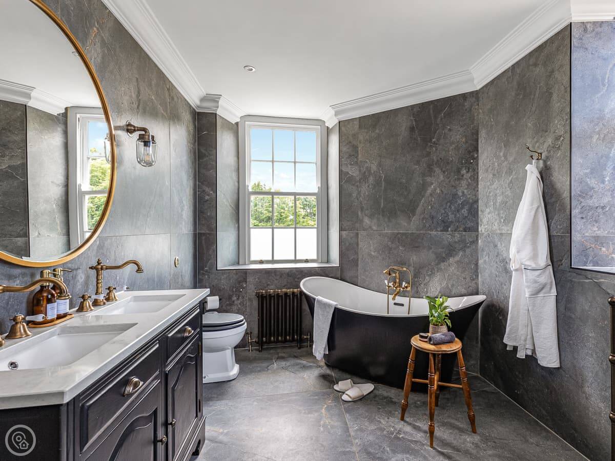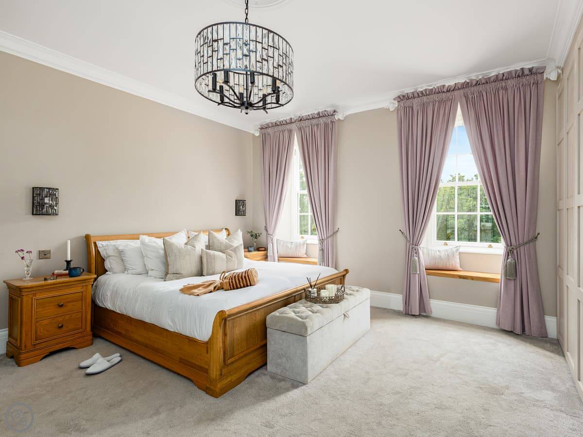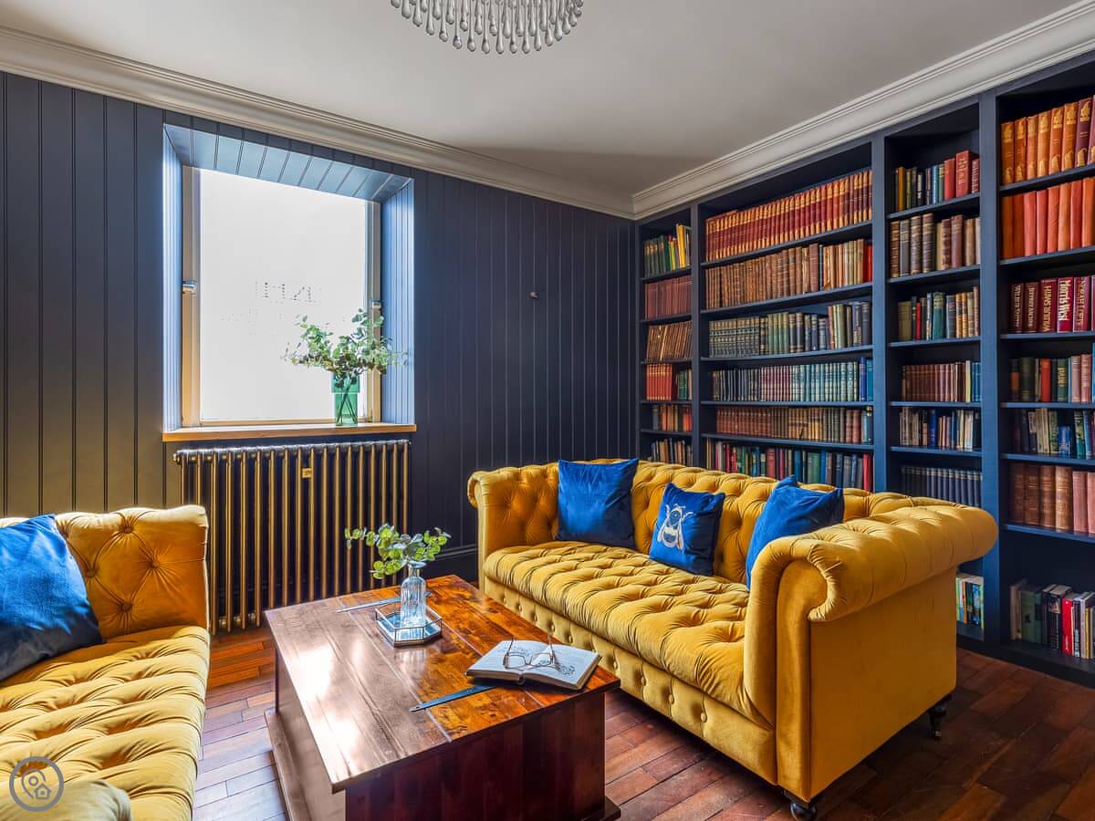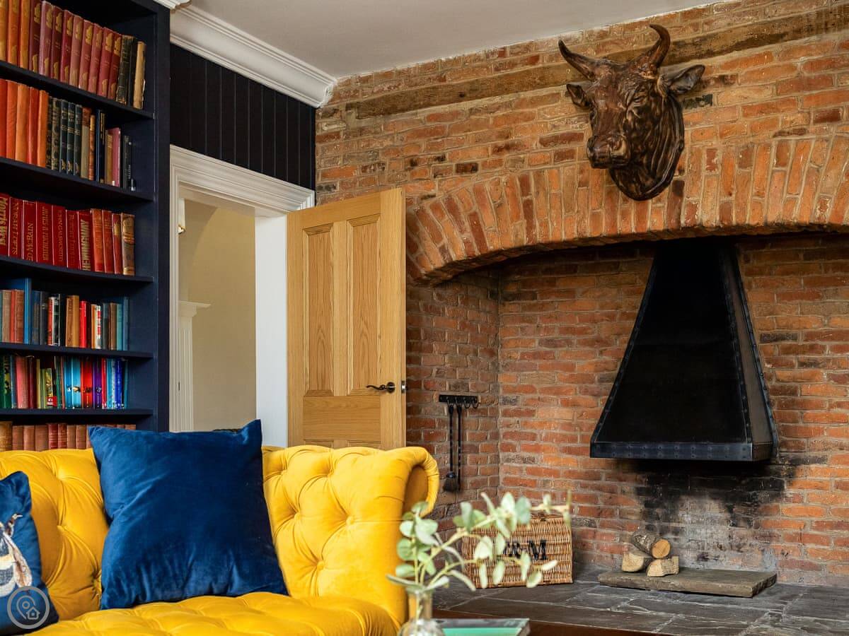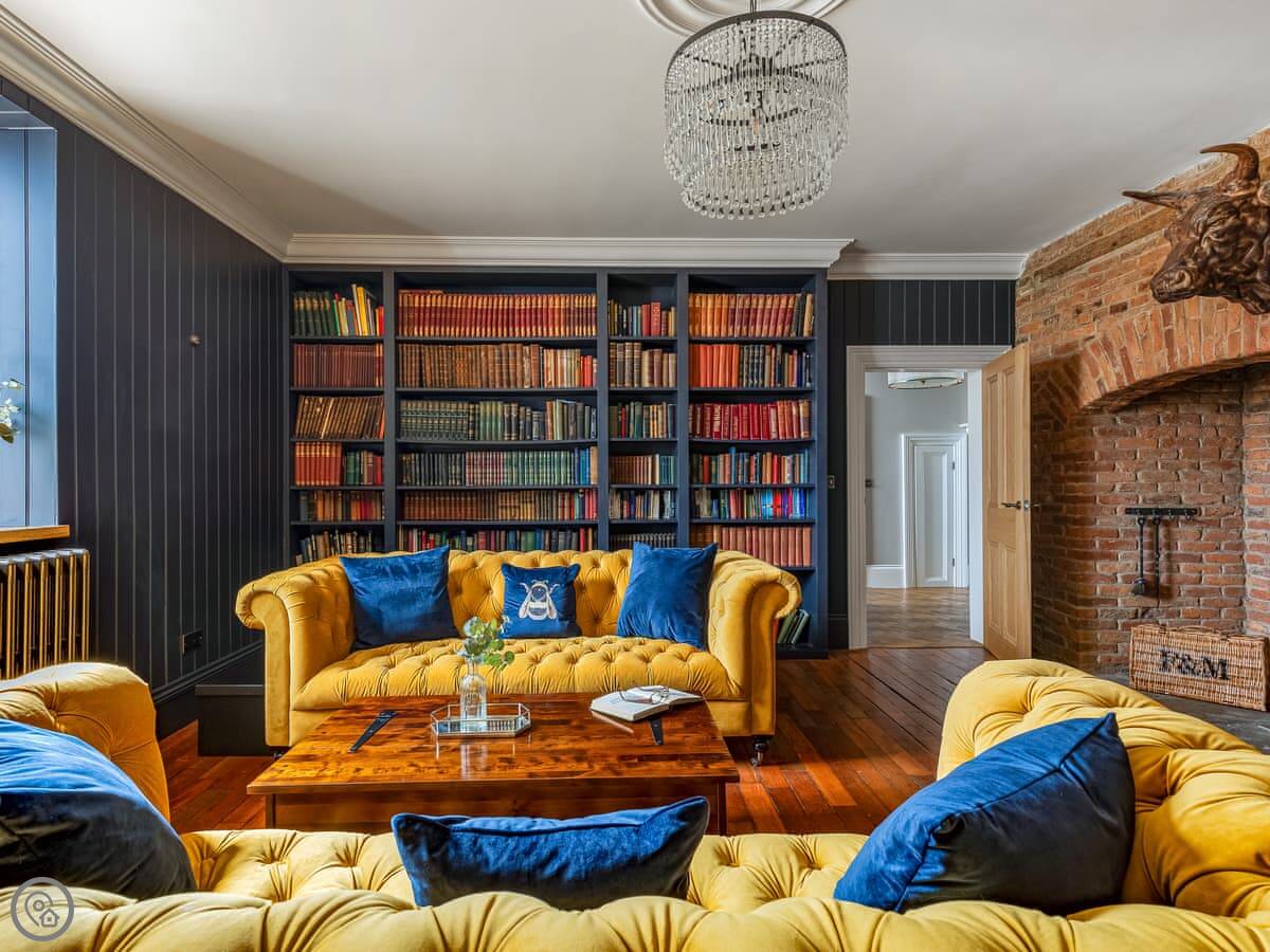 Downstairs is spacious. There are two living rooms, one with a wood burner and a TV. The dining room is separate and grand, with a big table under a chandelier. The kitchen is high spec and has a small table with views over the garden.