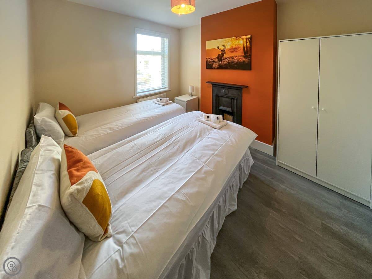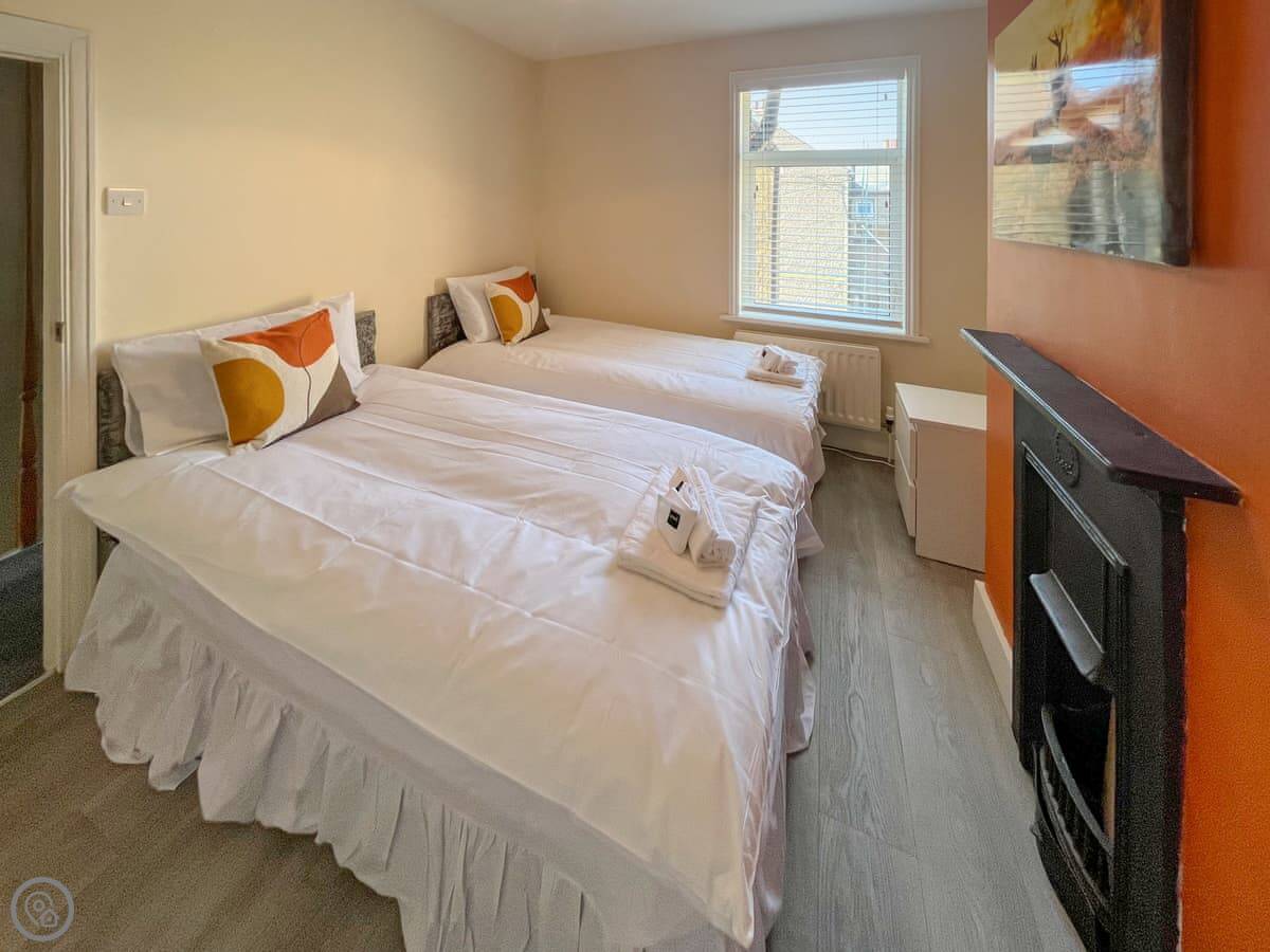 It sleeps four. Two bedrooms upstairs and one bathroom. It's got a 4 Star rating. It's comfortable and recently done up. The stairs are a typical terrace house staircase, so they're a bit steep and narrow.