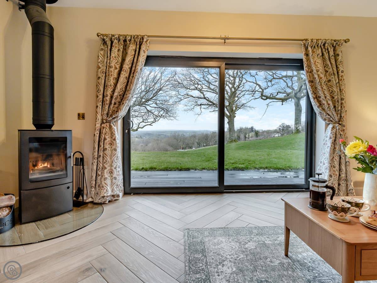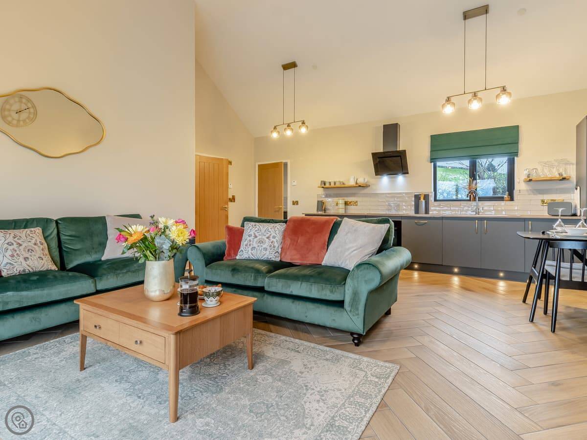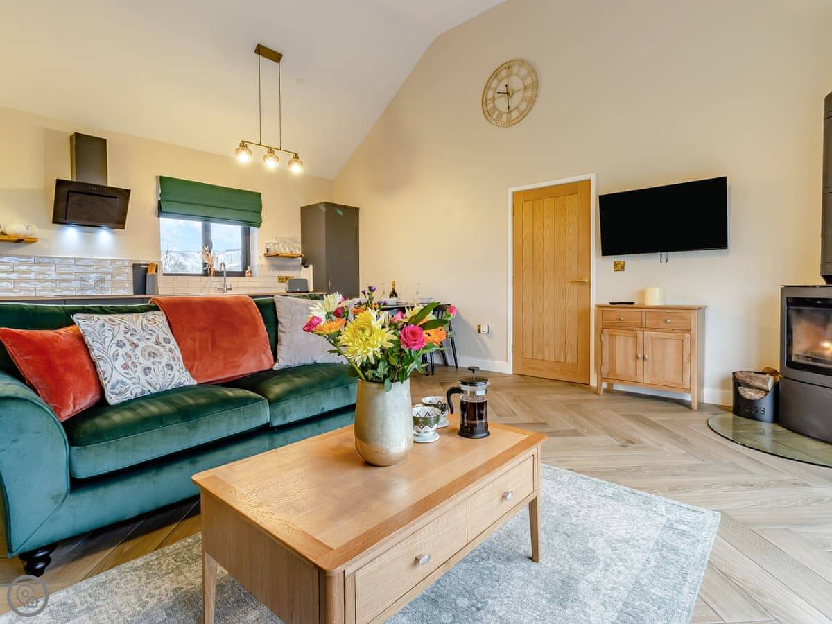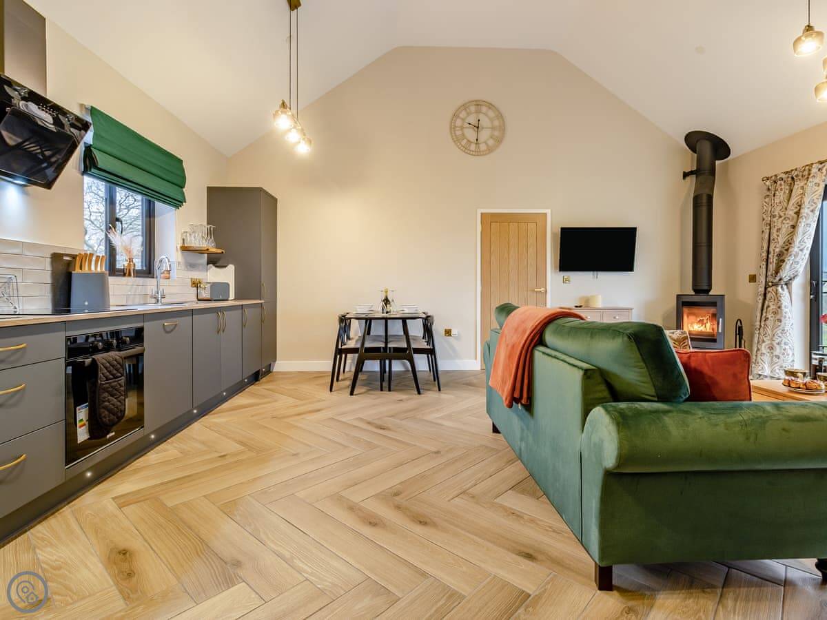 The living area is all open plan. There's a log burner and underfloor heating. The kitchen has a dishwasher and an induction hob. The main thing out here is the big deck. There's a hot tub on it. The garden is fenced.