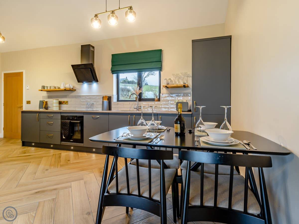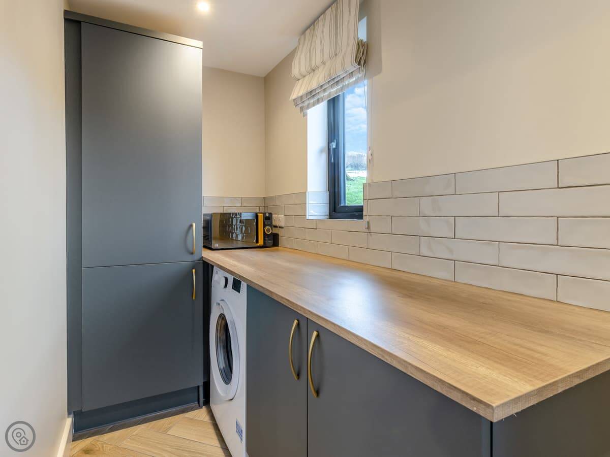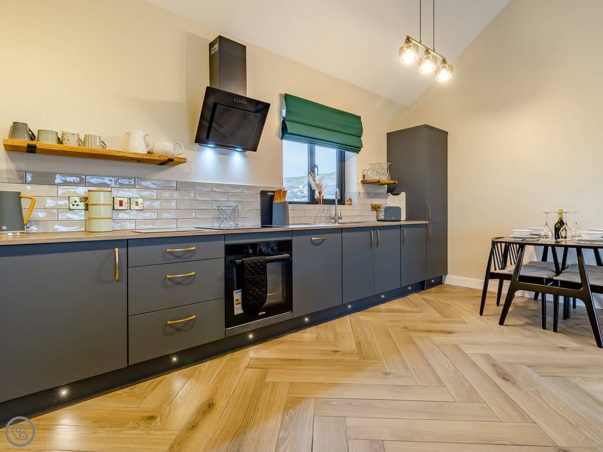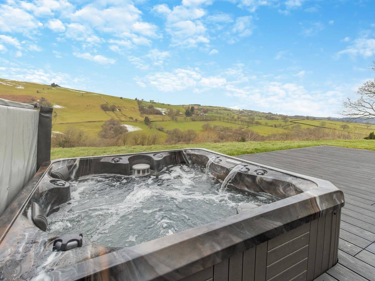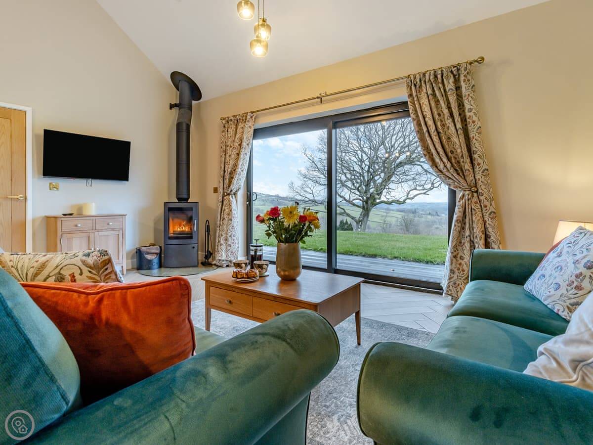 The living area is all open plan. There's a log burner and underfloor heating. The kitchen has a dishwasher and an induction hob. The main thing out here is the big deck. There's a hot tub on it. The garden is fenced.