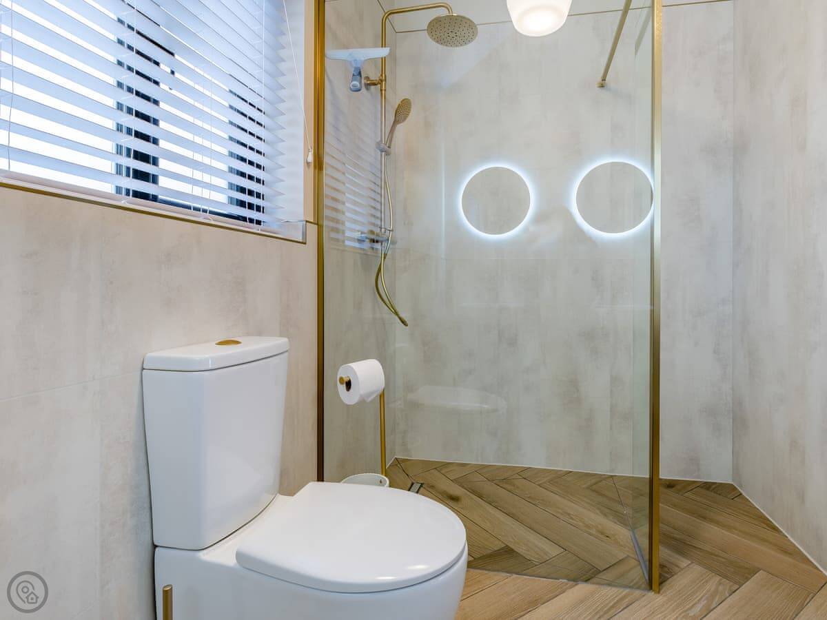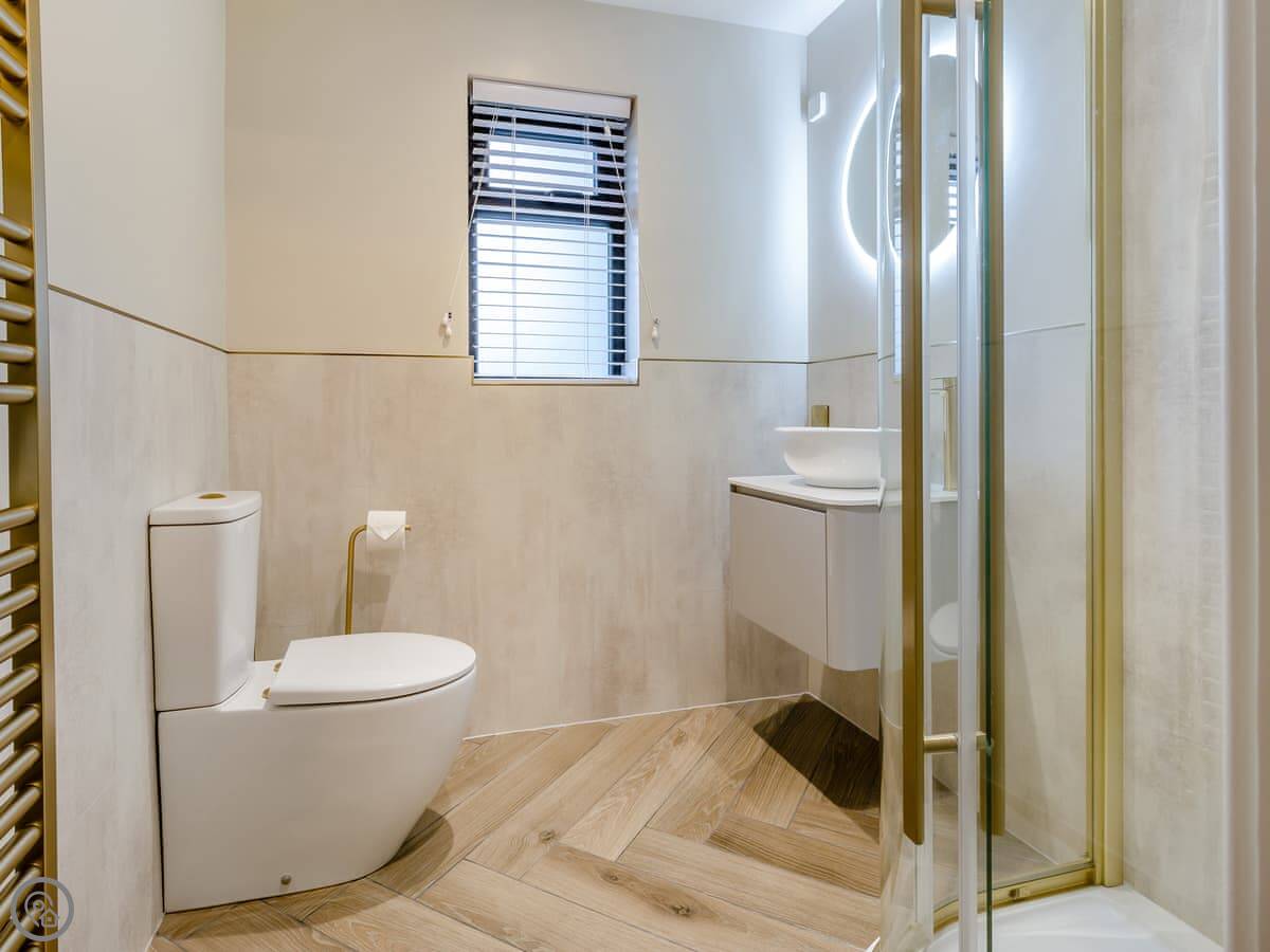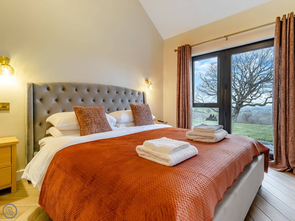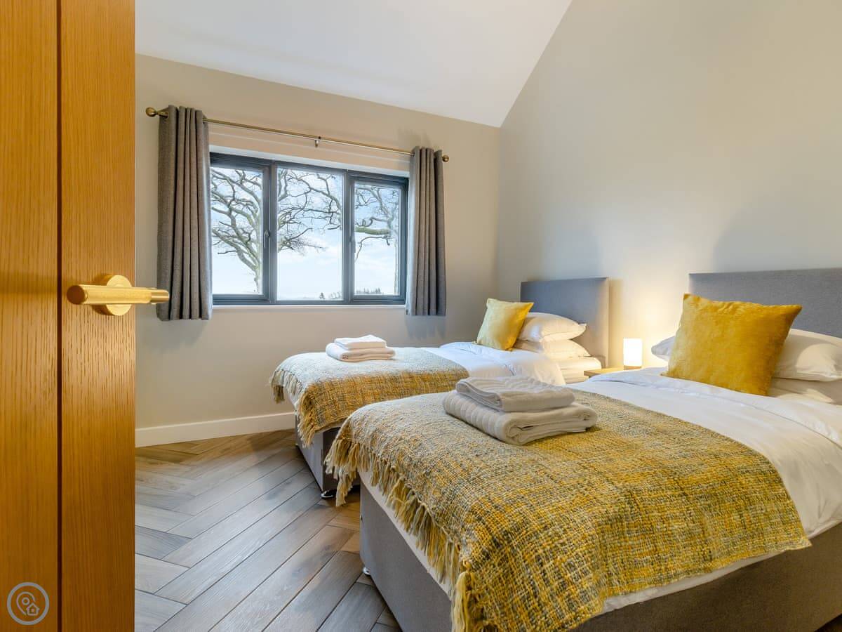 It's a five star lodge. They're quite strict with those ratings, so it means everything's new and works properly. It sleeps four. Two bedrooms, one bathroom, plus an ensuite shower room off the main bedroom. That main bedroom has a super king bed. You can make the second one up as twins or a super king.