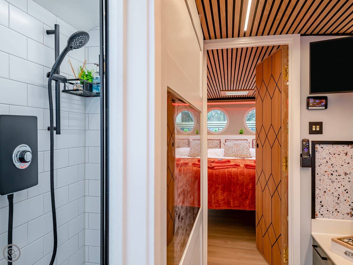 The conversion is new. Everything inside is clean and works. It's got a 4 Star rating. It feels modern, but you know you're on a bus. The ceiling is low in the middle. There's a proper shower and a kitchenette with what you need.