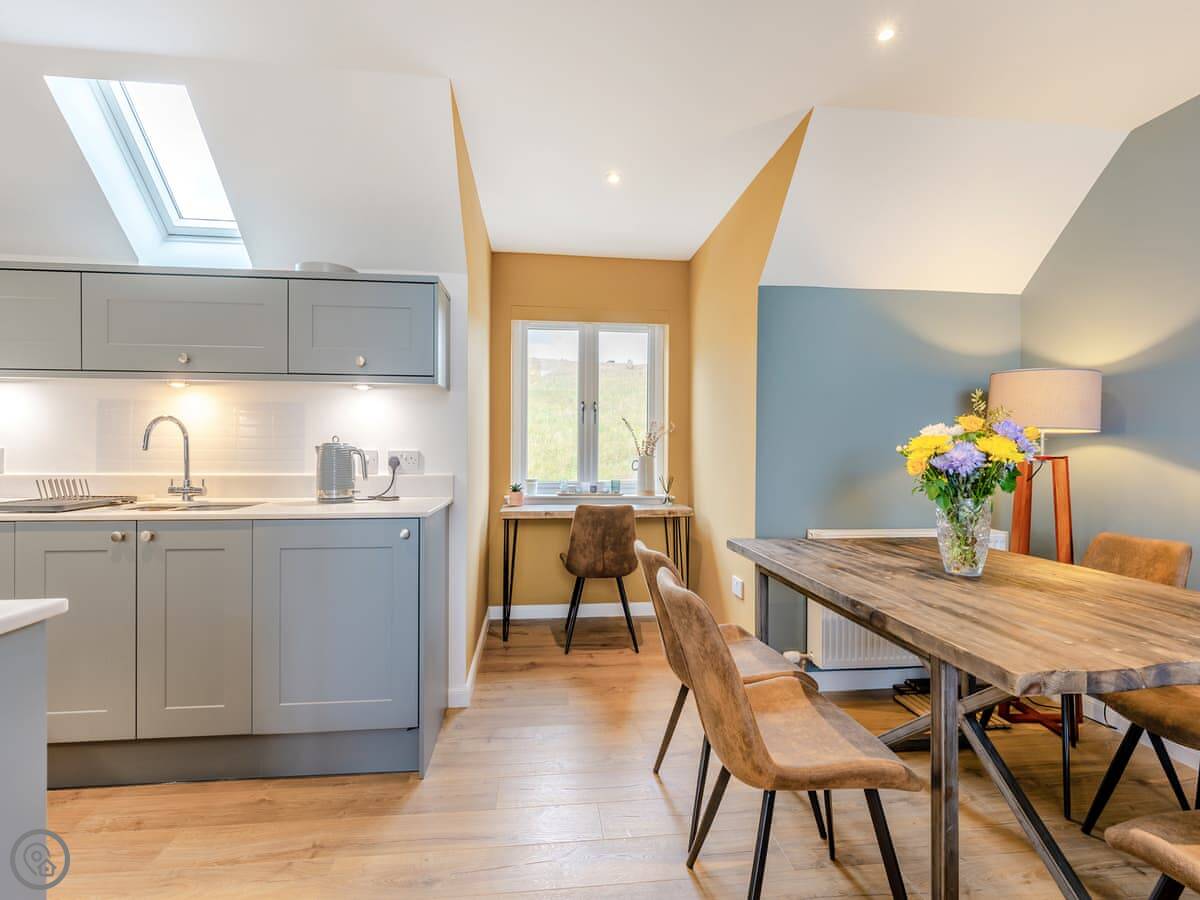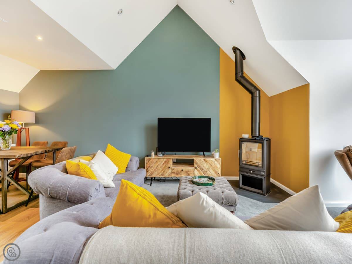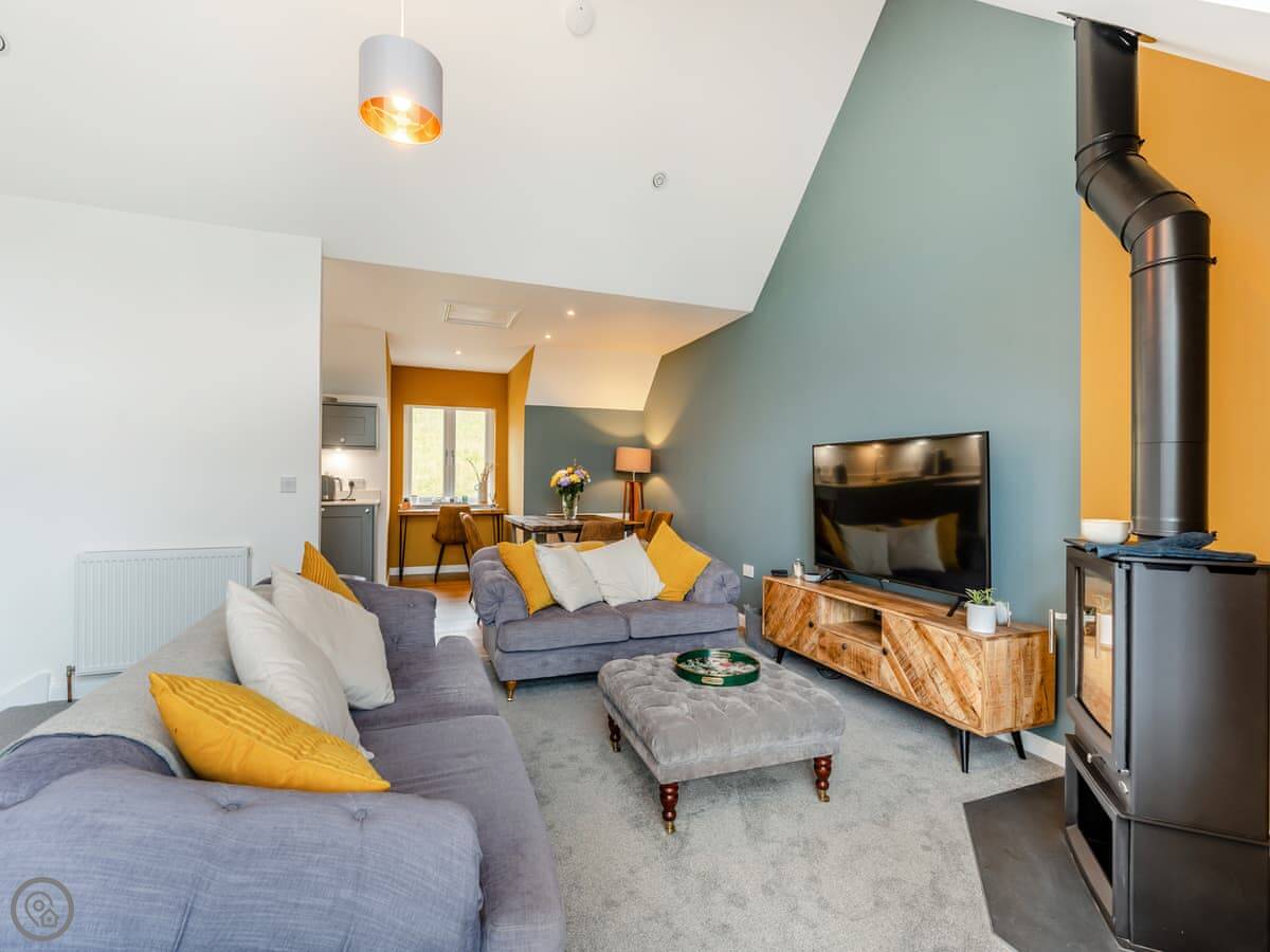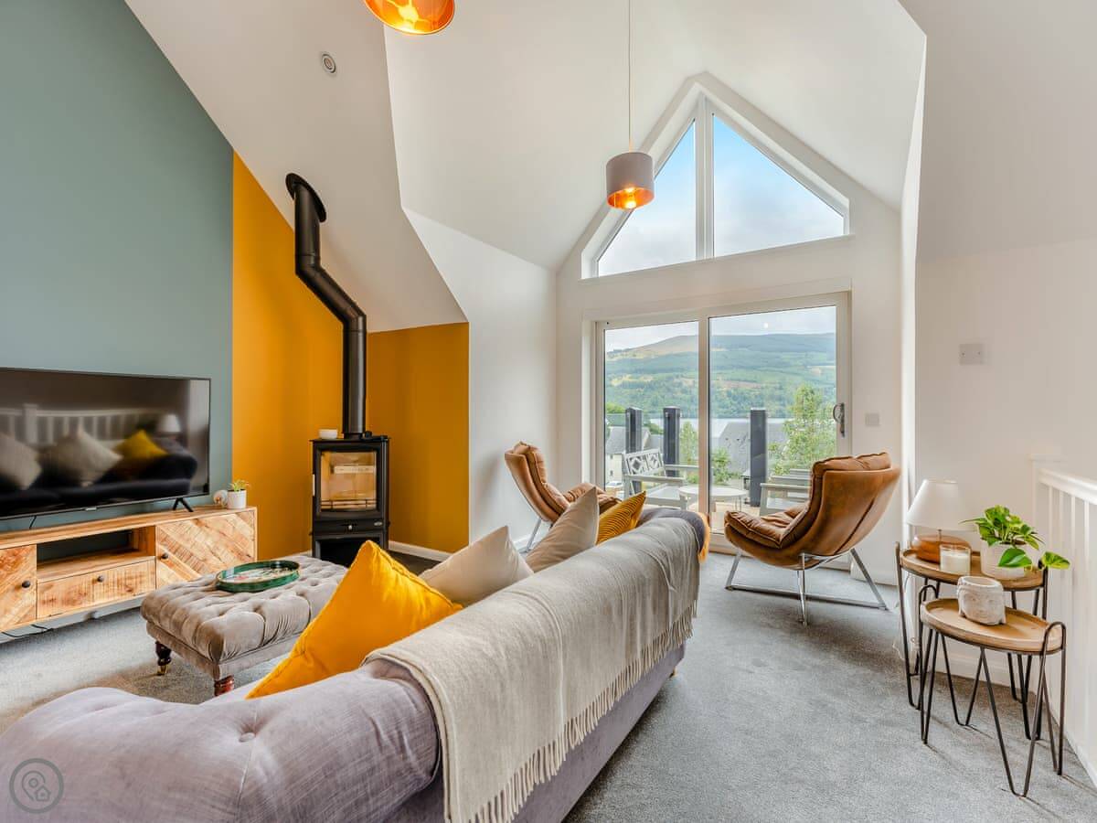 Downstairs are the bedrooms. Upstairs is all one space: kitchen, living area, dining table. There's a wood-burning stove for cooler evenings. Doors open out onto a balcony overlooking the loch.