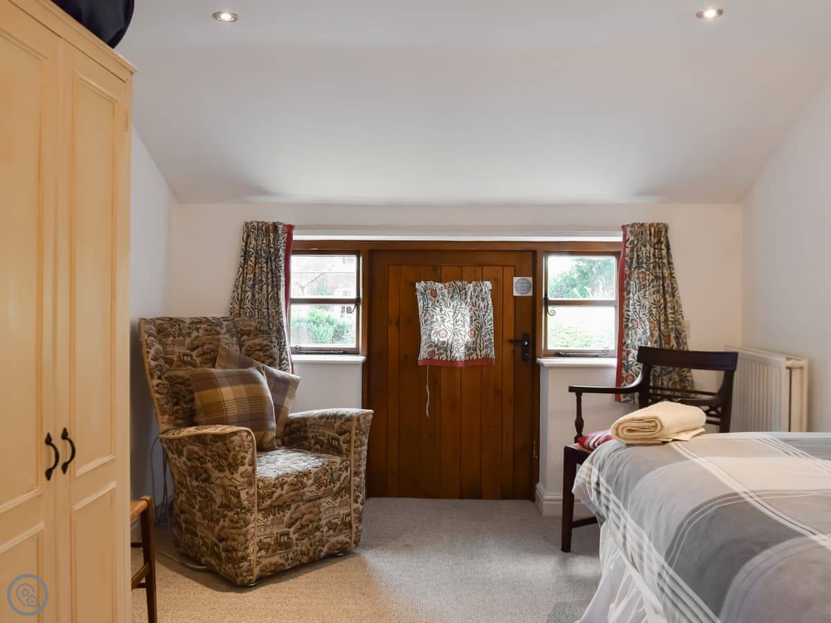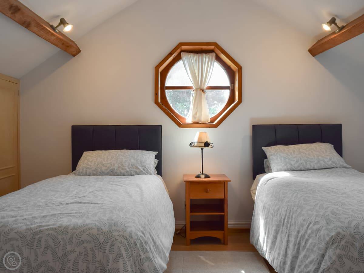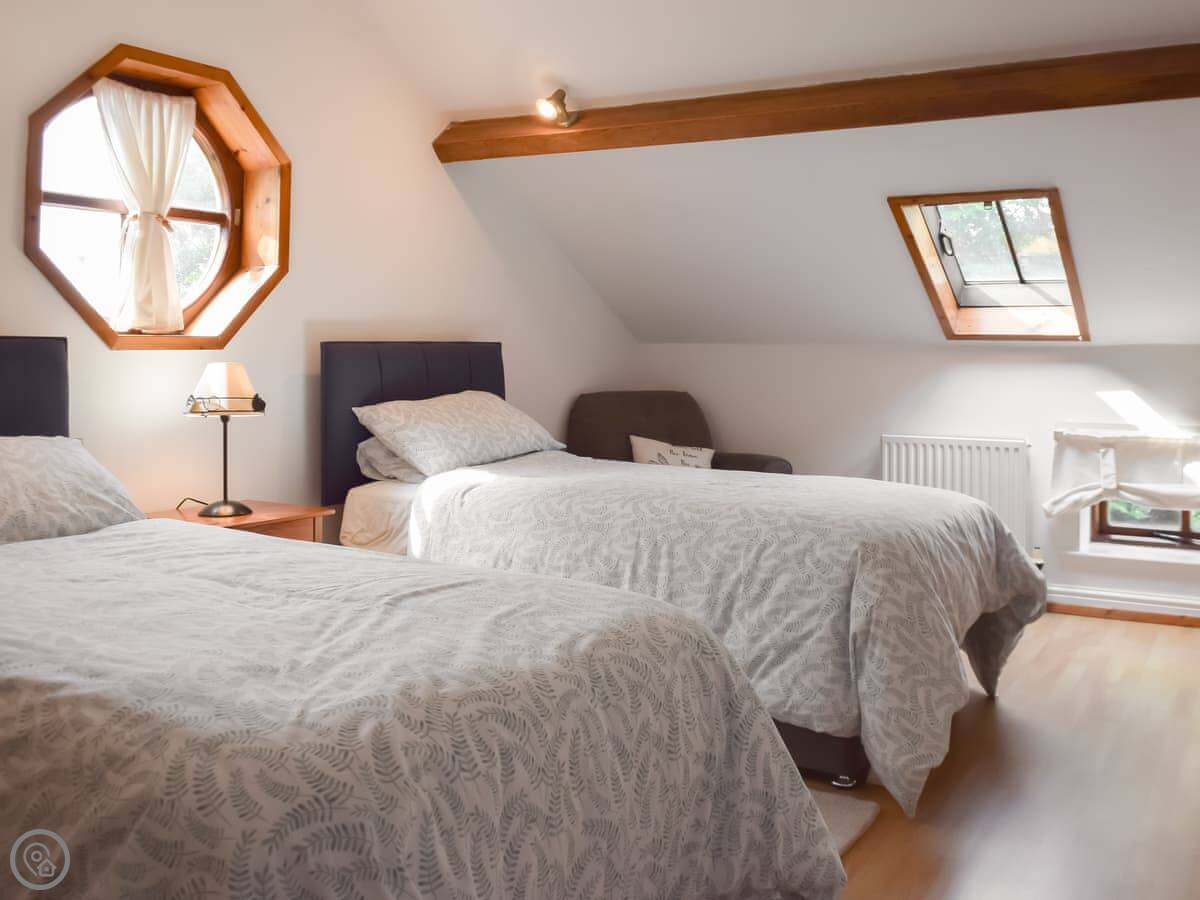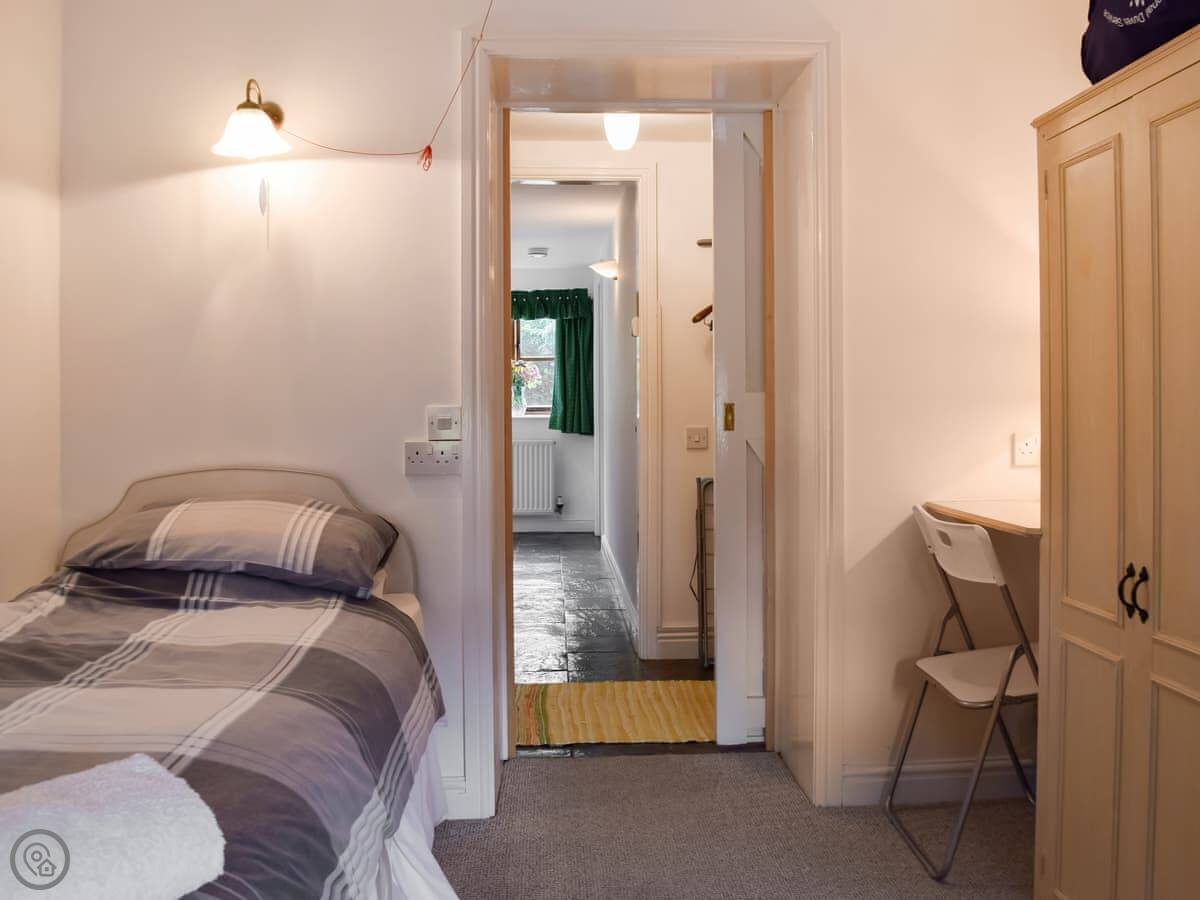 It sleeps five. There are three bedrooms. One single is downstairs, next to a wet room. Upstairs there are two more bedrooms and a bathroom with a bath. The ceilings upstairs are sloped, with old beams. Watch your head in a couple of spots.