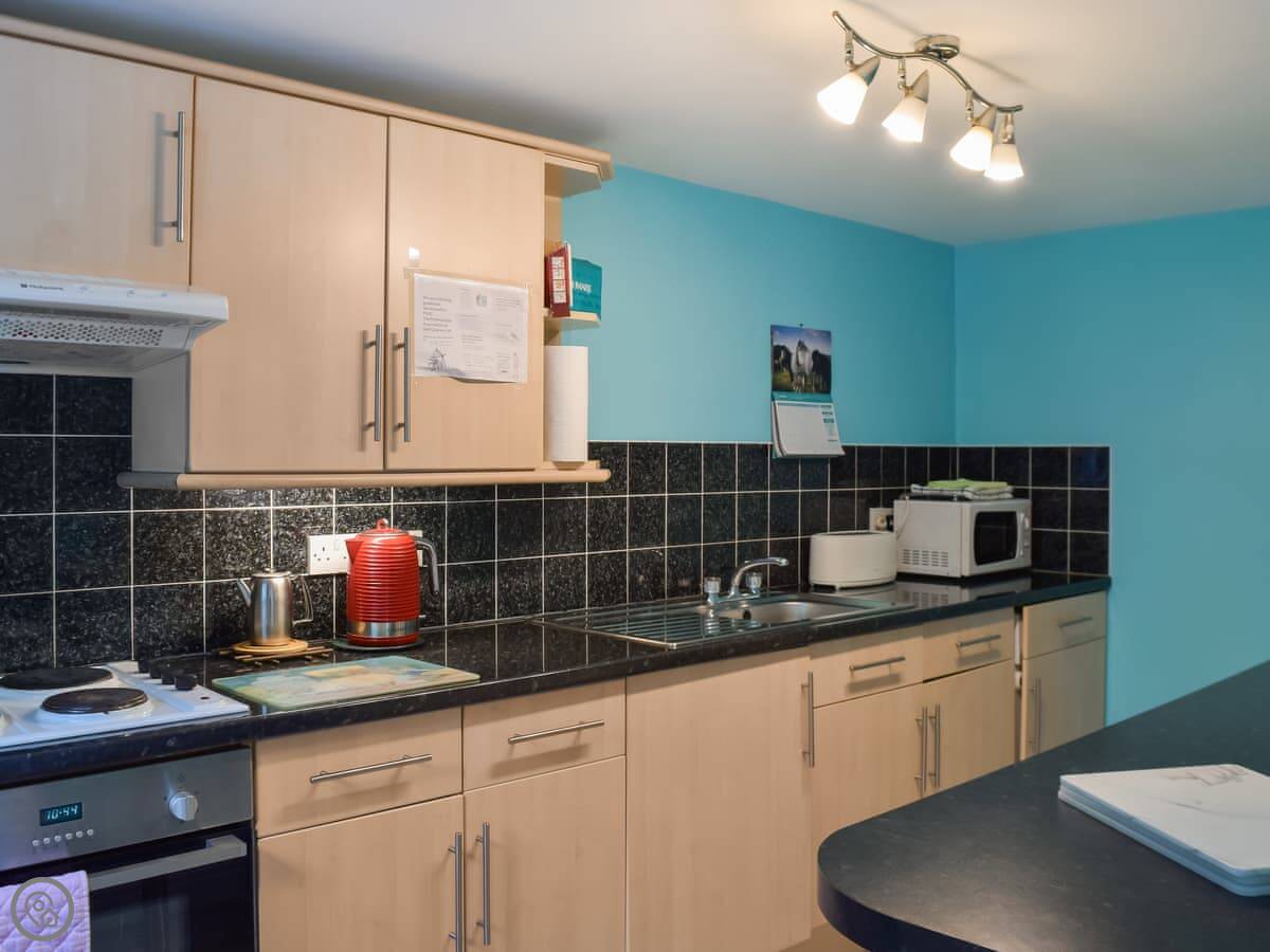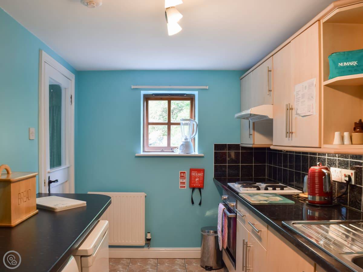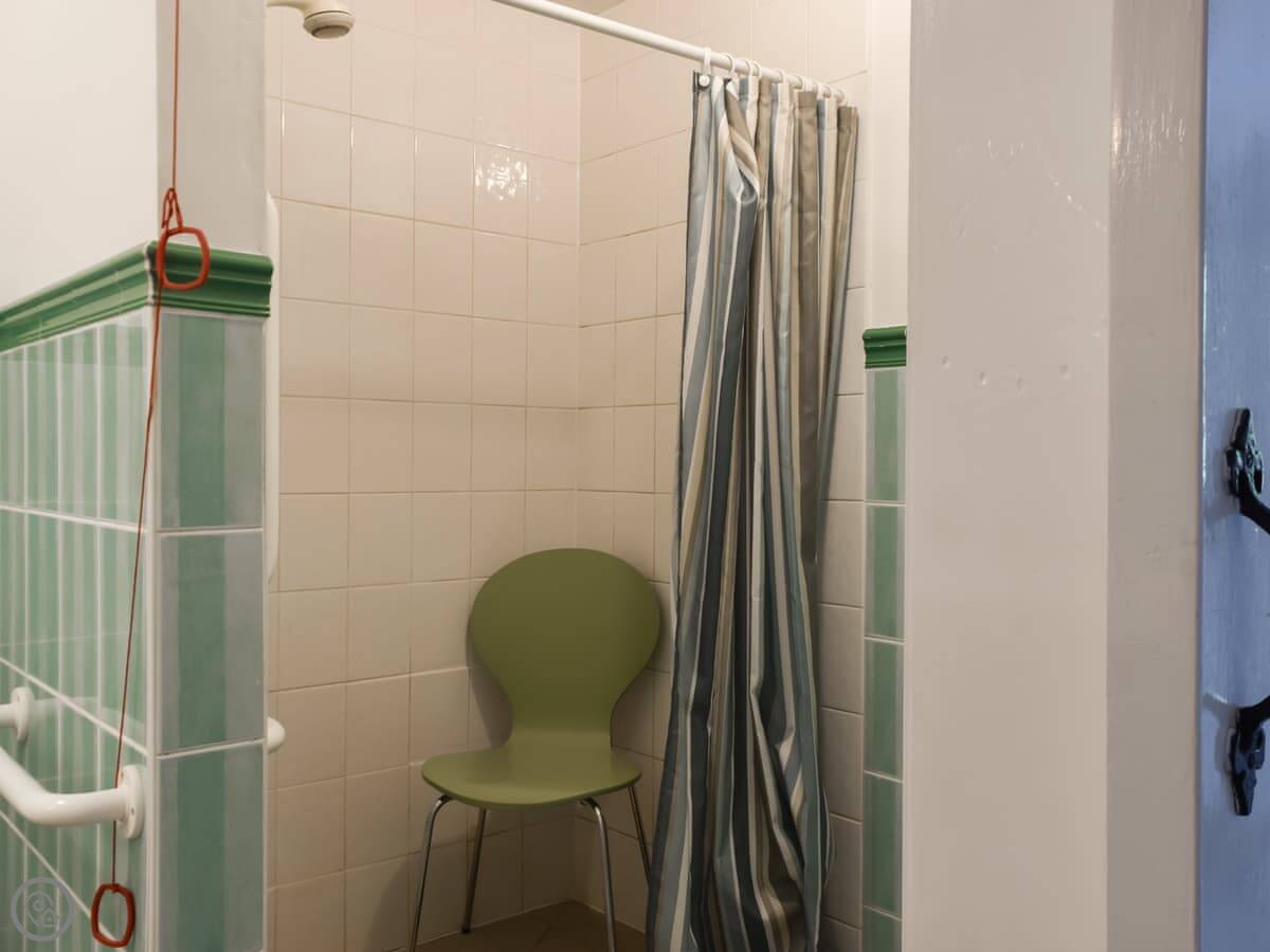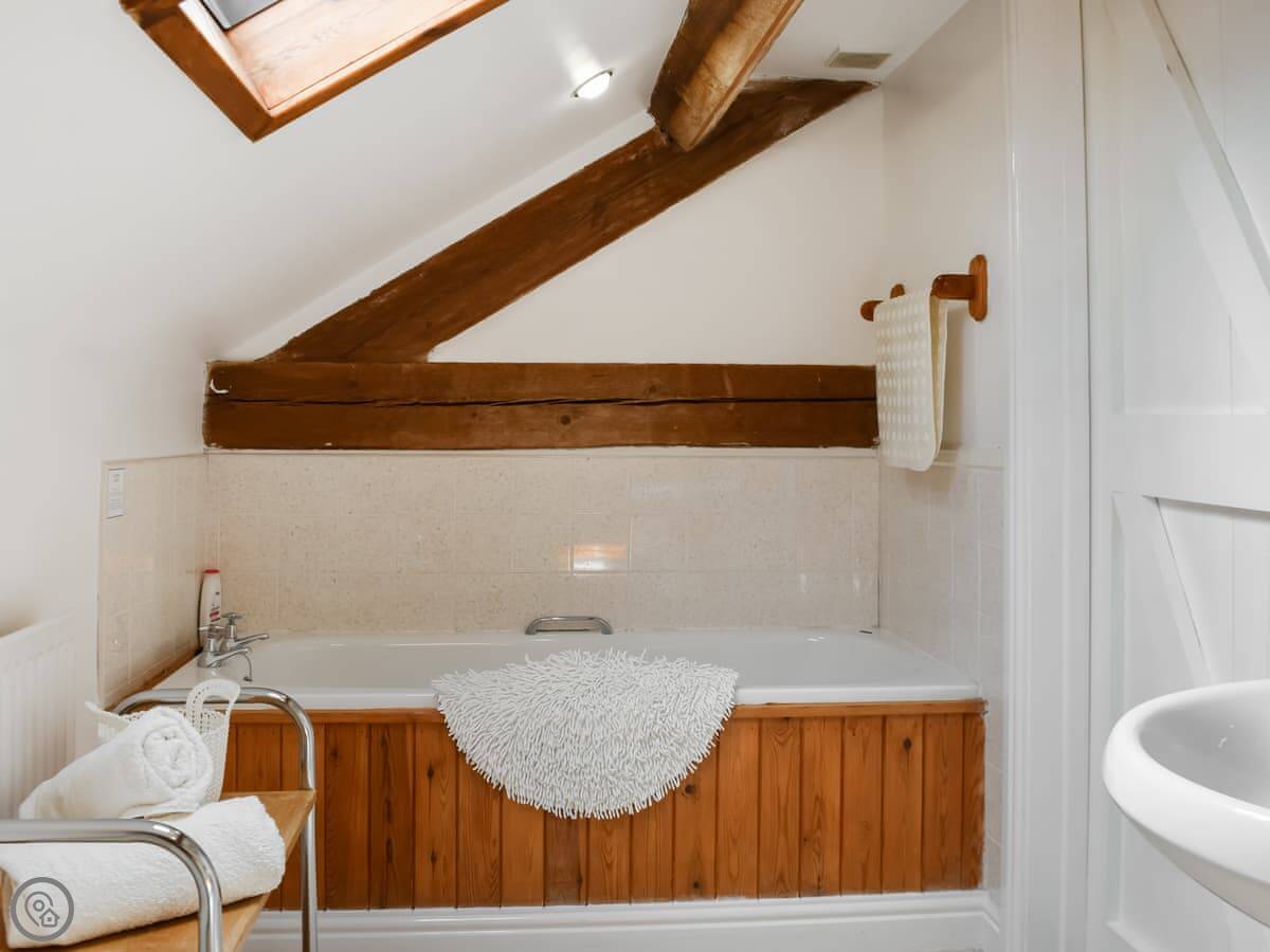 It sleeps five. There are three bedrooms. One single is downstairs, next to a wet room. Upstairs there are two more bedrooms and a bathroom with a bath. The ceilings upstairs are sloped, with old beams. Watch your head in a couple of spots.