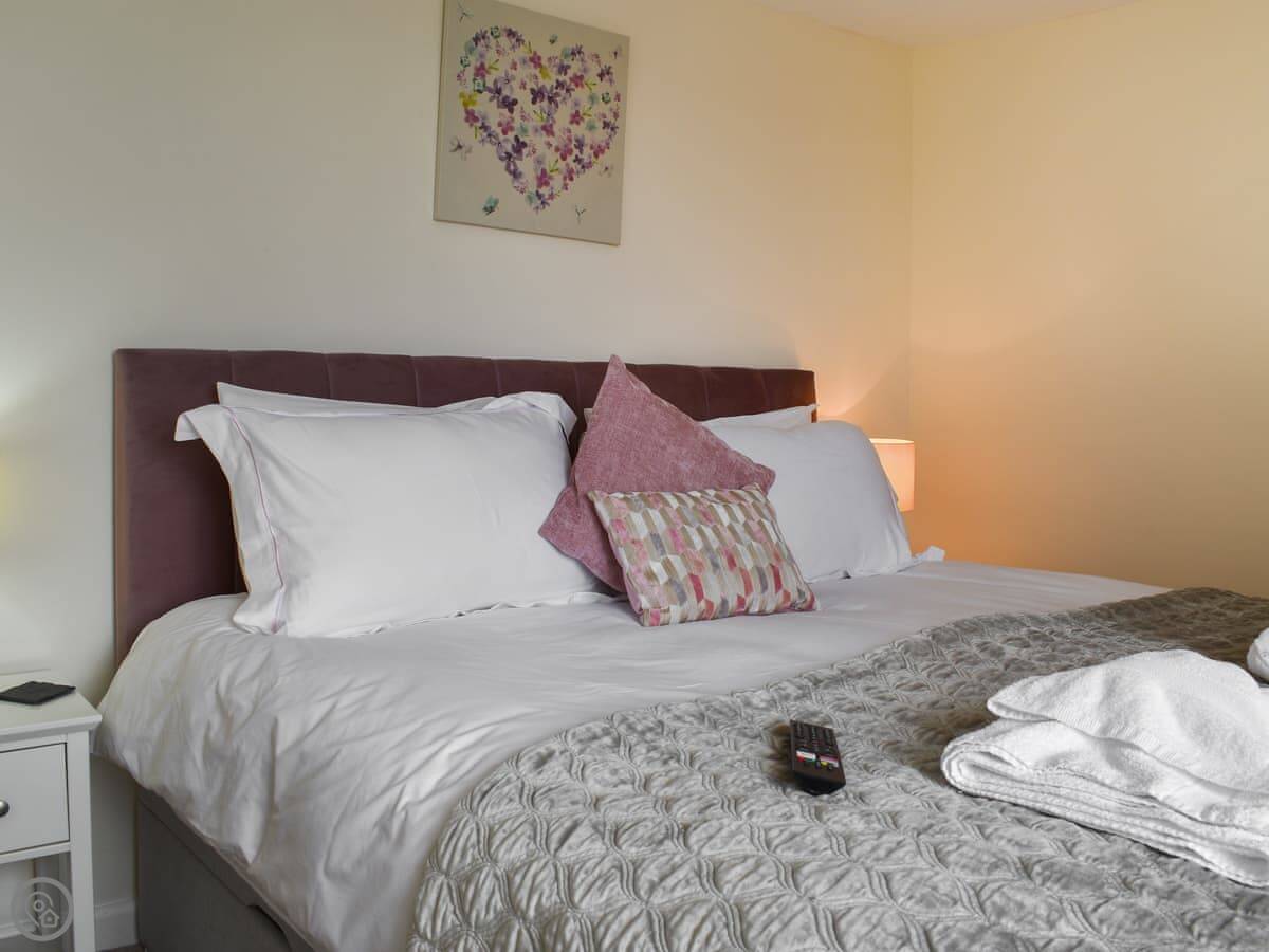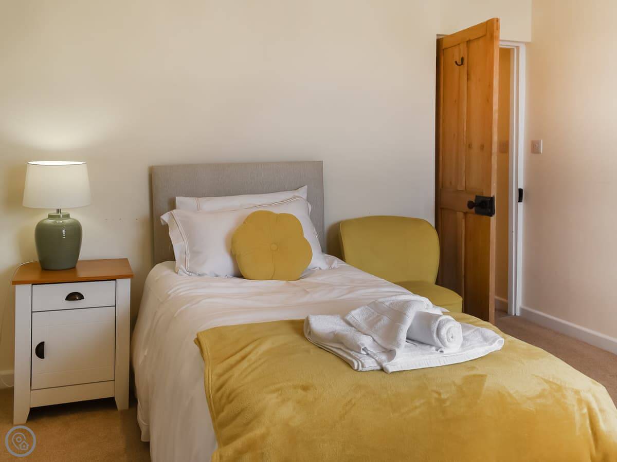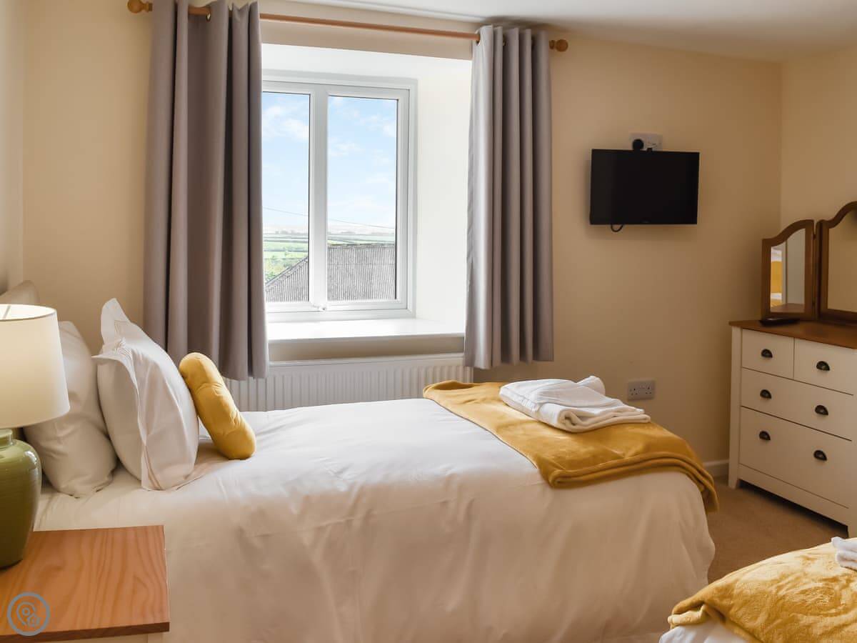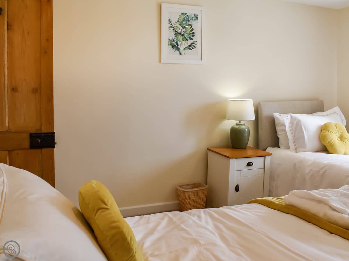 The cottage sleeps six. There are three bedrooms and three bathrooms, which is handy. They all have TVs. One bedroom is on the ground floor, which is next to the bathroom with a shower. Upstairs, the main bedroom has a super king bed and an en-suite with a bath and a shower. The other upstairs room has twin beds and its own bathroom with a bath too.
