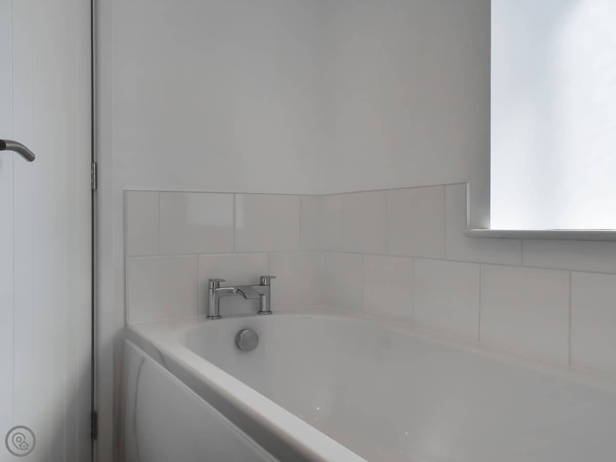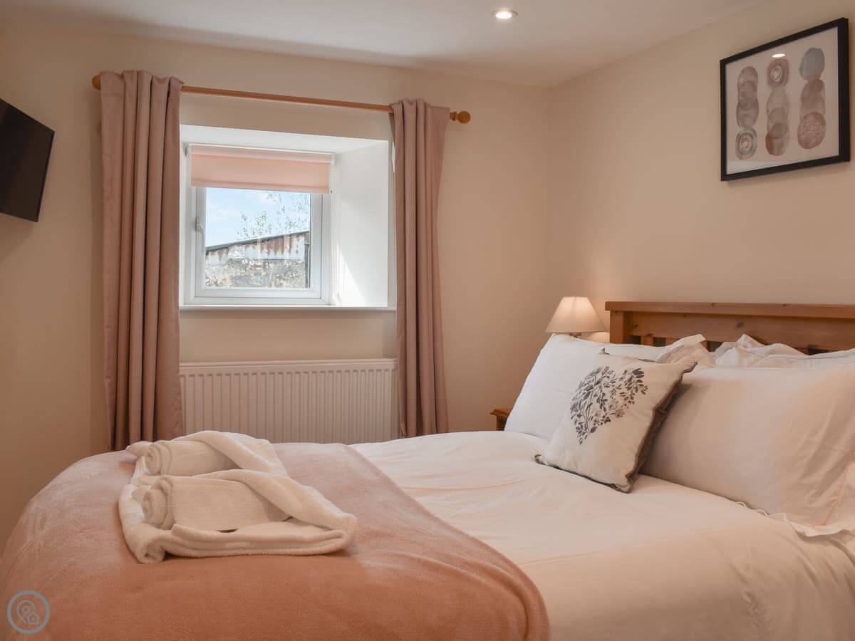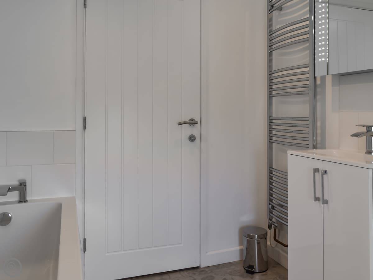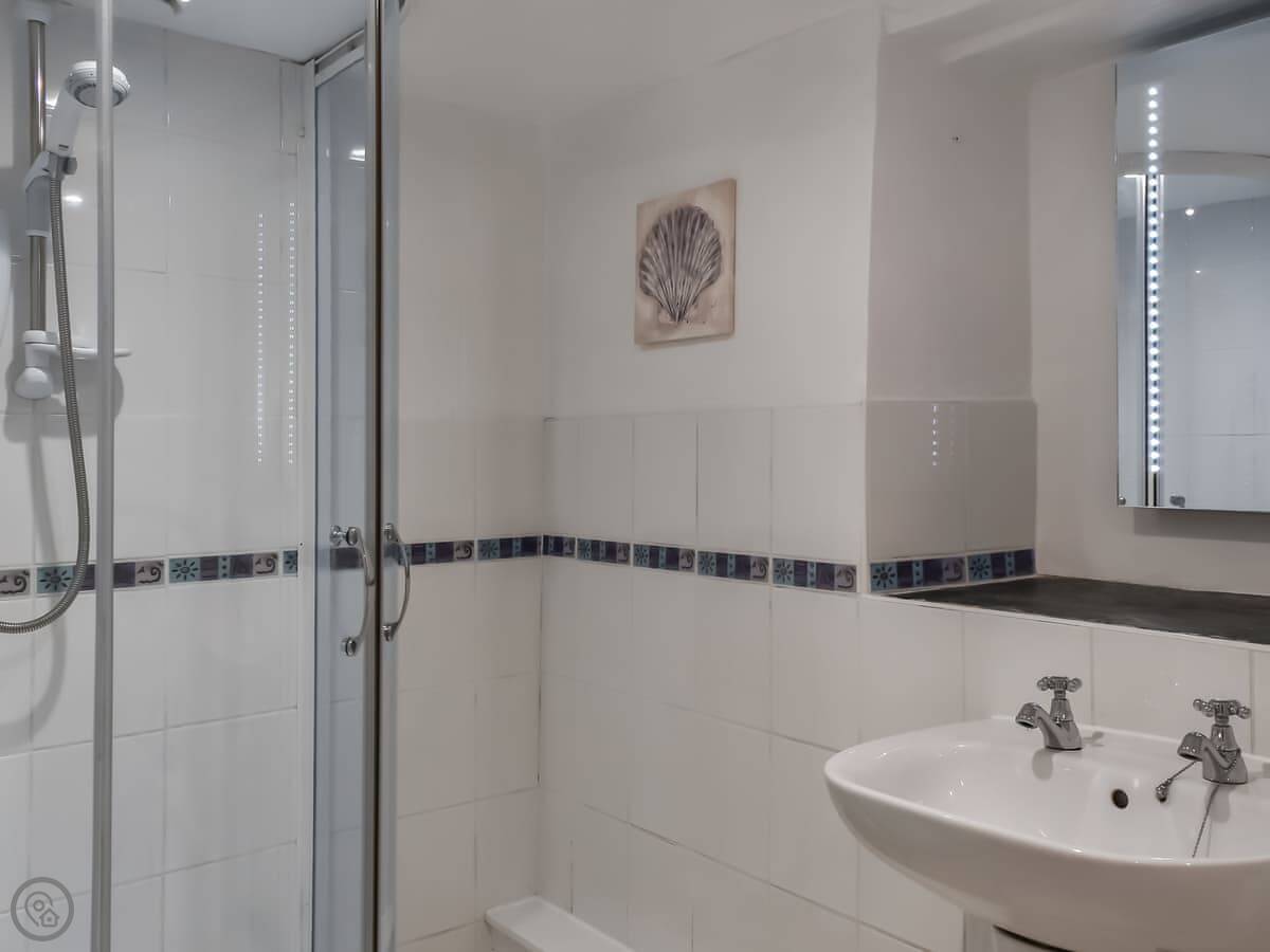 The cottage sleeps six. There are three bedrooms and three bathrooms, which is handy. They all have TVs. One bedroom is on the ground floor, which is next to the bathroom with a shower. Upstairs, the main bedroom has a super king bed and an en-suite with a bath and a shower. The other upstairs room has twin beds and its own bathroom with a bath too.