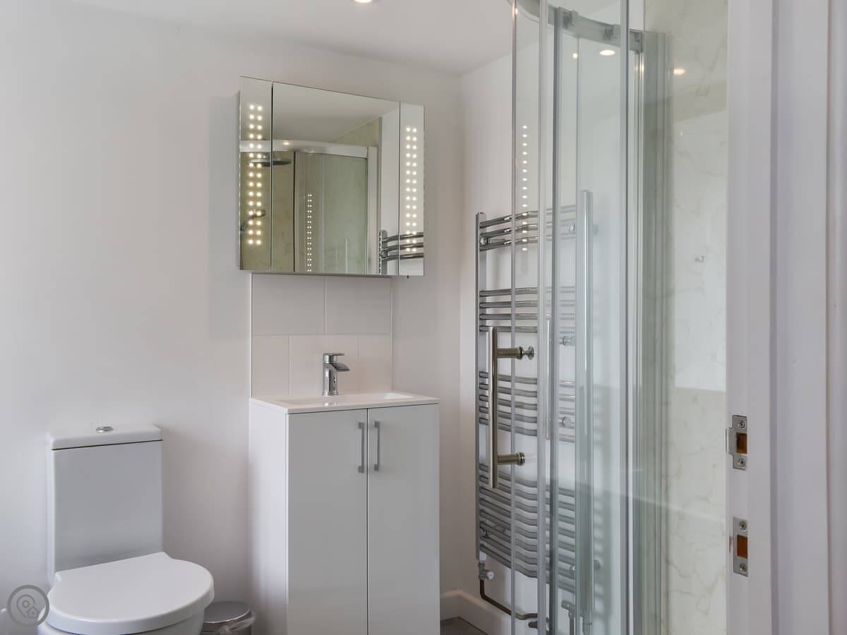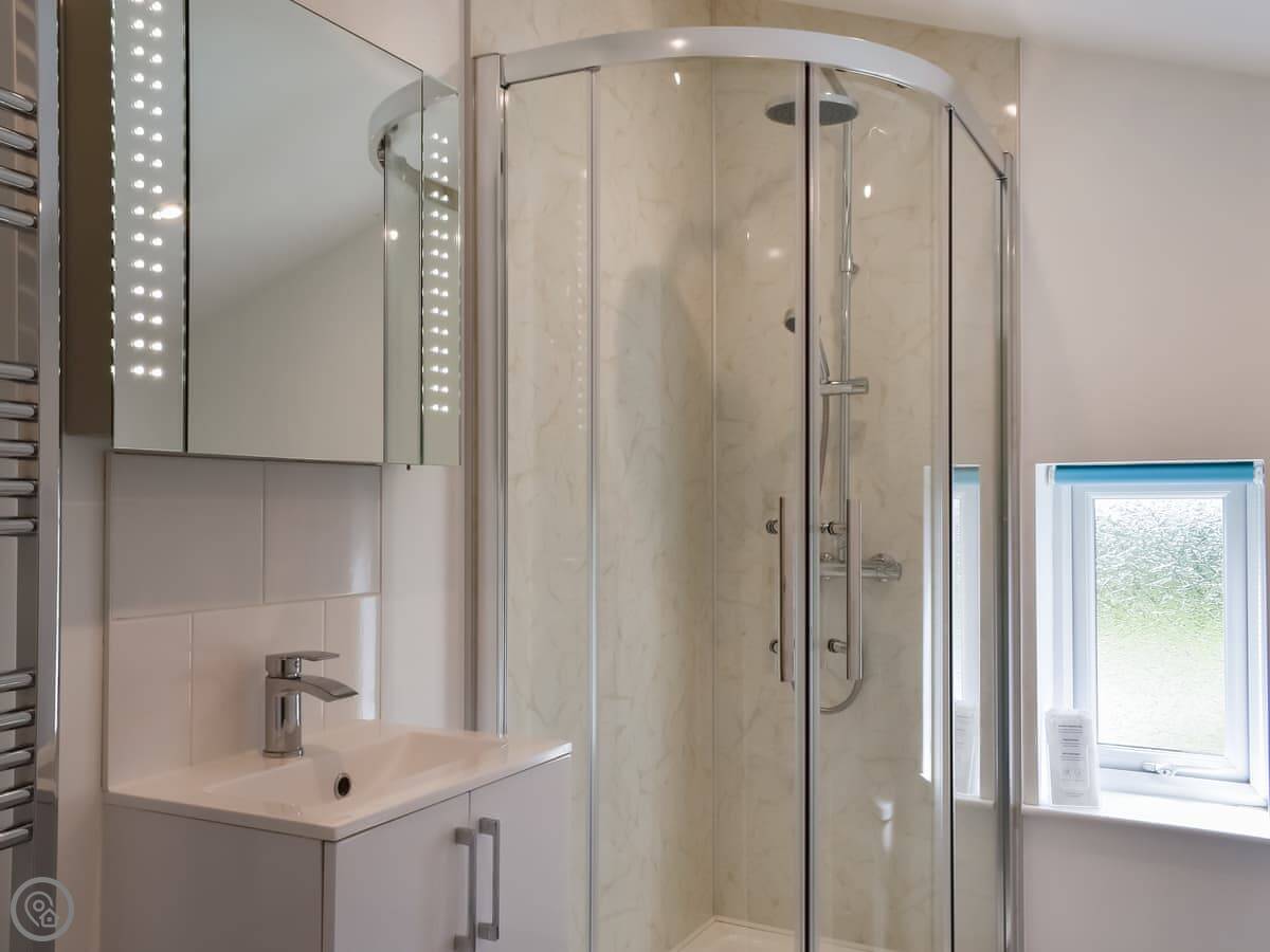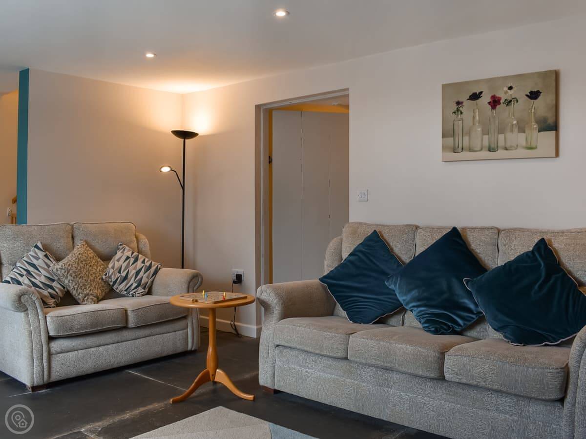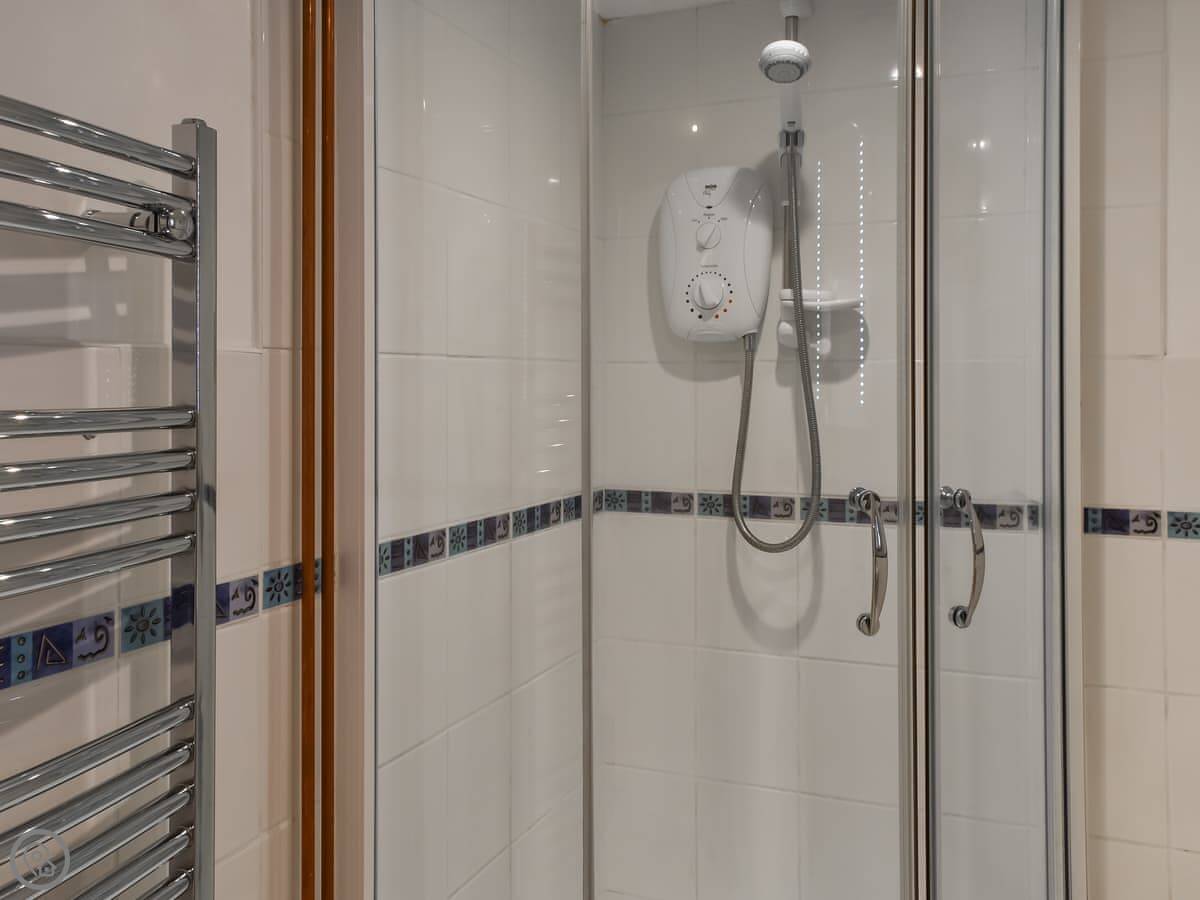 The cottage sleeps six. There are three bedrooms and three bathrooms, which is handy. They all have TVs. One bedroom is on the ground floor, which is next to the bathroom with a shower. Upstairs, the main bedroom has a super king bed and an en-suite with a bath and a shower. The other upstairs room has twin beds and its own bathroom with a bath too.