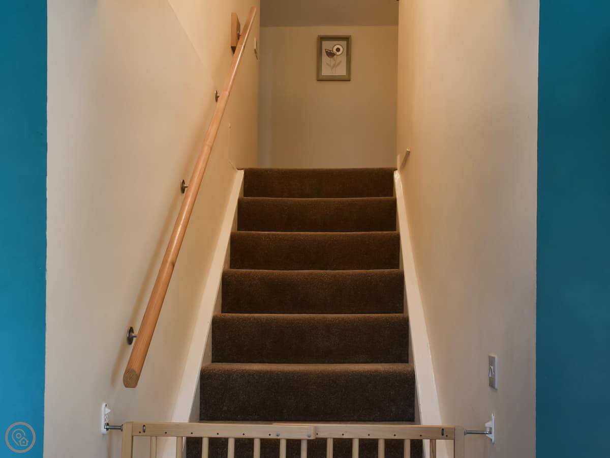 Inside, it's all open plan downstairs. There's a wood burner, which we supply some logs for. The floors are the original stone, so it can feel a bit cool underfoot. The stairs are the typical cottage kind, a bit steeper than modern ones.