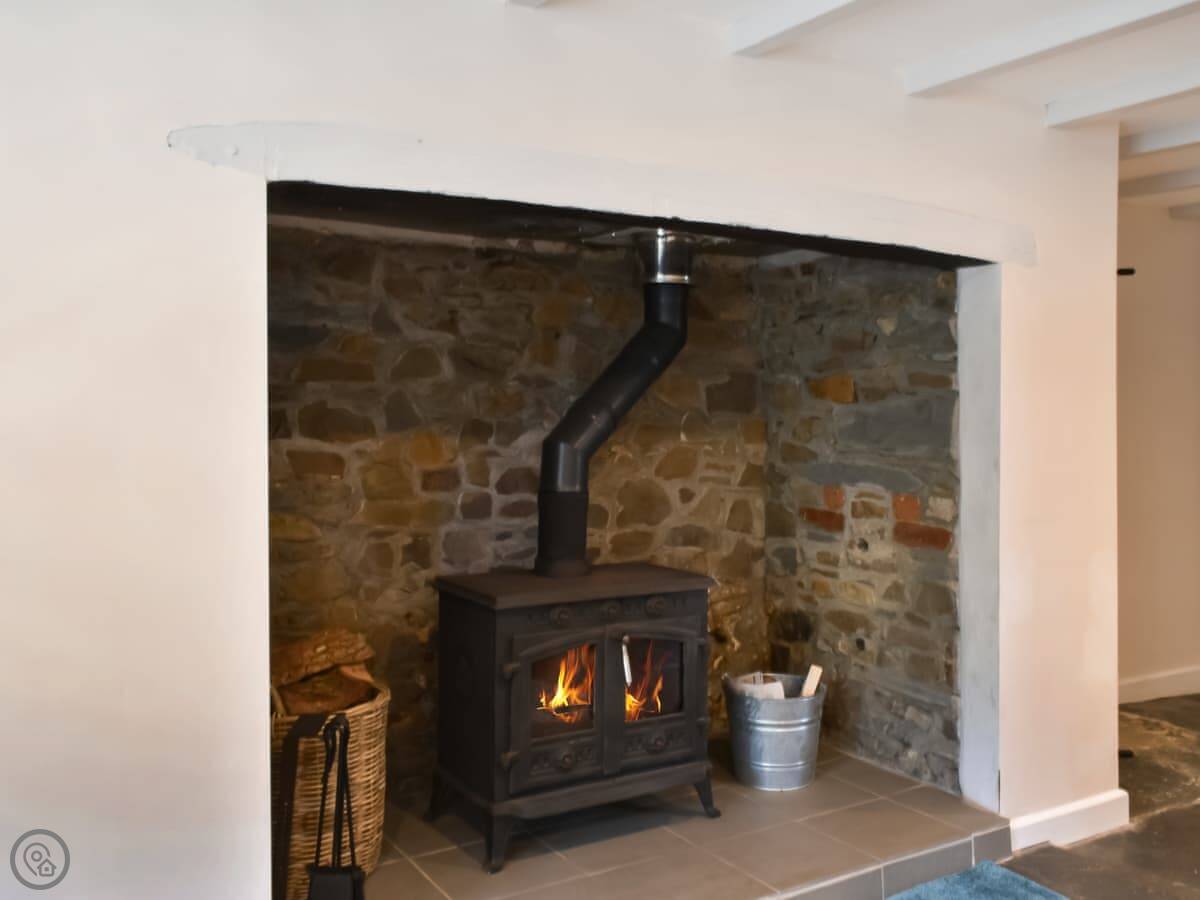 The decor is simple. It's a four-star place, which means it’s got what you need and it's kept clean and tidy. There's a wood burner in the living room, and the original fireplace is still there with an old clome oven. The kitchen has a dishwasher, washing machine, that sort of thing. Bedding and towels are included.