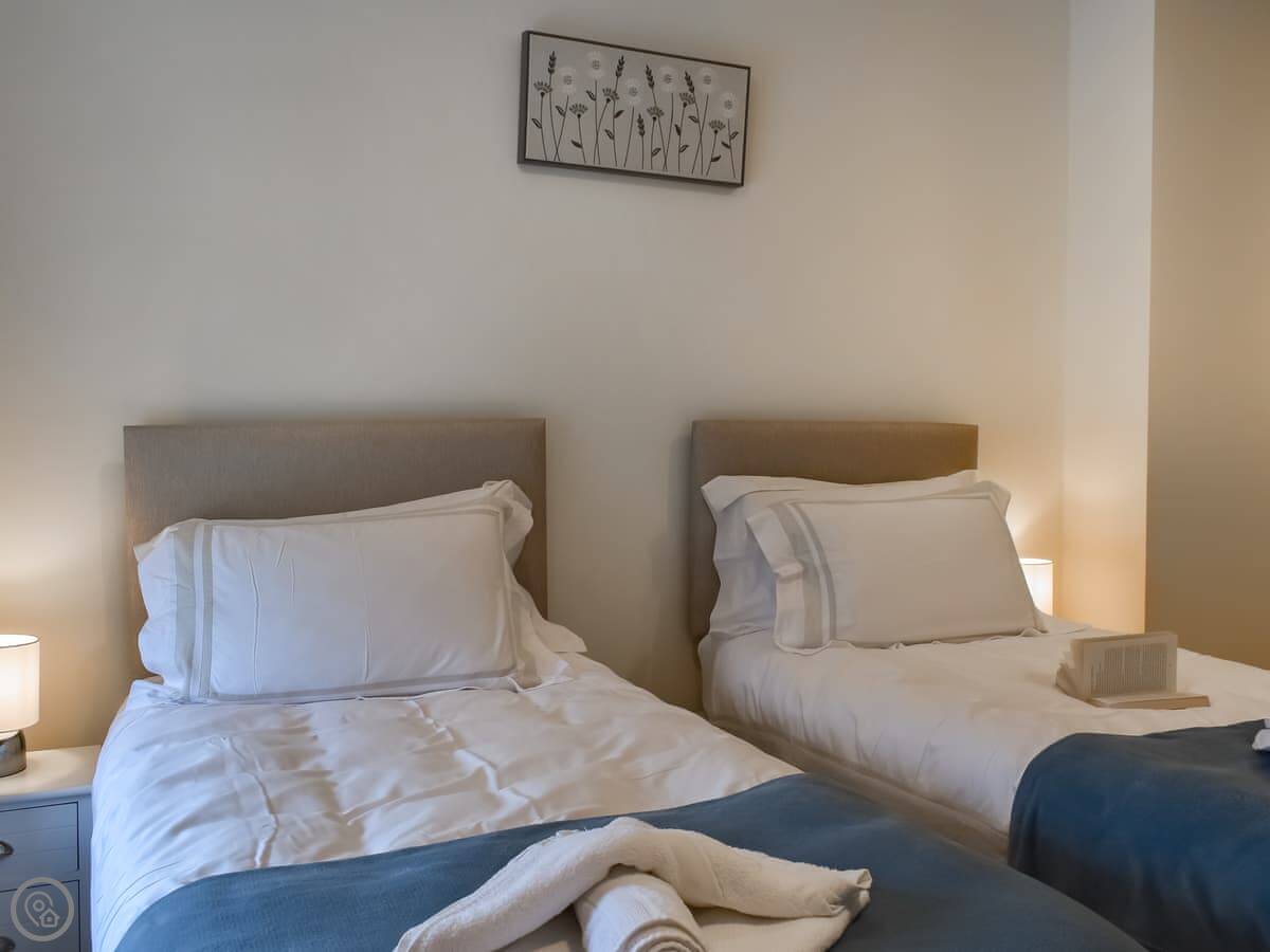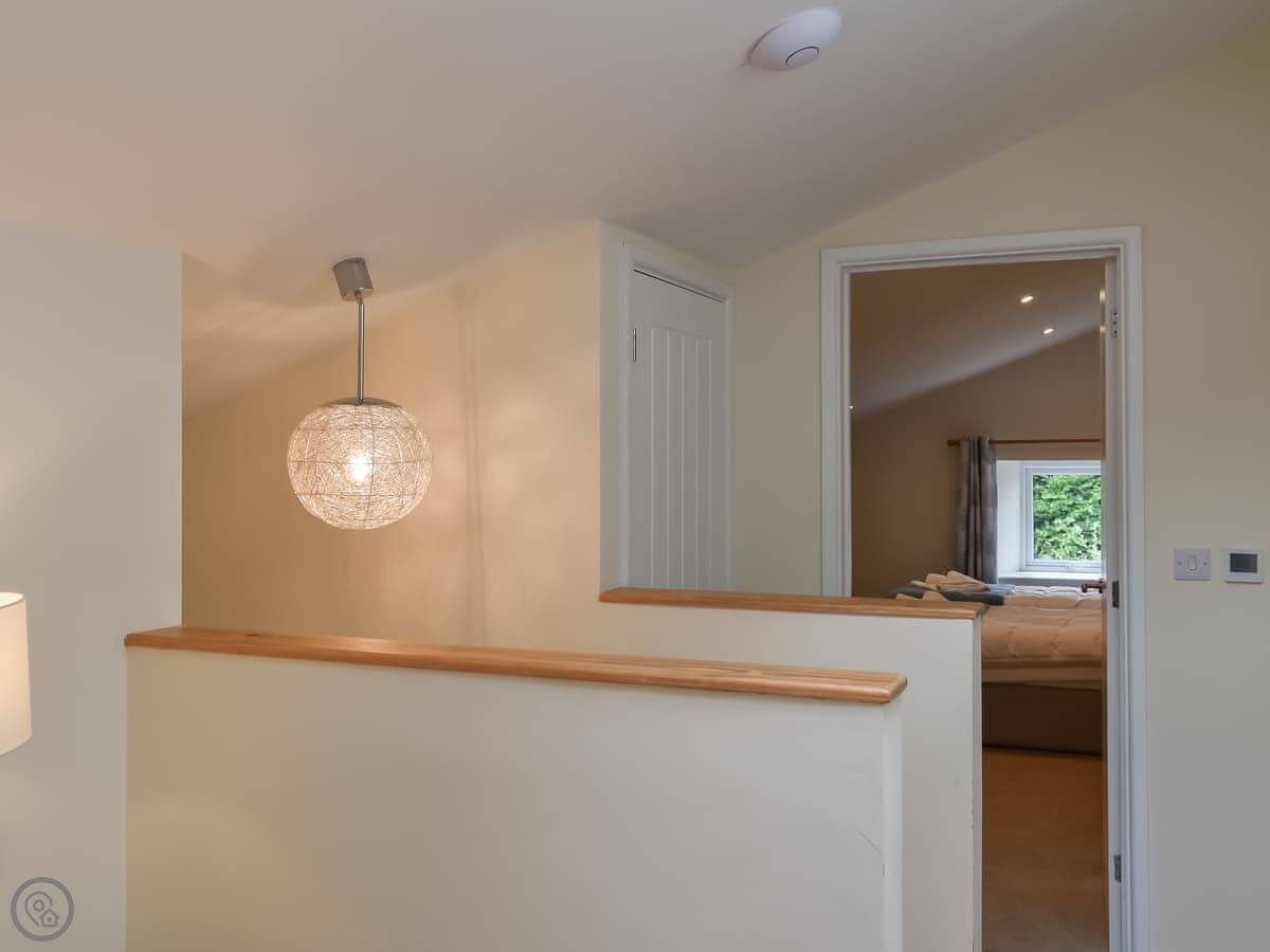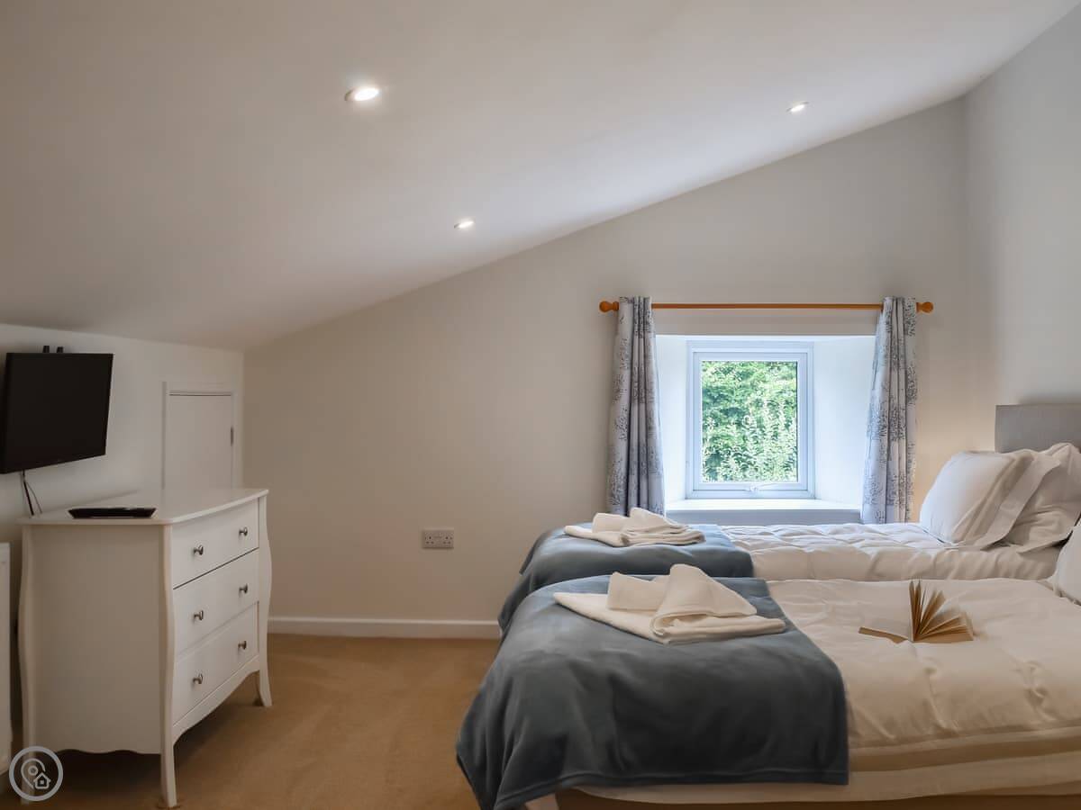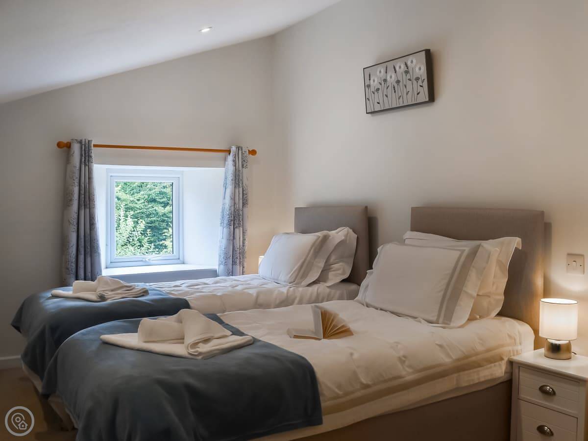 It sleeps four. Two bedrooms, both upstairs. The master has a king-size bed and its own shower room. The other bedroom has twin beds and they use the second bathroom, which is downstairs. The stairs are quite steep and narrow, typical for a cottage this old.