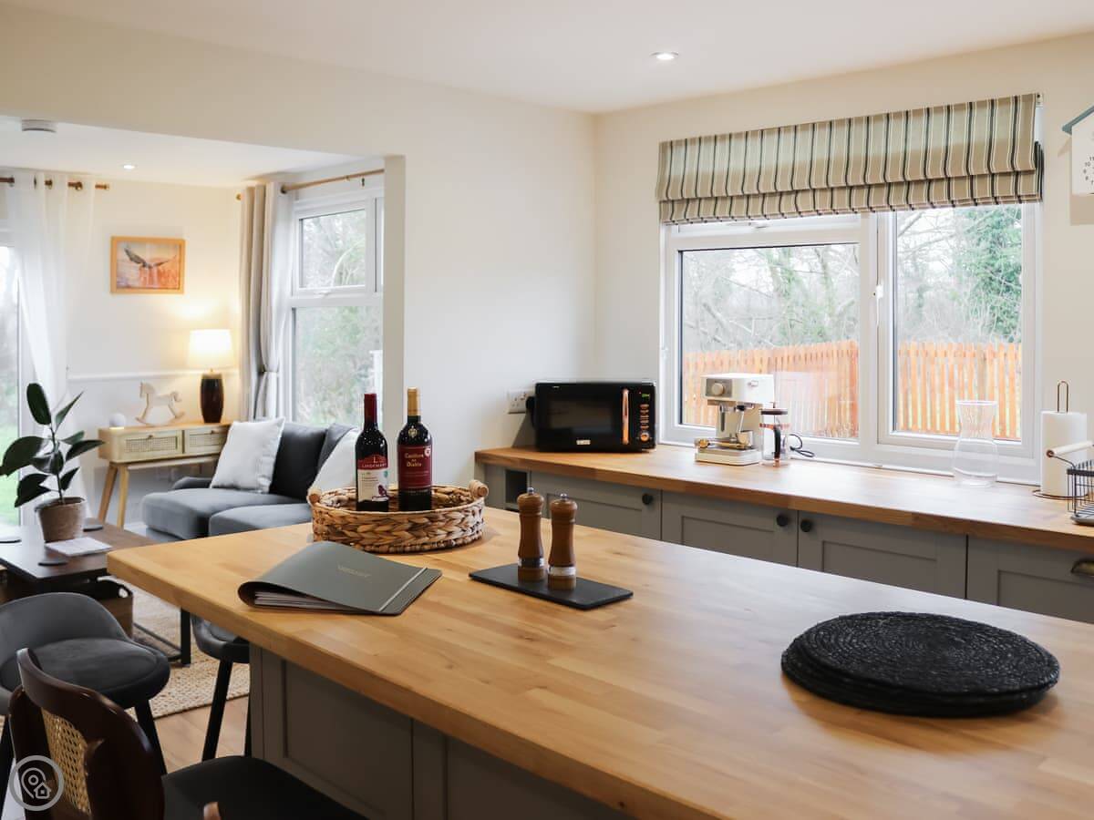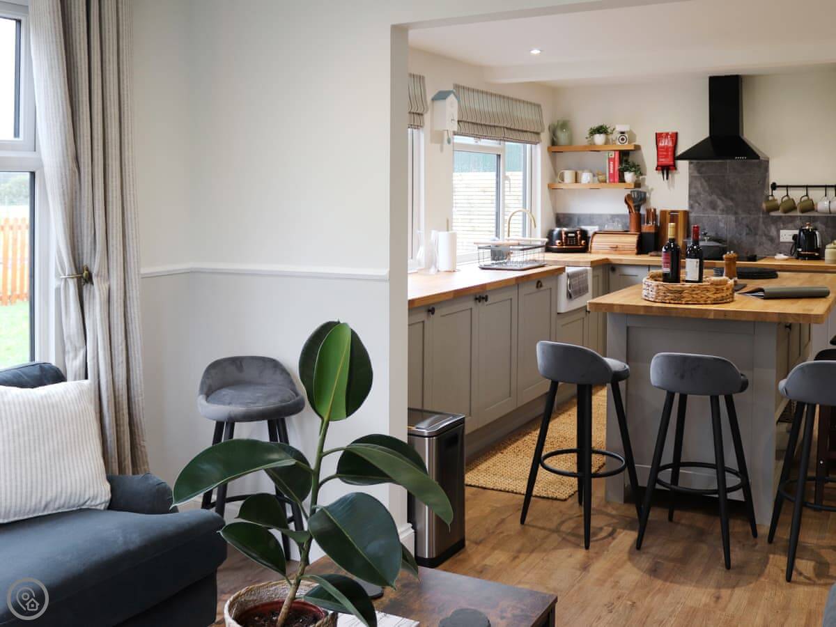 The main living area is open plan with the kitchen. There's a separate sunroom at the back, which is nice if someone wants to sit somewhere else. The kitchen has a dishwasher and a washing machine. Bedding and towels are included. There's a cot and a highchair if you need them.