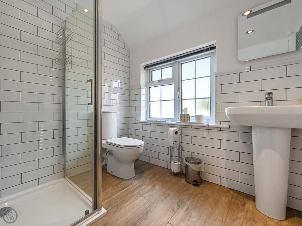 It sleeps eight. Four bedrooms, three bathrooms. One bathroom is on the ground floor. It's got a 4 Star rating, so it's well-equipped and comfortable. The stairs are fine, normal house stairs.