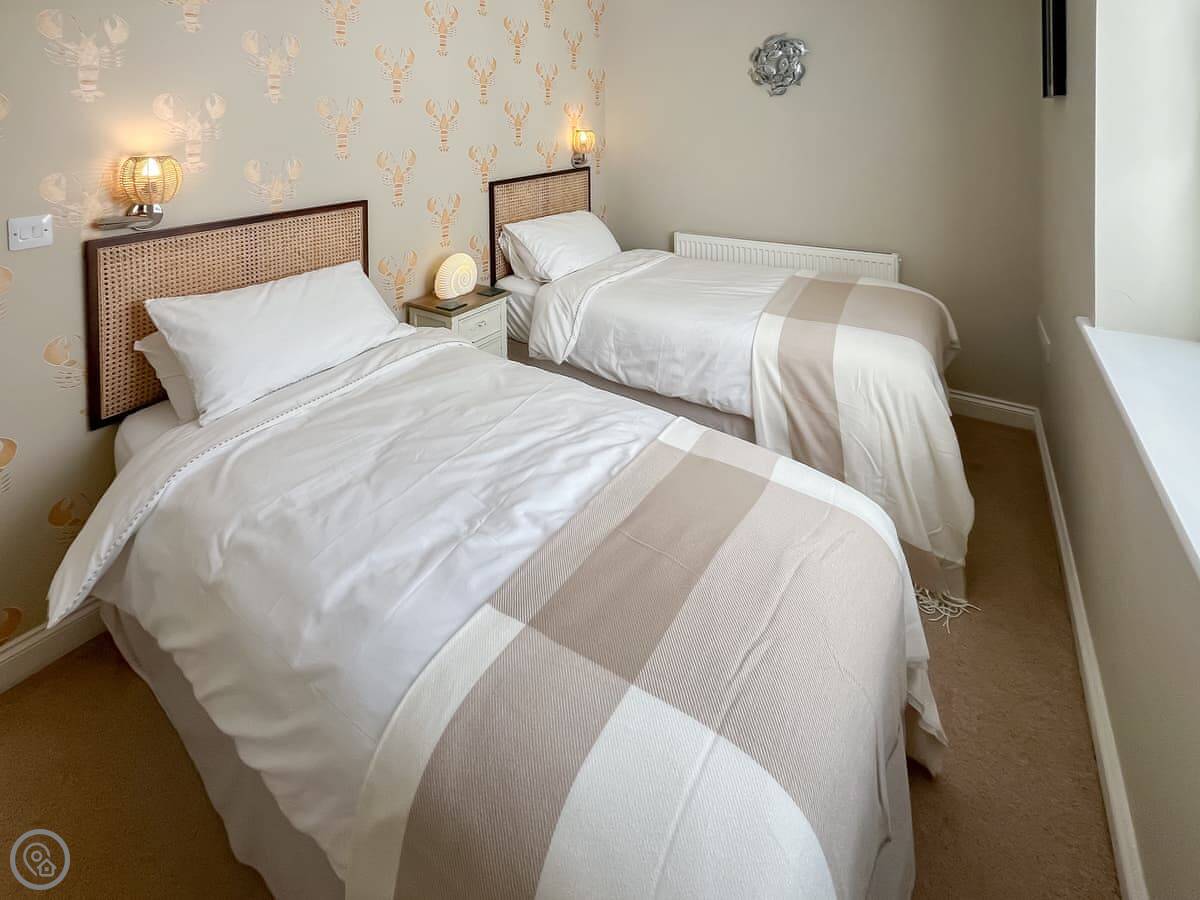 It sleeps four. Two bedrooms: one double, one with two singles. One bathroom with a shower over the bath. It's got a Four Star rating, so it's comfortable, not basic. The kitchen is part of the living area. It has a dishwasher and a washing machine.