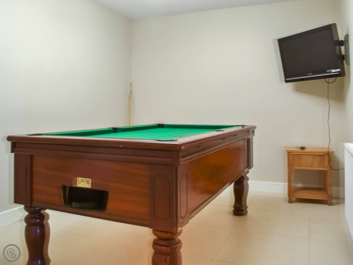 It's got three floors. The stairs are typical for an older property. There's a living room with doors out to a small balcony. Downstairs there's a snug and a games room with a pool table. The dining table seats everyone.