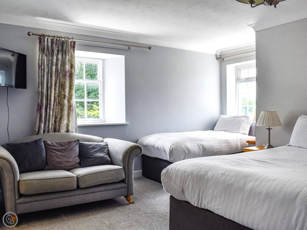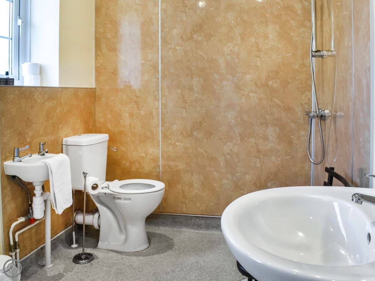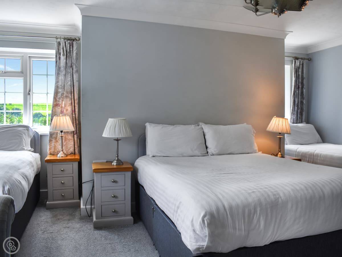 On the ground floor there's a double bedroom and a wet room shower, which is useful if someone doesn't want to use the stairs. Upstairs, most of the bedrooms are. One is a family room with a king-size bed and two singles, and it has its own shower. The other rooms are doubles, and one can be set up as twins if you prefer. The main family bathroom has a bath with a shower over it.